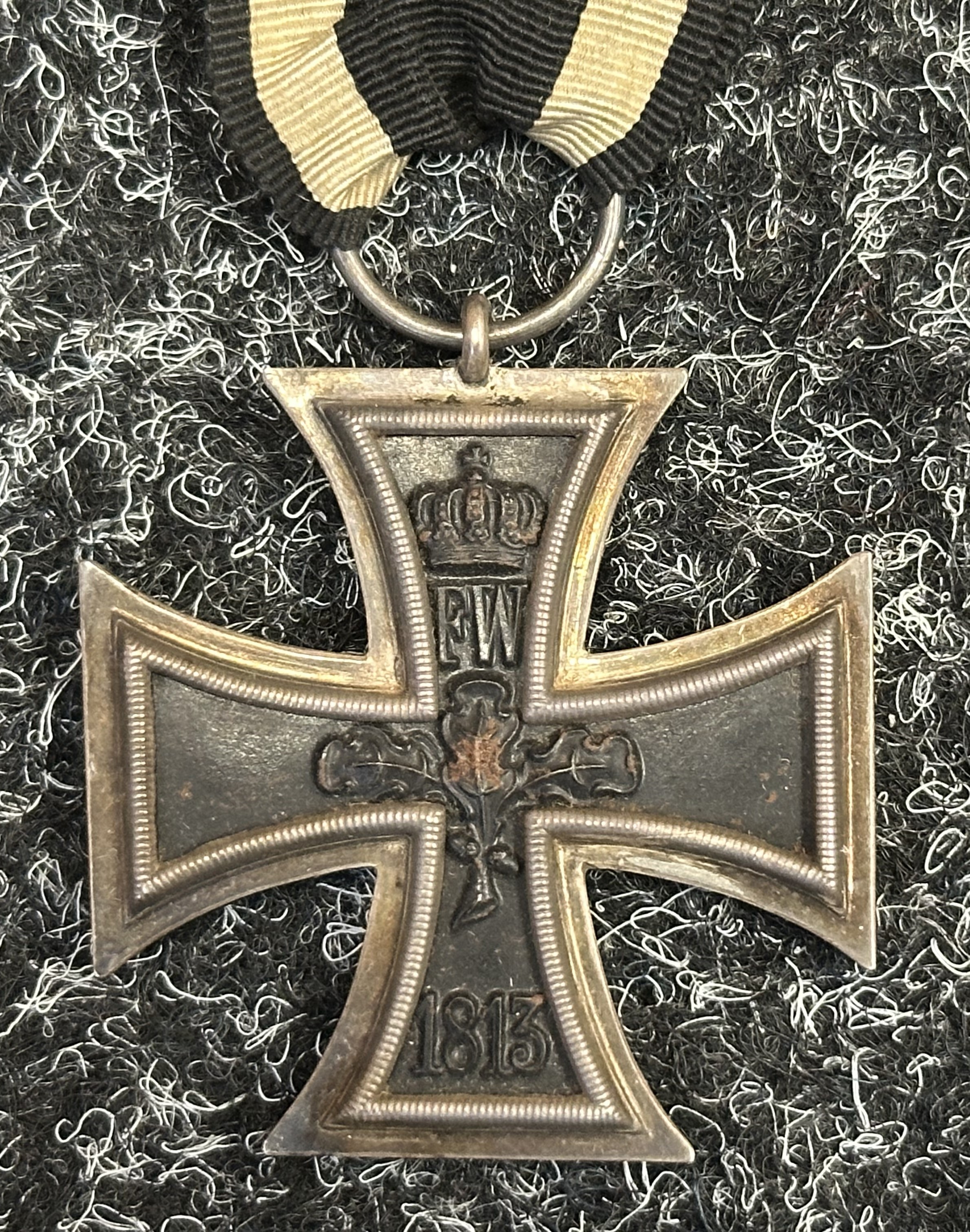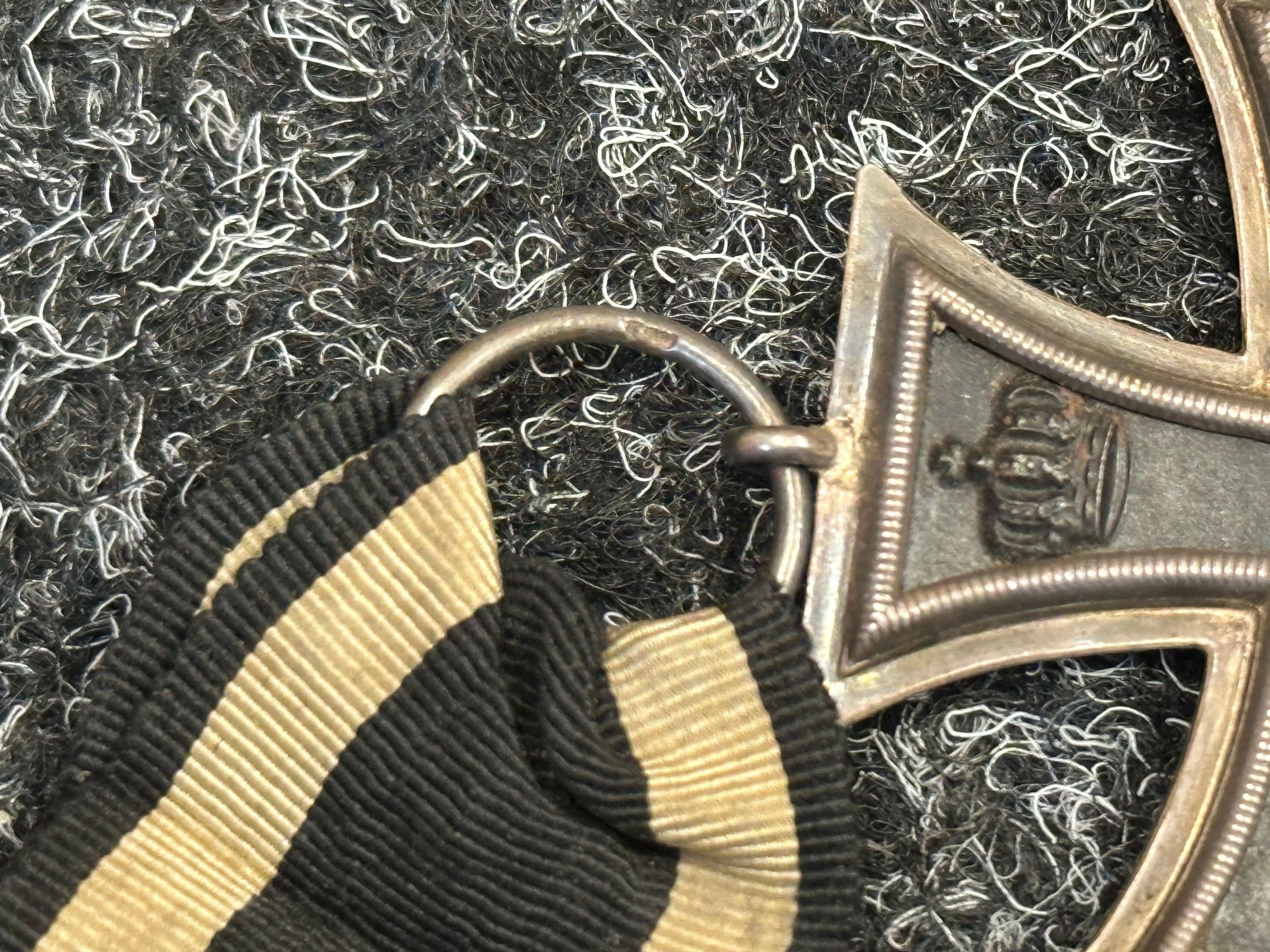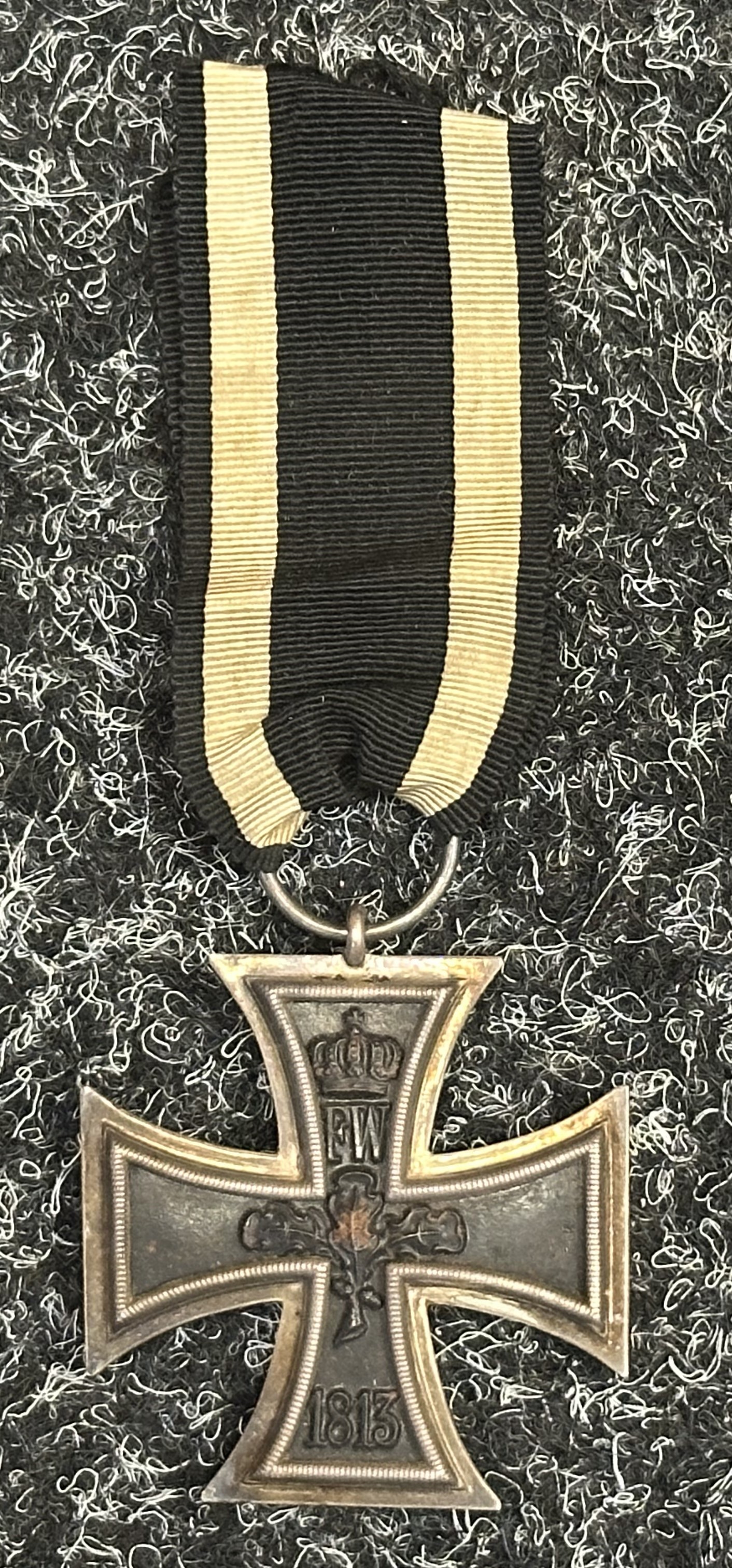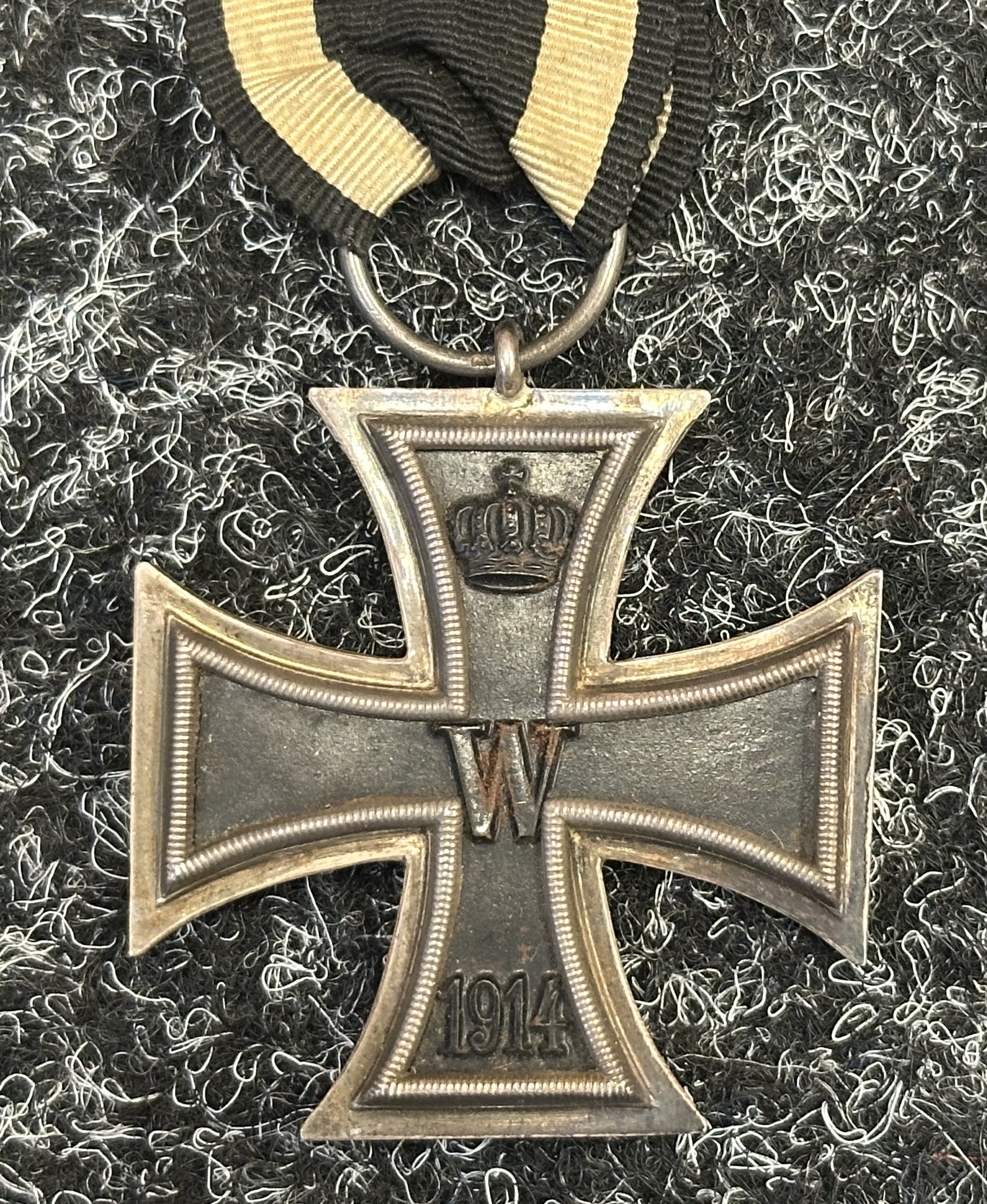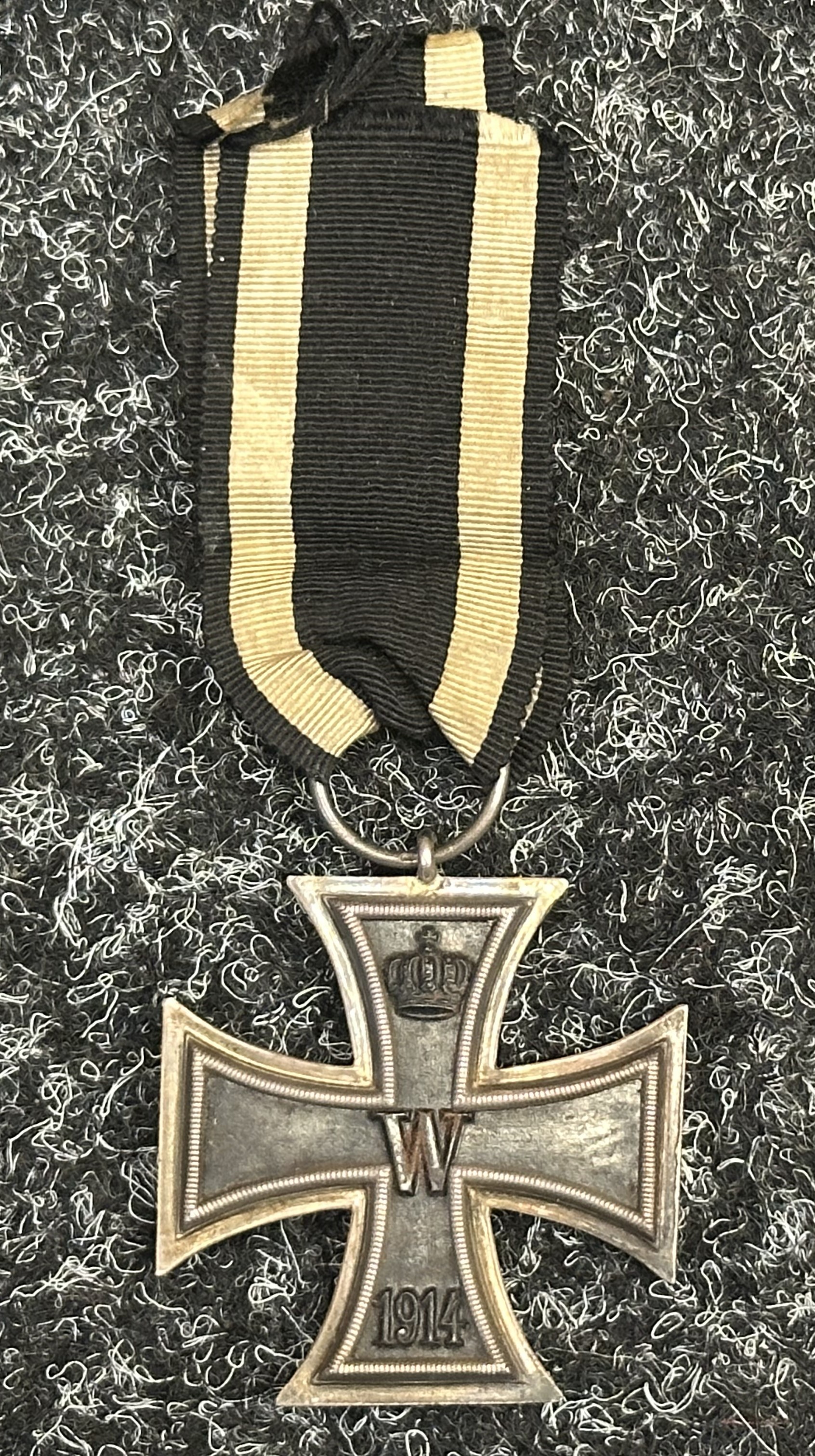 WW1 Imperial German Iron Cross 2nd Class 1914 complete with original ribbon. Maker marked to suspension ring "FW".