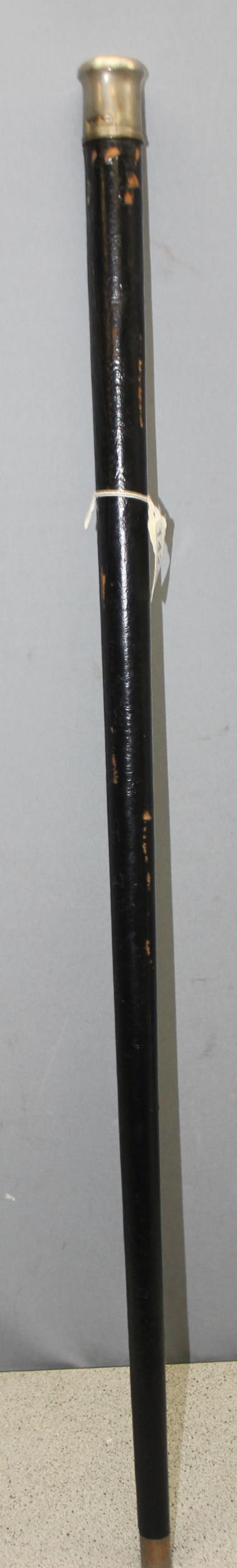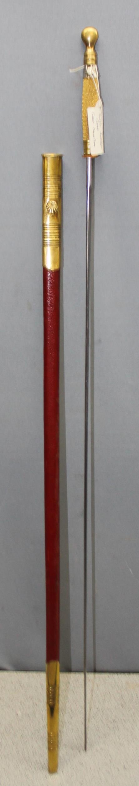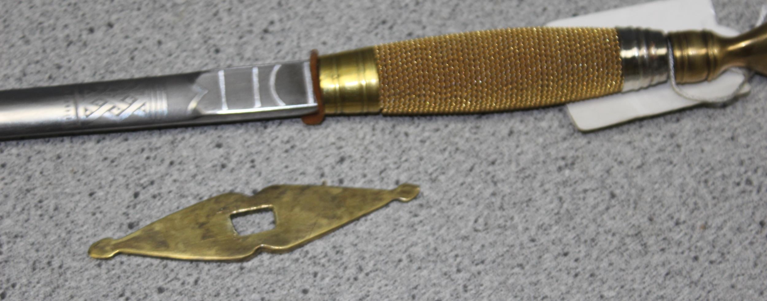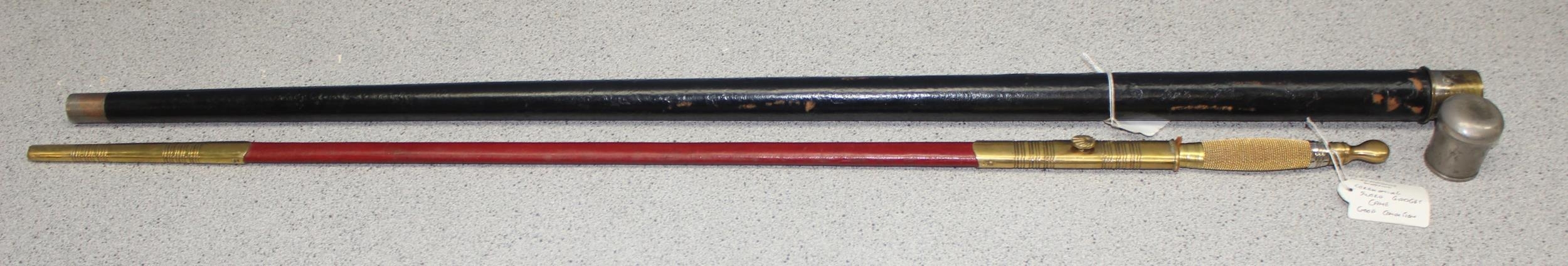 A tapering walking cane with hollow centre housing a deconstructed Masonic Sword with engraved decoration, approx 89cm