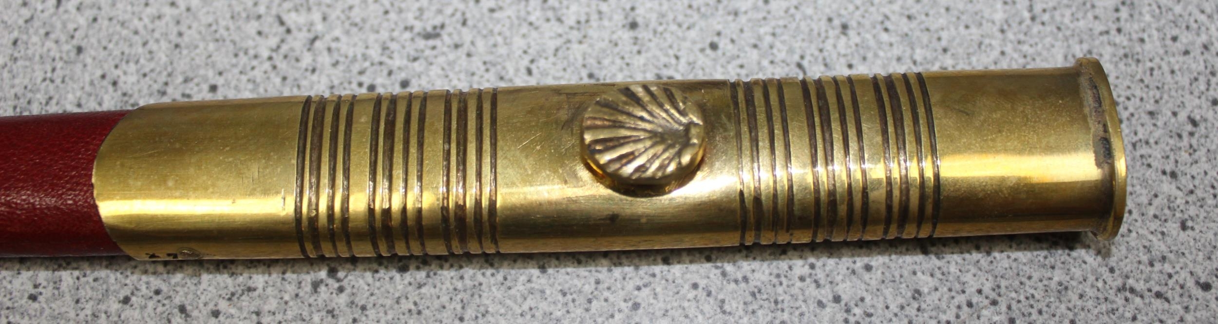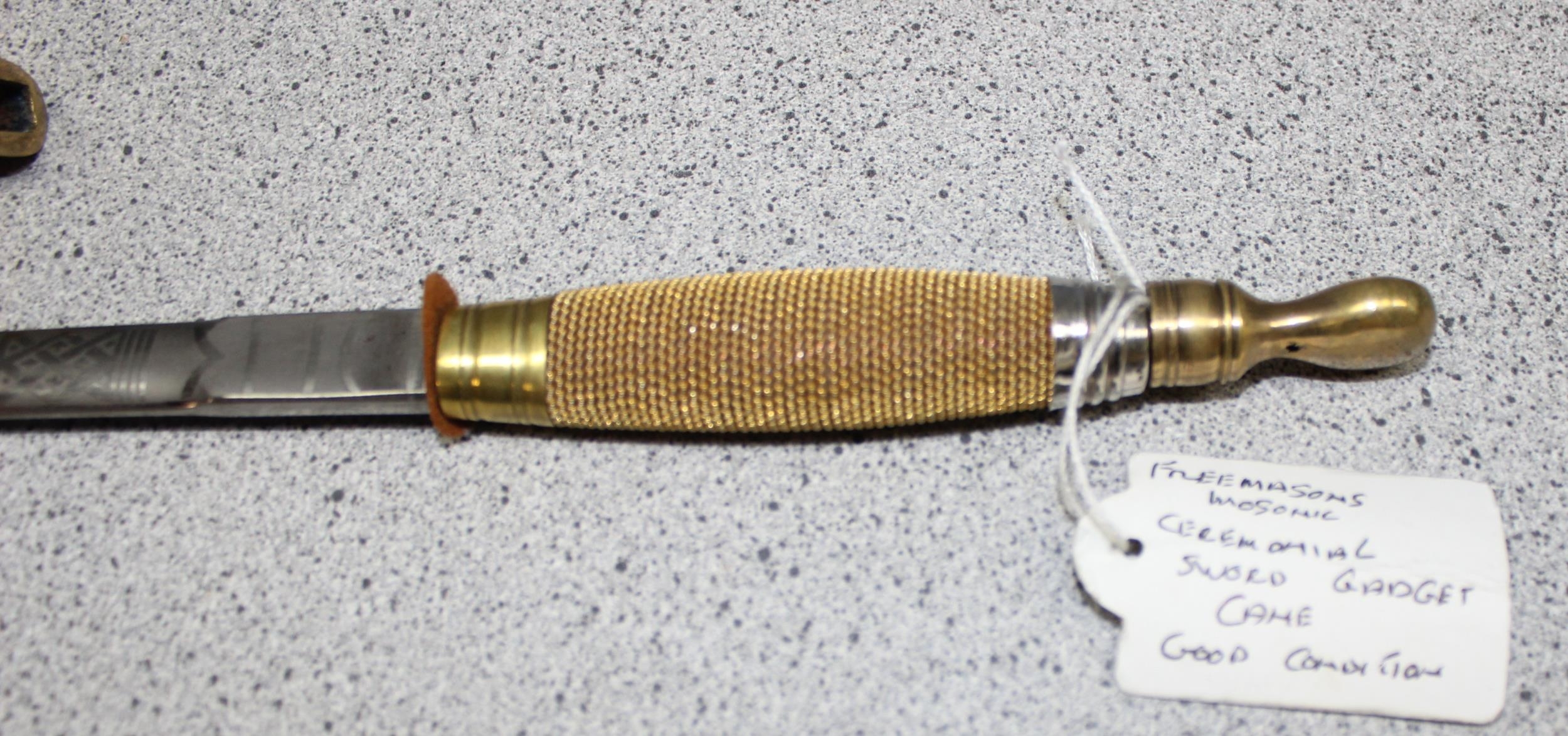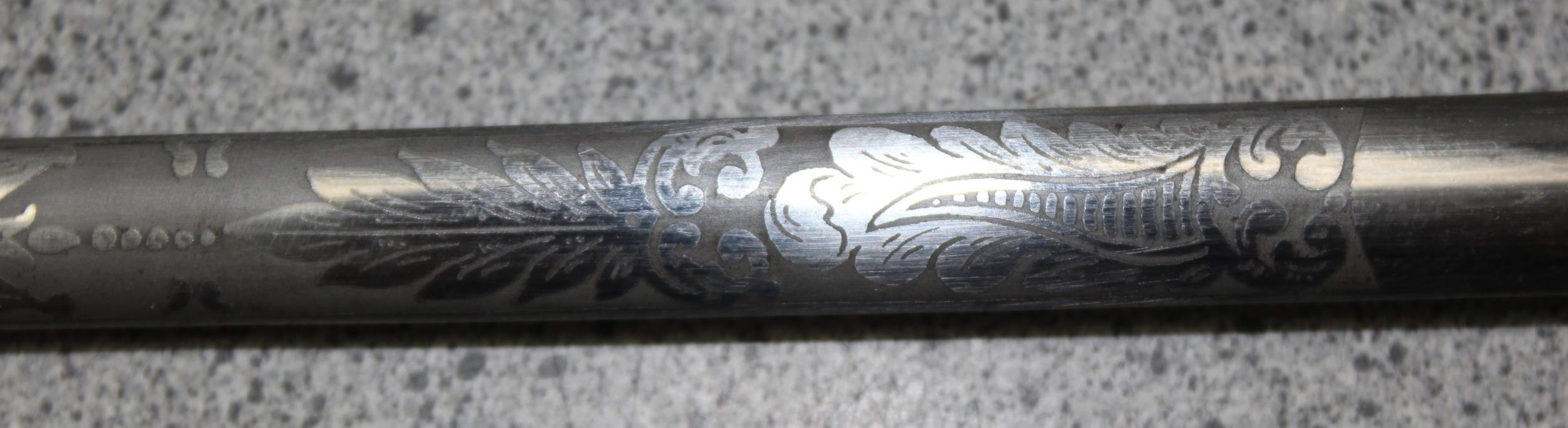 A tapering walking cane with hollow centre housing a deconstructed Masonic Sword with engraved decoration, approx 89cm