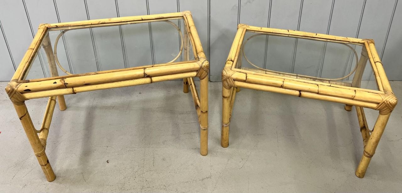 A pair of glass-topped, bamboo coffee tables. Dimensions(cm) H48/40, W65/58, D44/40.