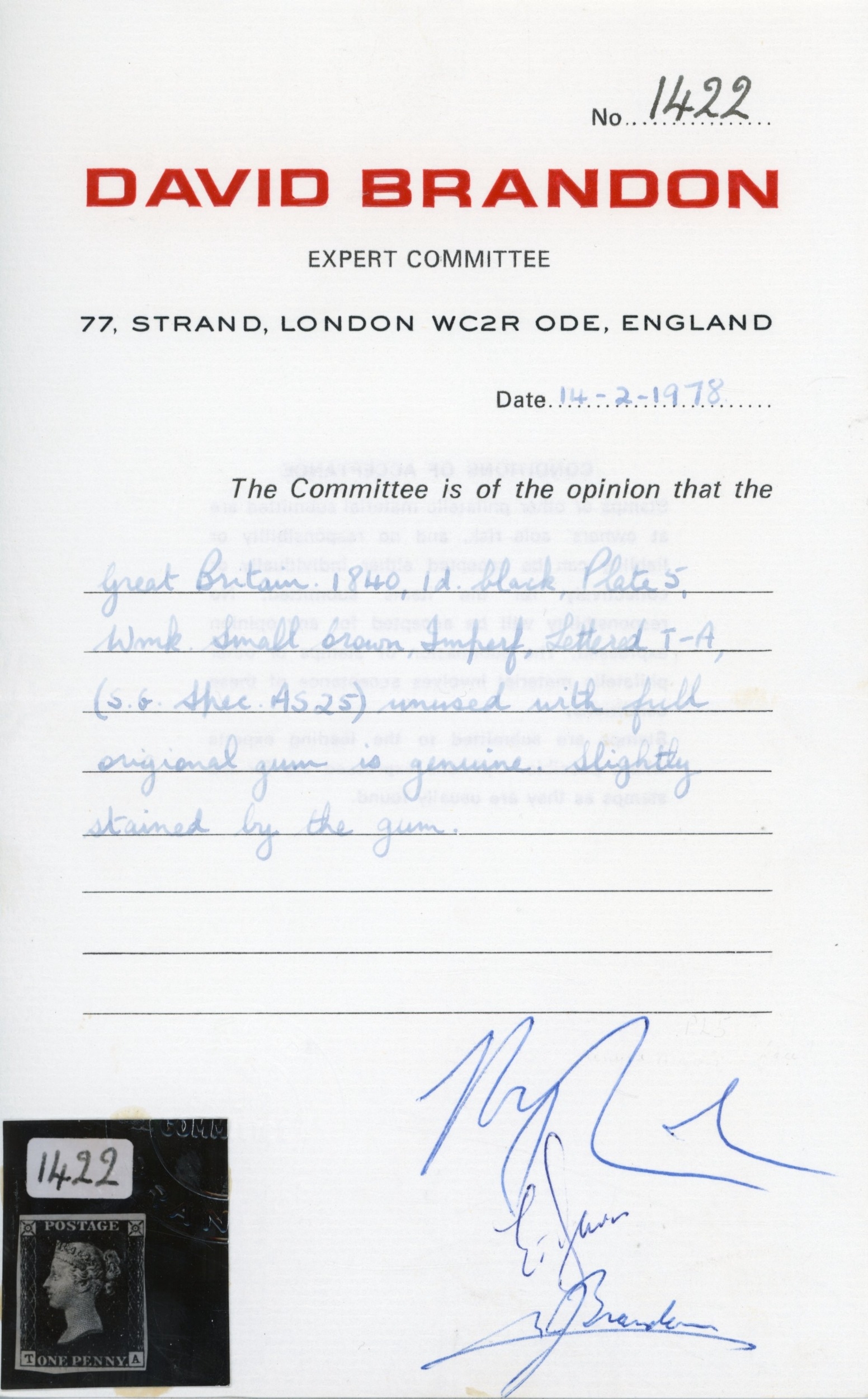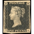 1840 1d black, Pl. 5 (TA), with four close to good margins, mint, unmounted o.g., some slight toning and usual gum bends, and a few black specks, mostly on the reverse, still a scarce and desirable item. Brandon cert (1978), SG 2, £7,500