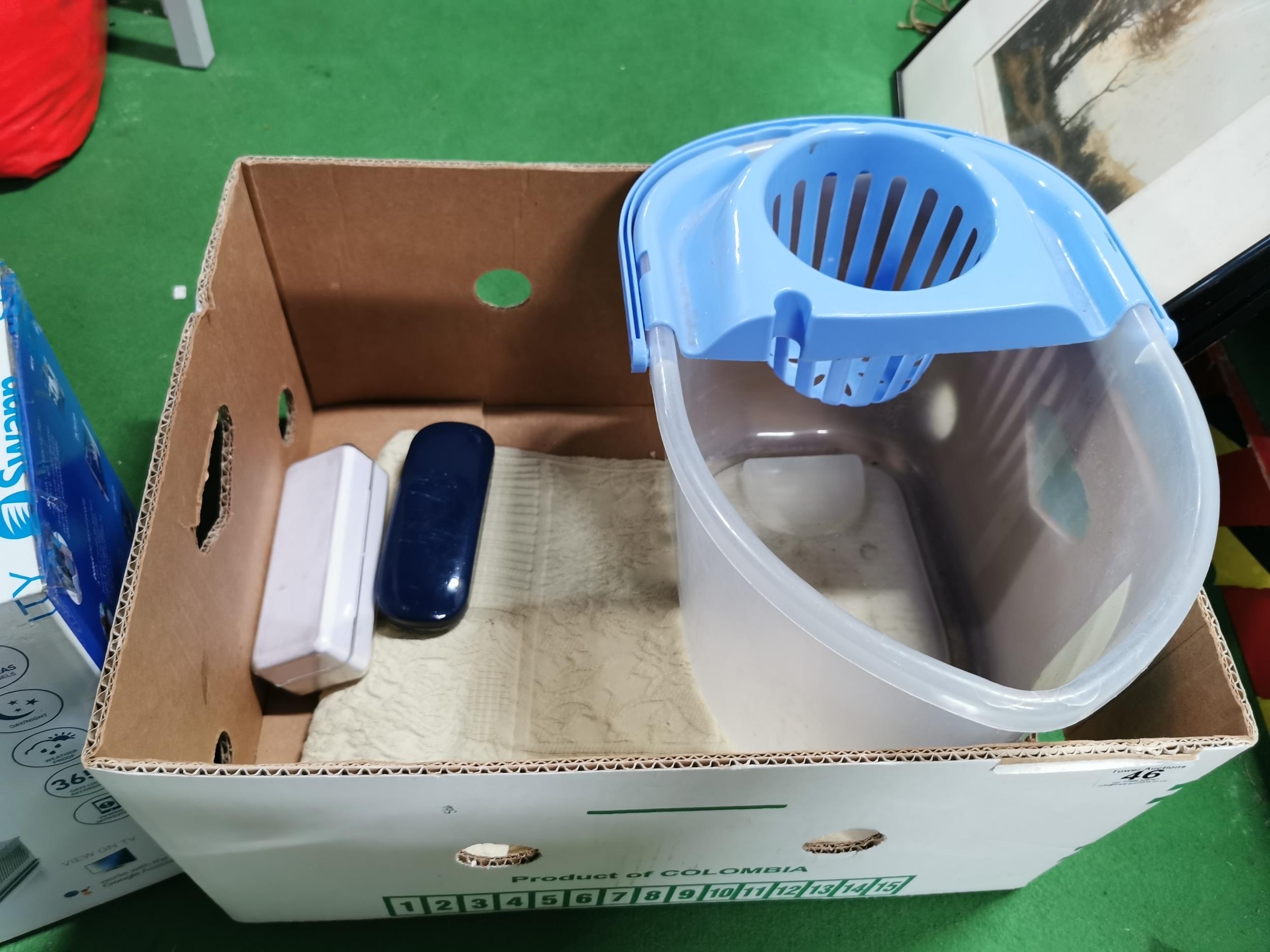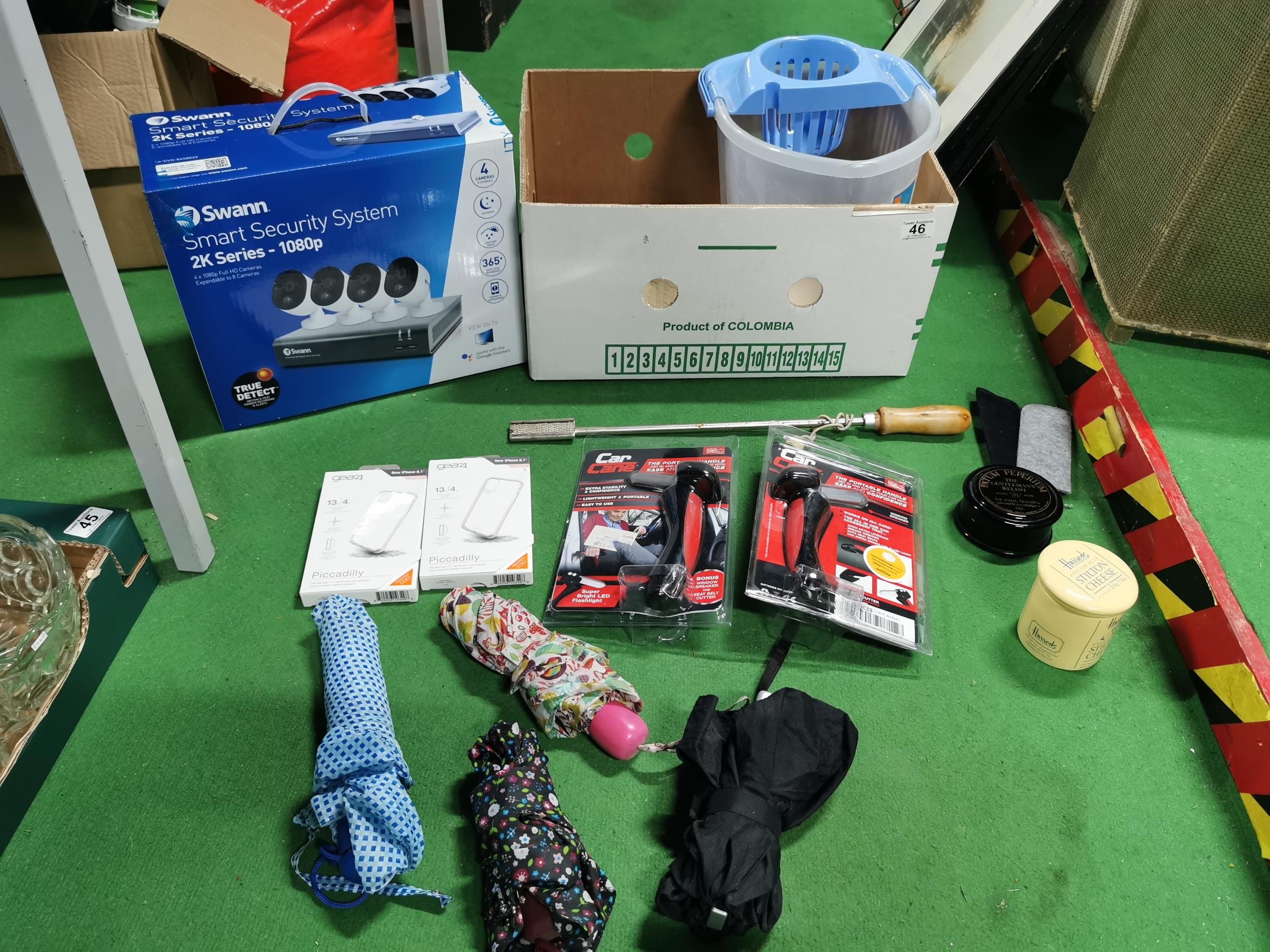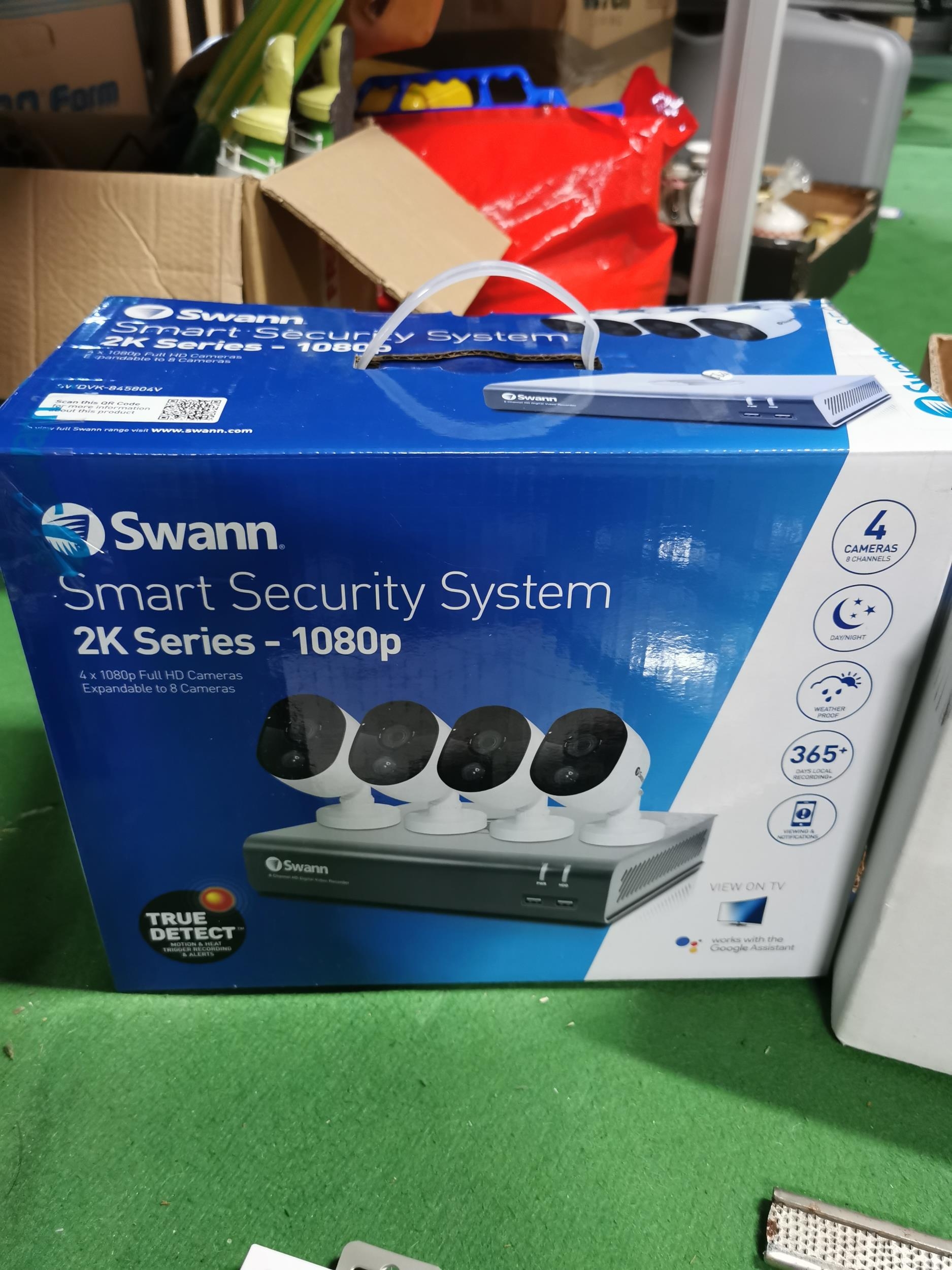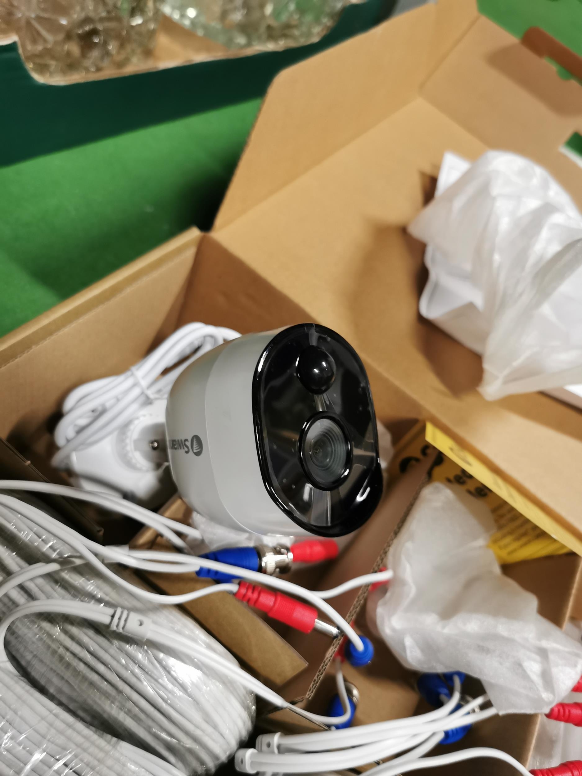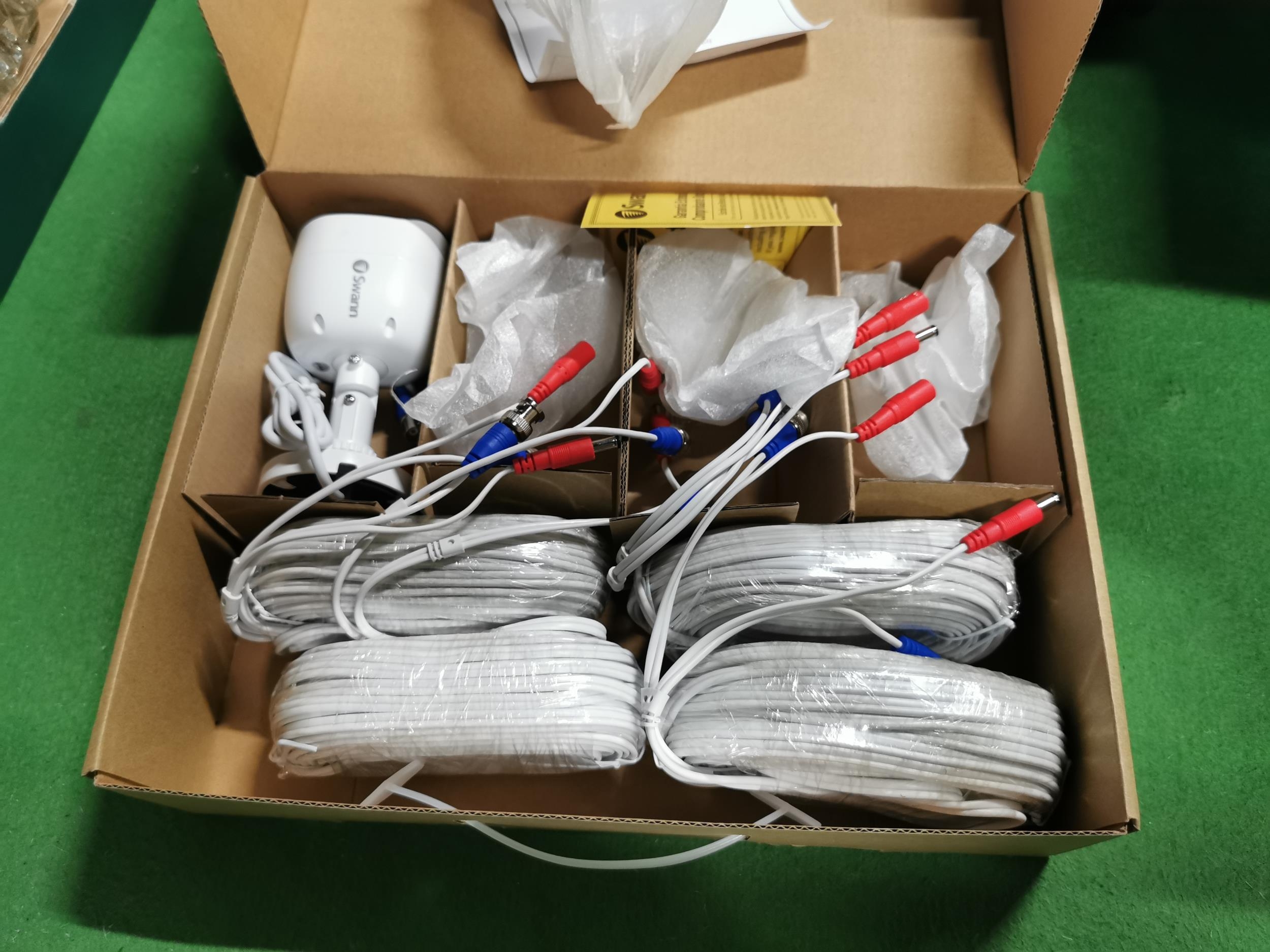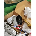 Box of odds inc new sealed items and a part boxed swan security system includes one camera and power cables only ( no recorder)