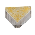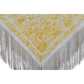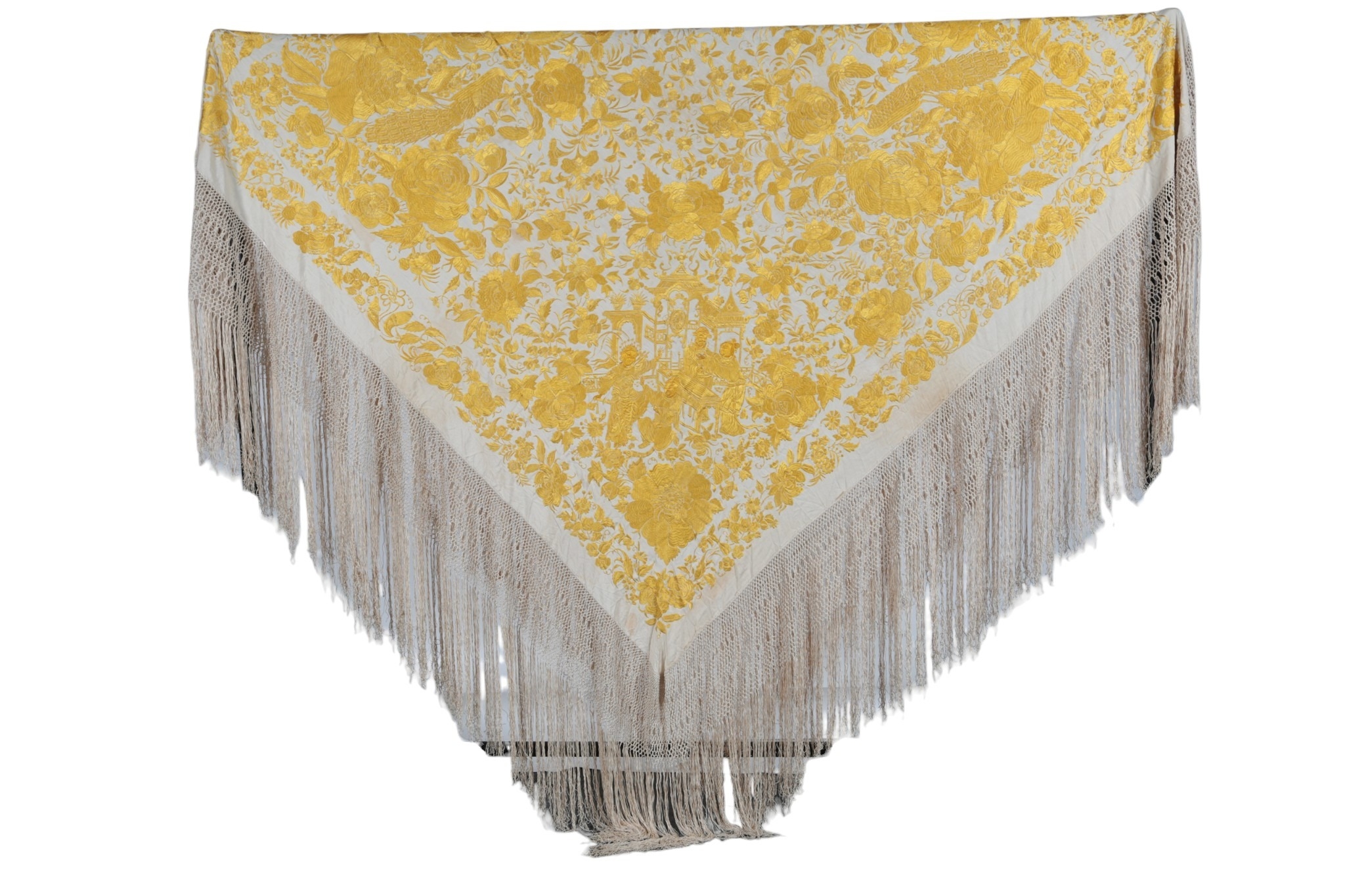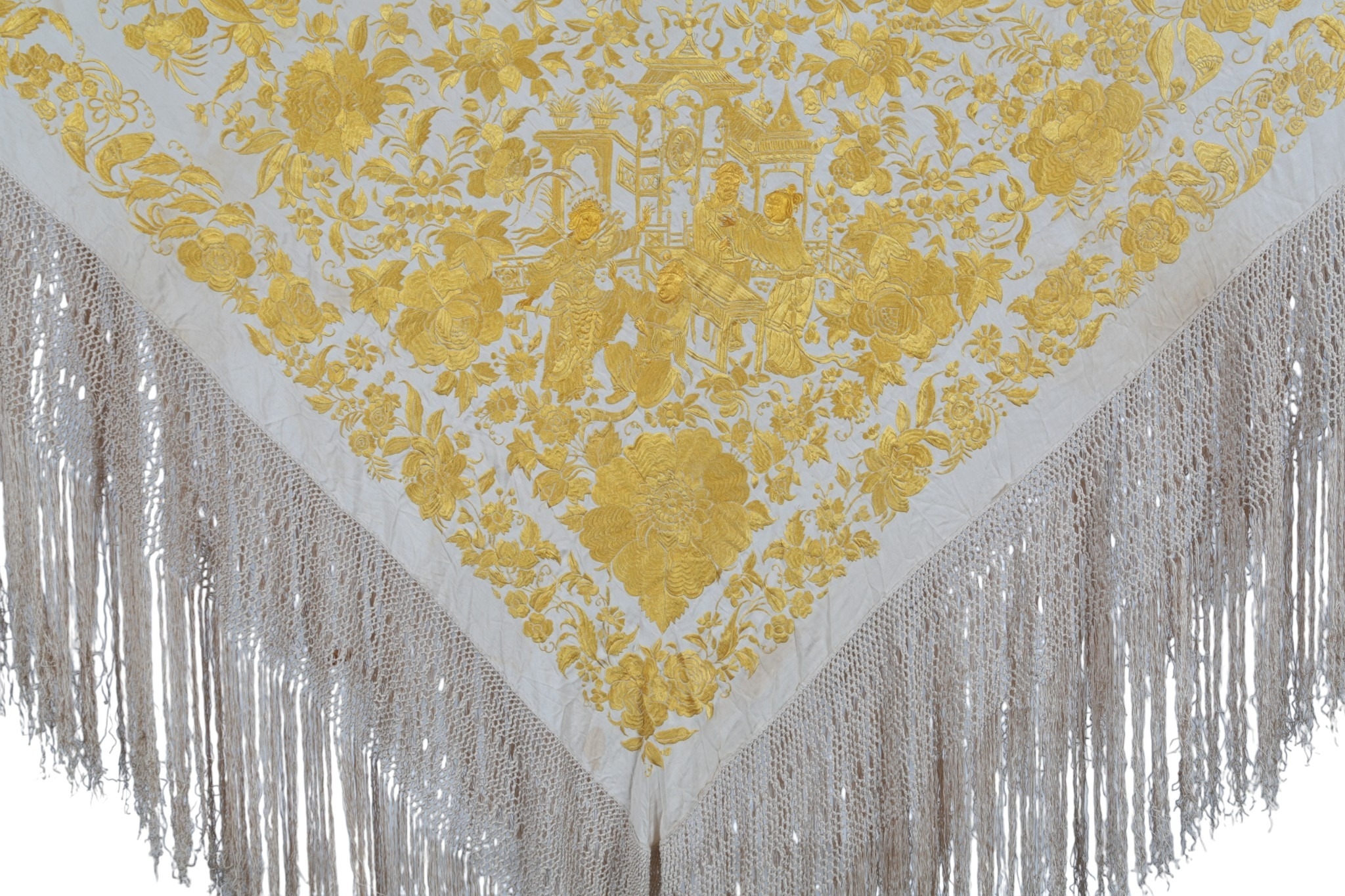 A large Chinese 19th century gold silk embroidered cream shawl, two corners embroidered with large peonies and a peacock surrounded by flowers, the other two corners with two figures in a pagoda with a musician and dancer, surrounded by flowers. The shawl is filled with embroidery and bordered with deep heavy cream silk fringing, 164cm x 168cm.