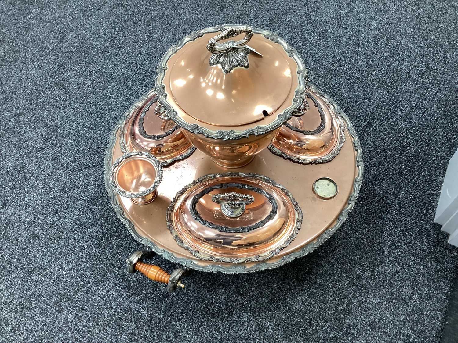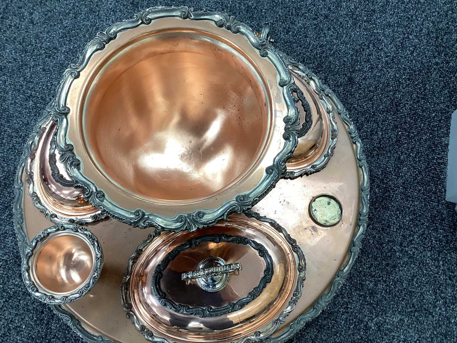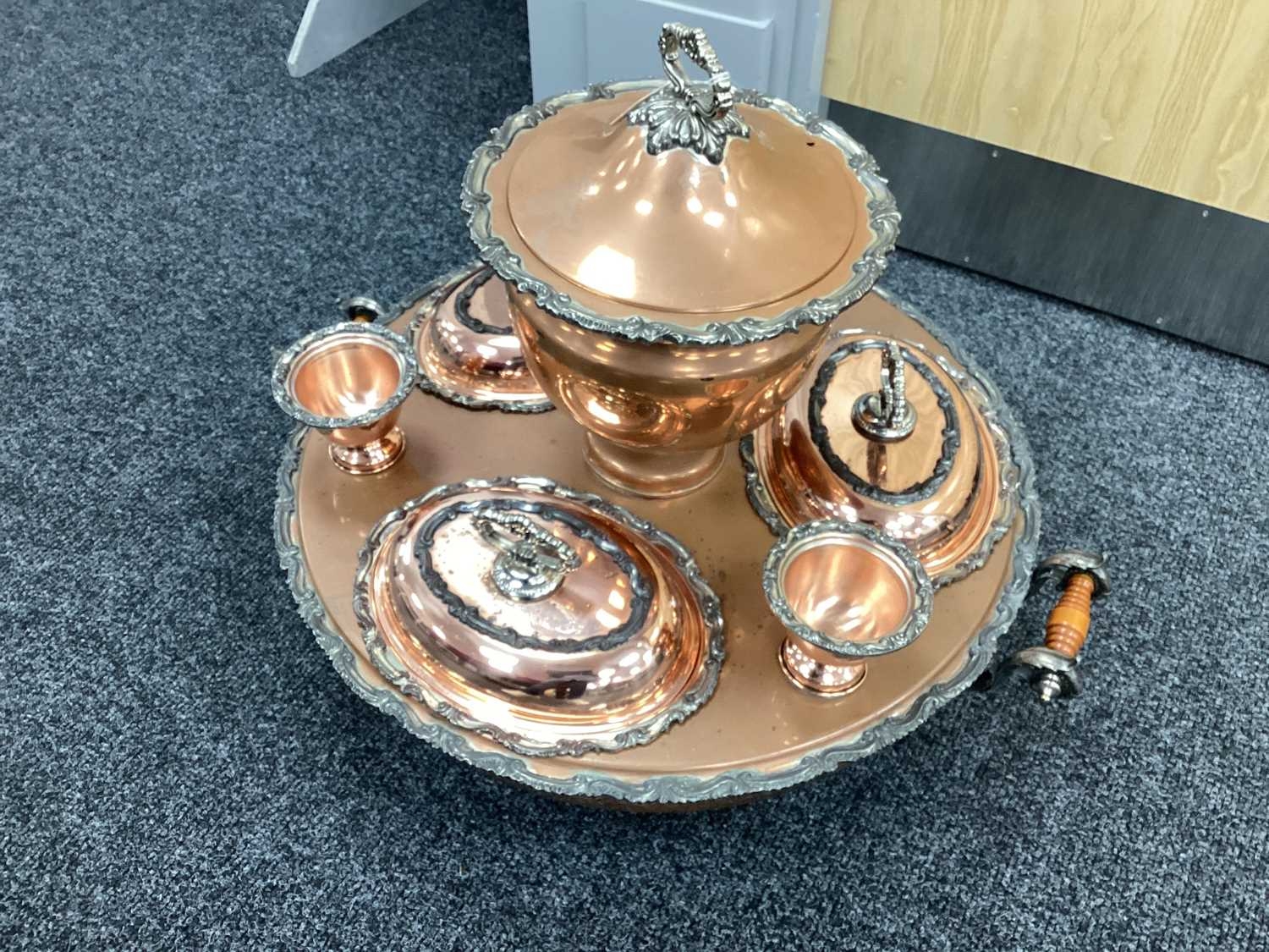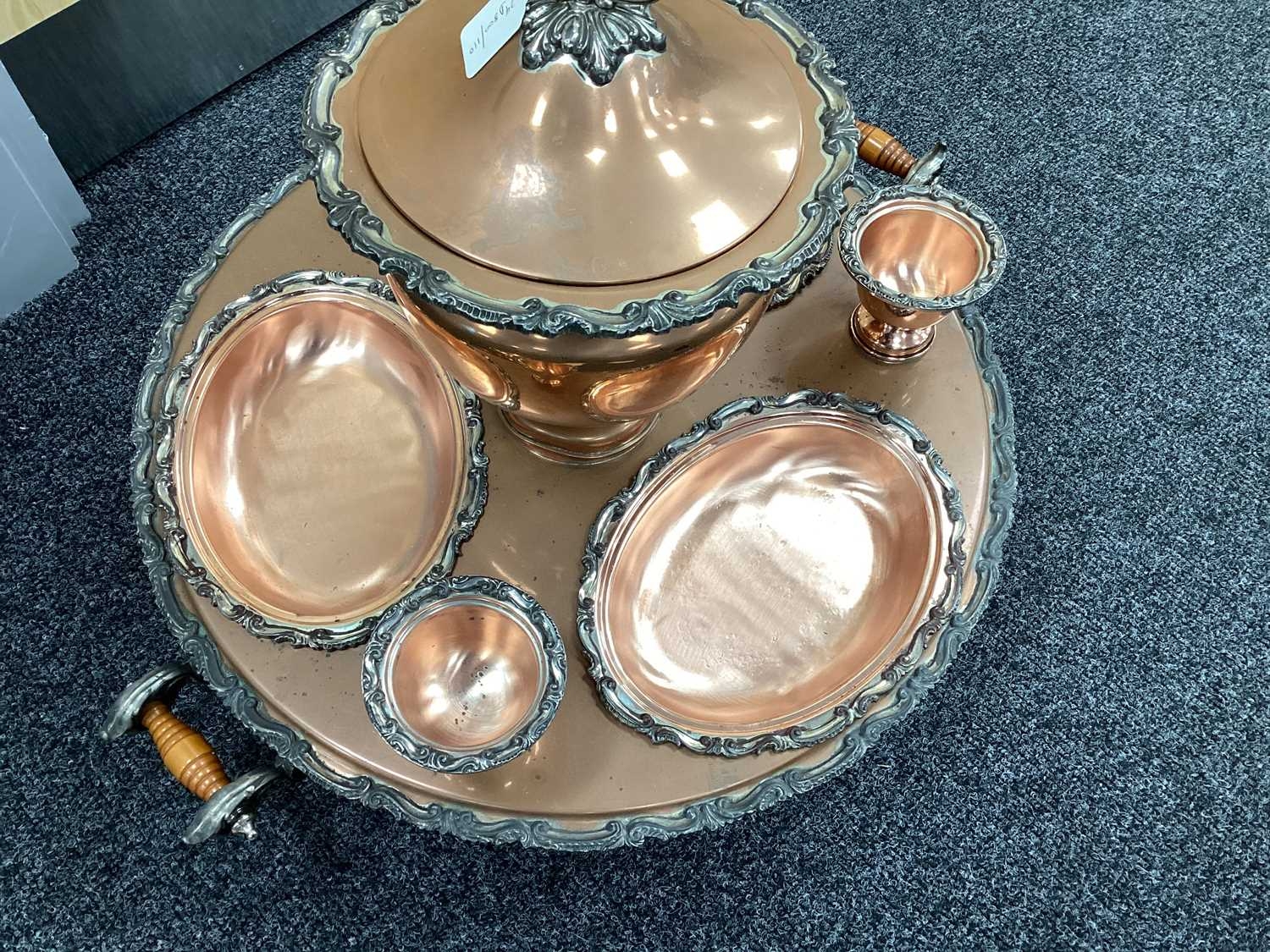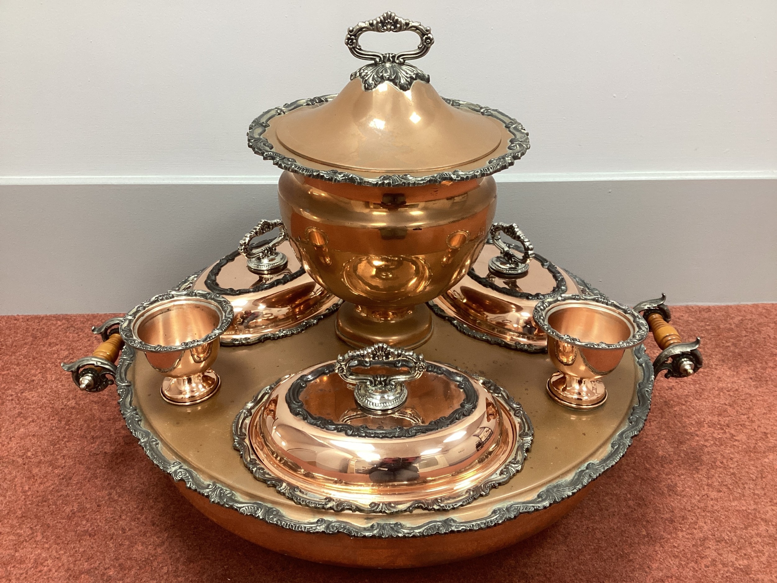 Goldfeder; A Plated on Copper Lazy Susan Bain Marie, fitted with removable central lidded soup tureen, three oval lidded entree dishes and two sauce pots (lacking covers) (incomplete), overall width over handles 67cm.