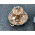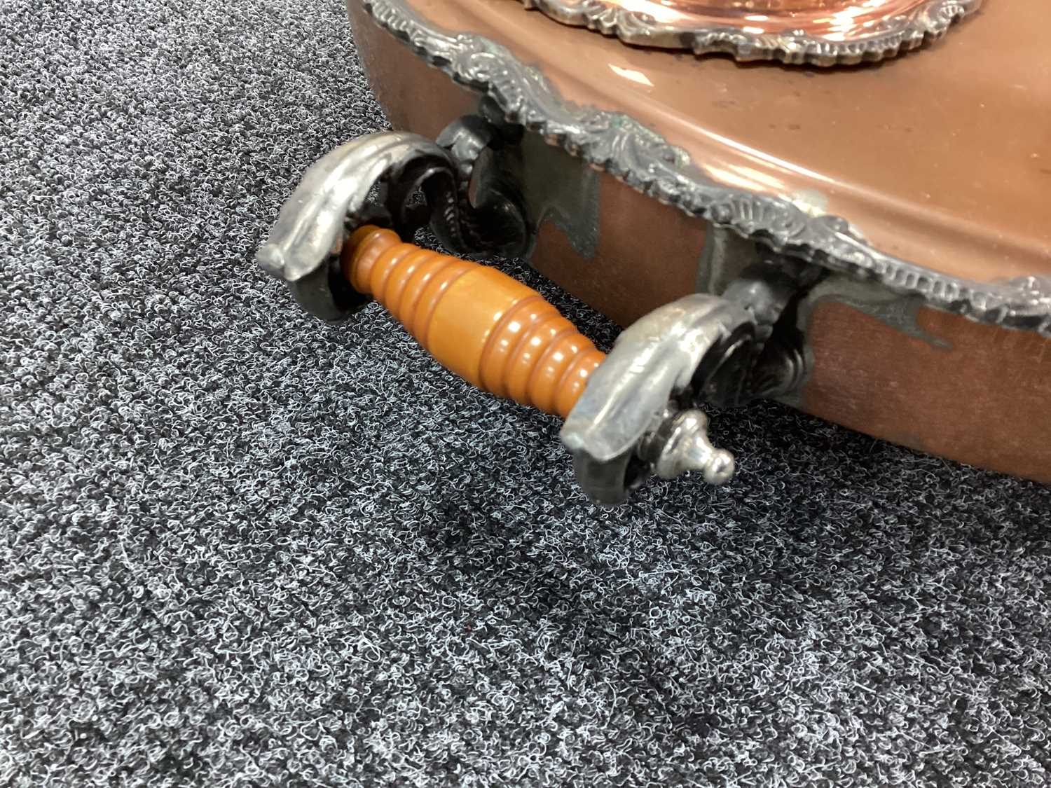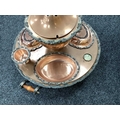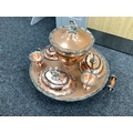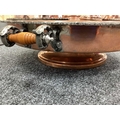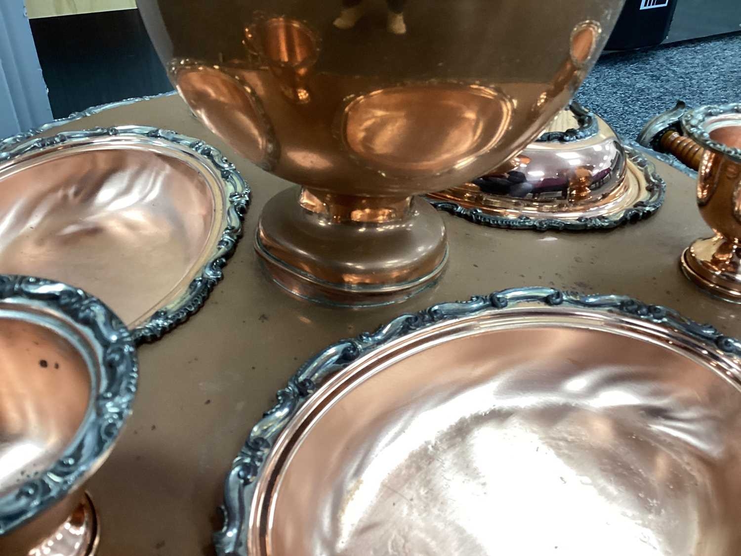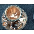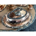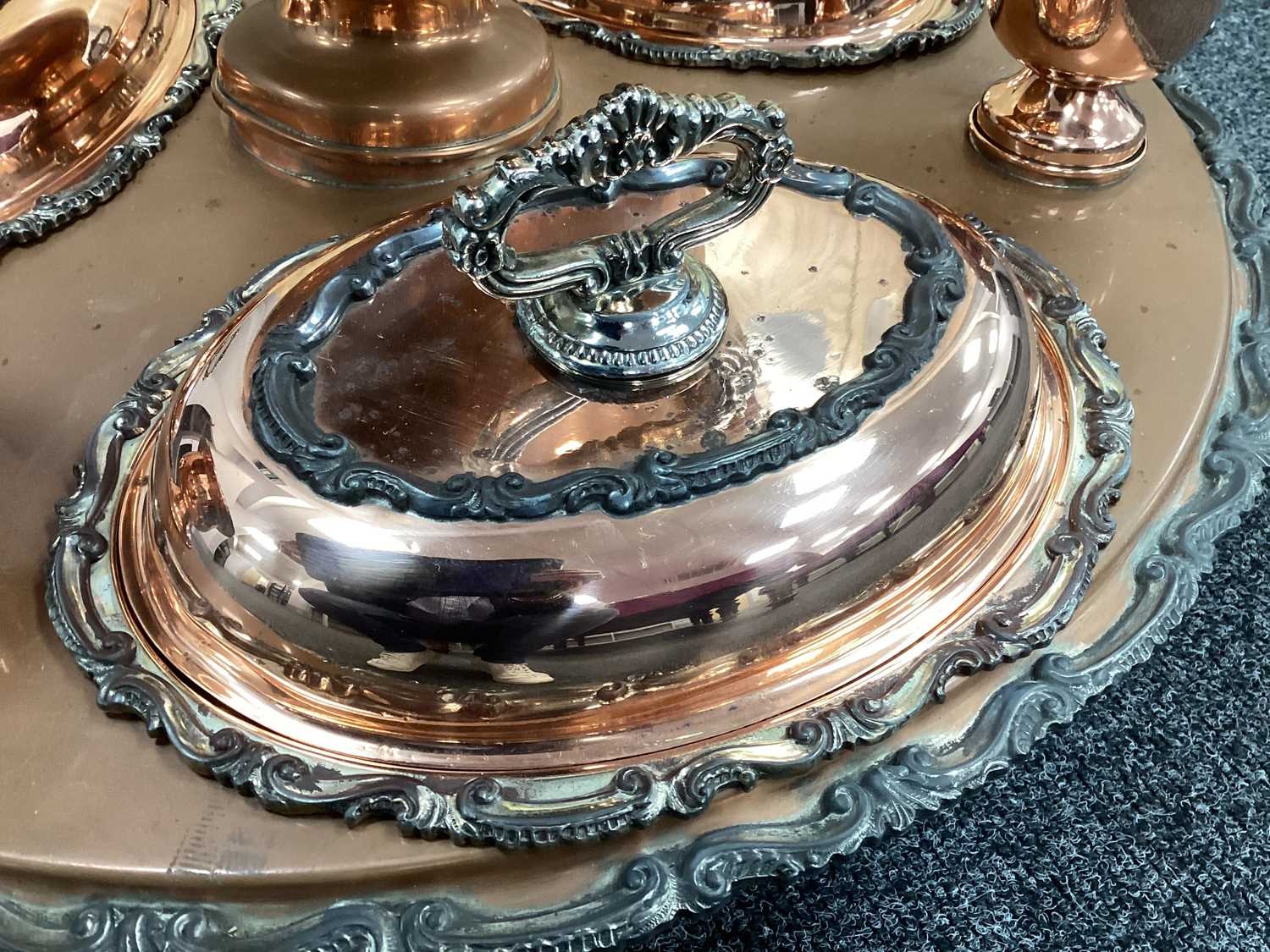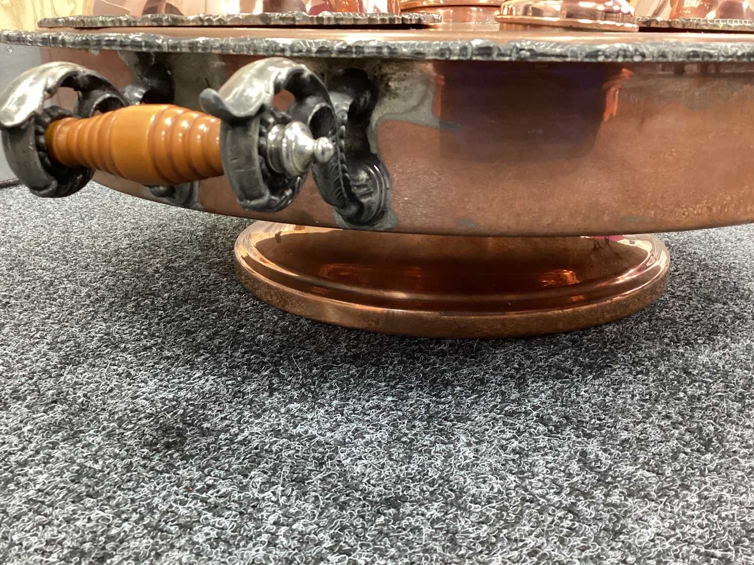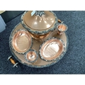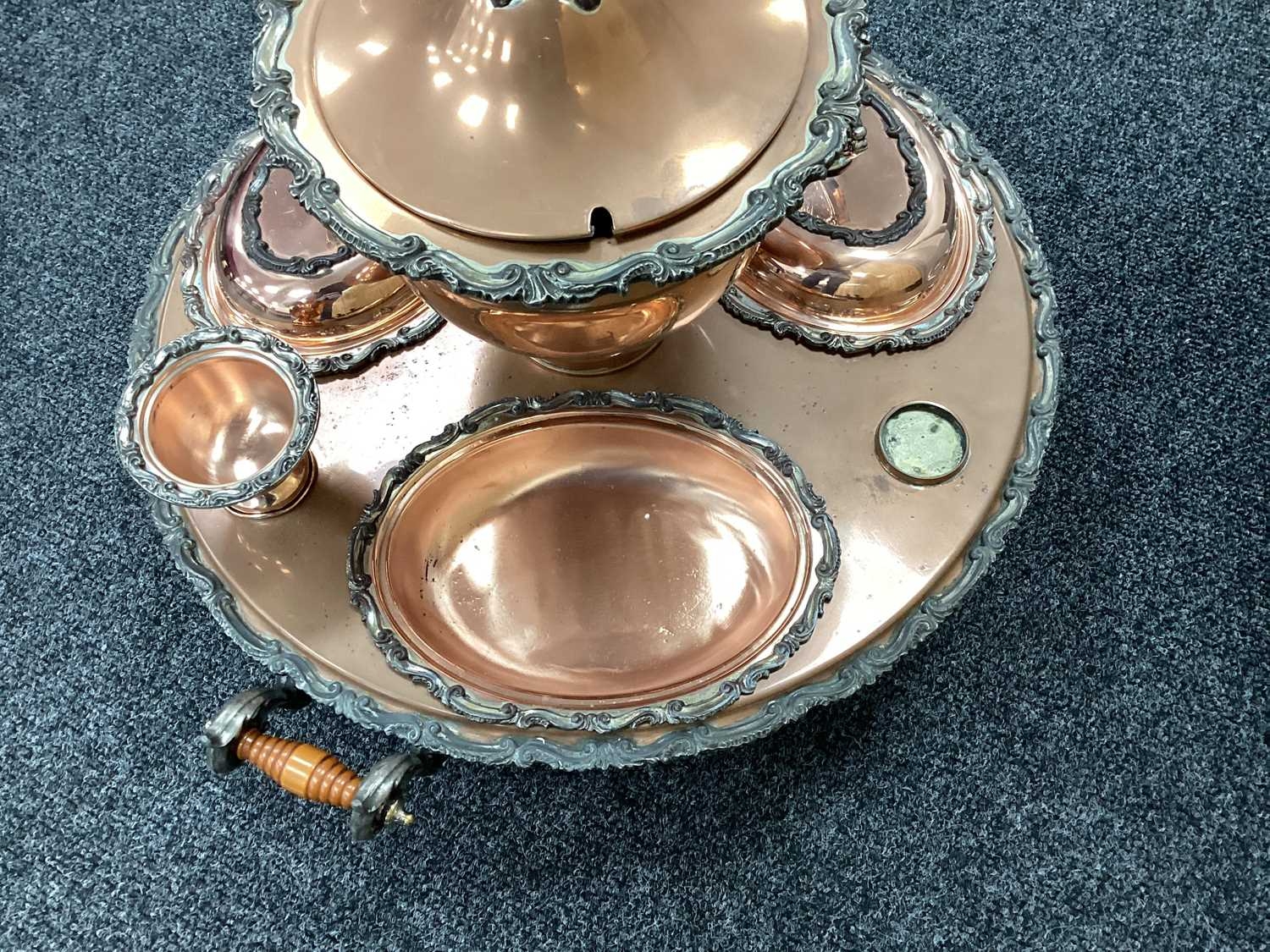 Goldfeder; A Plated on Copper Lazy Susan Bain Marie, fitted with removable central lidded soup tureen, three oval lidded entree dishes and two sauce pots (lacking covers) (incomplete), overall width over handles 67cm.