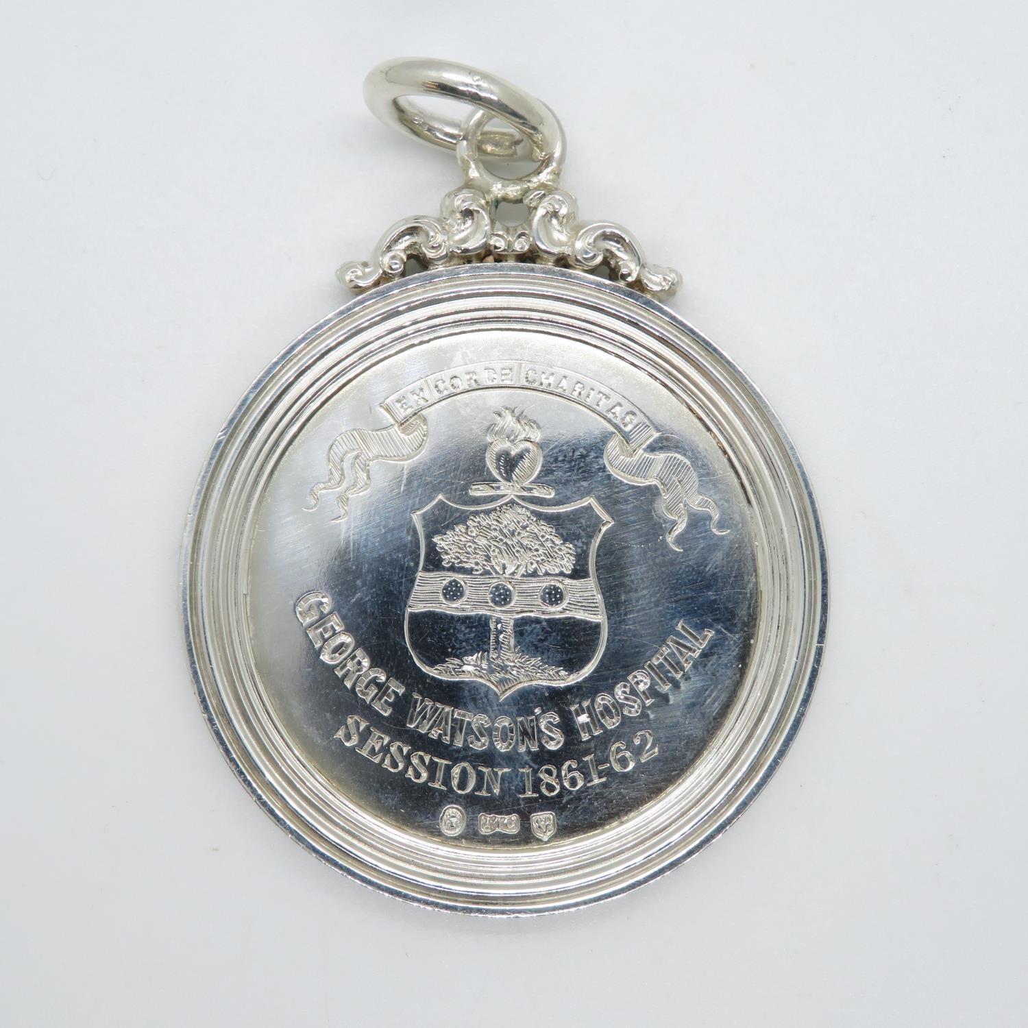 Scottish silver presentation medal from John Dudgeon of Spylaw to Arthur Birrell for a descriptive essay inscribed George Watson's Hospital Session 1861-1862