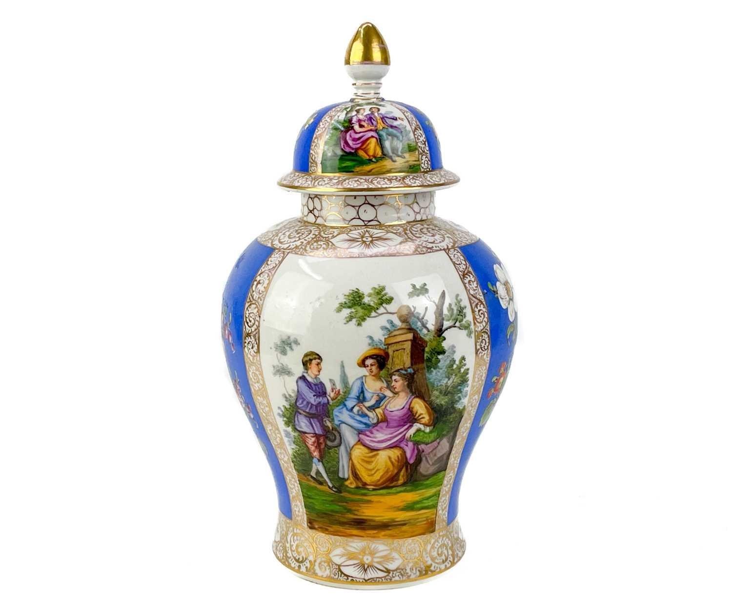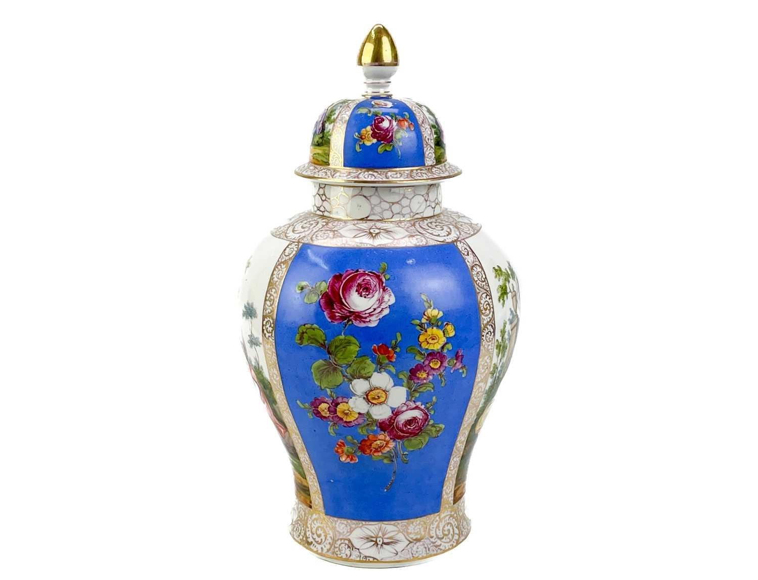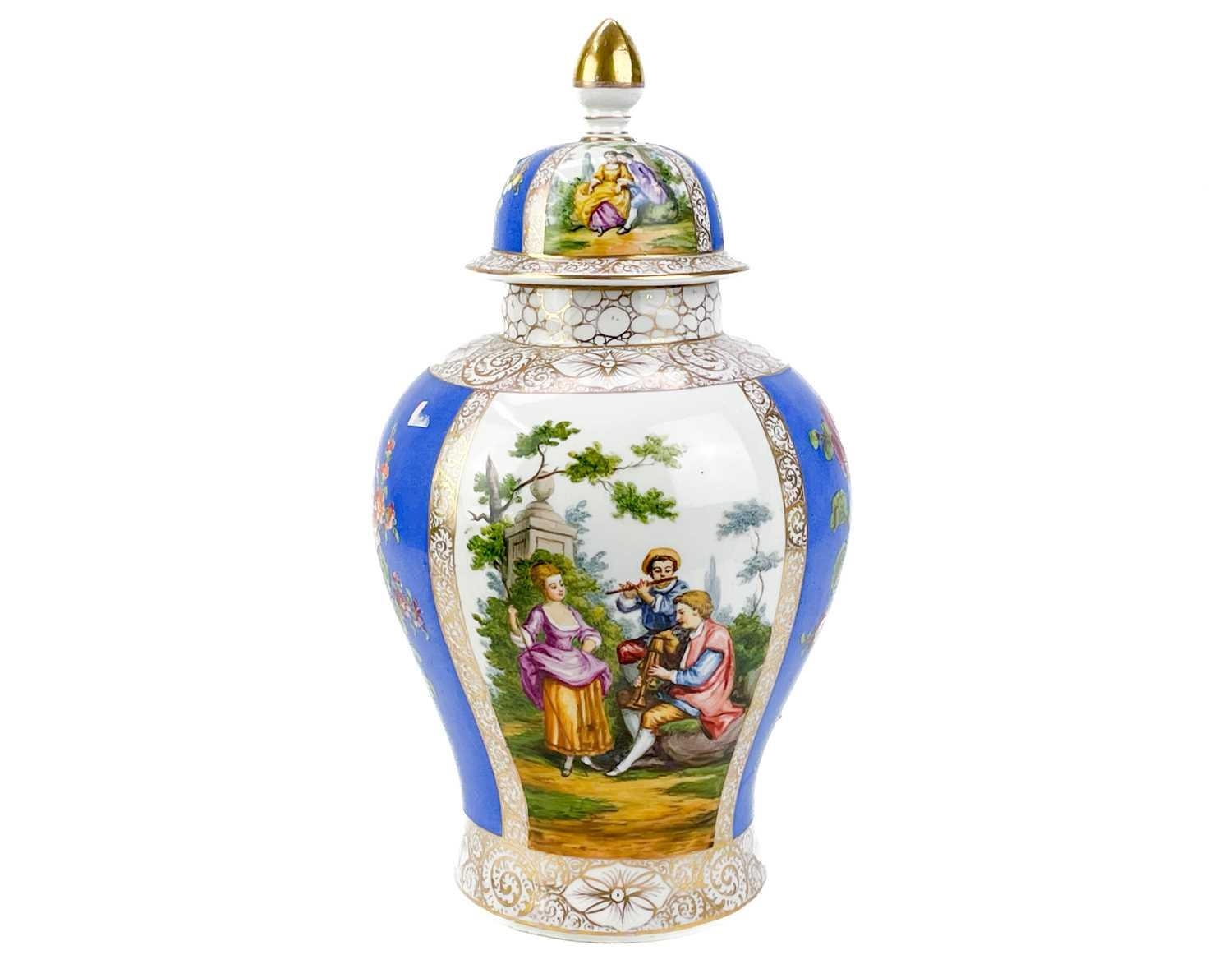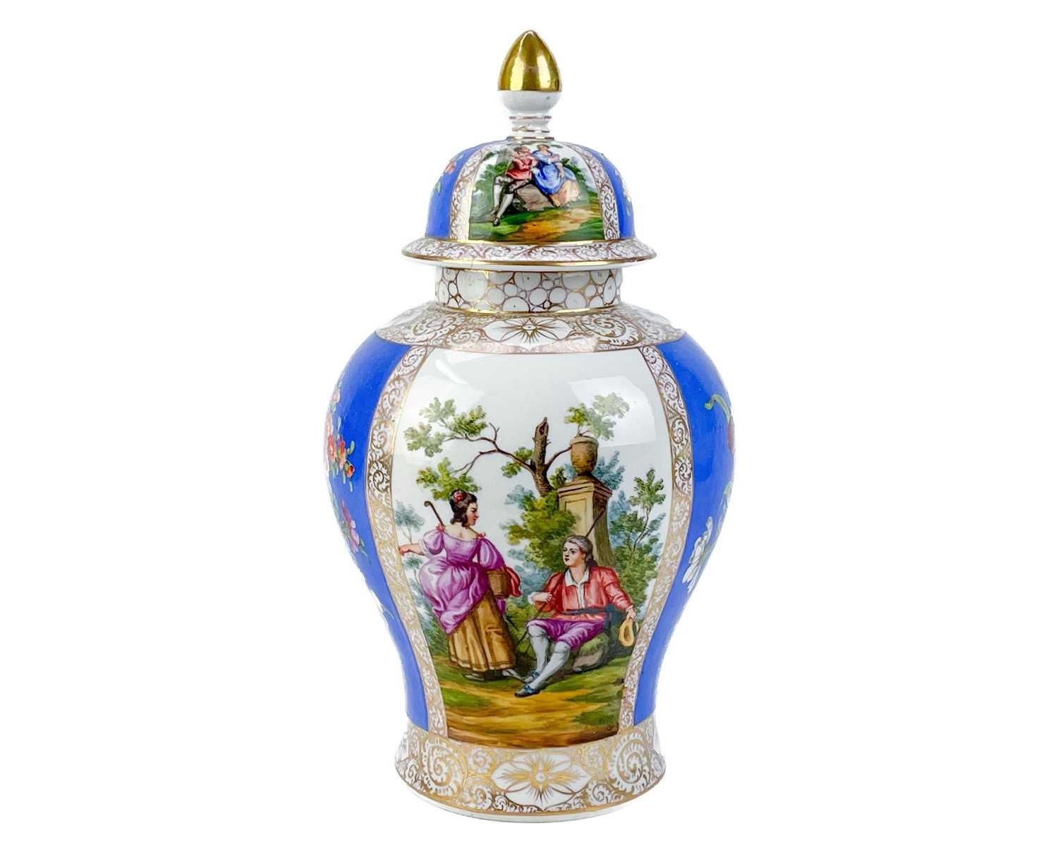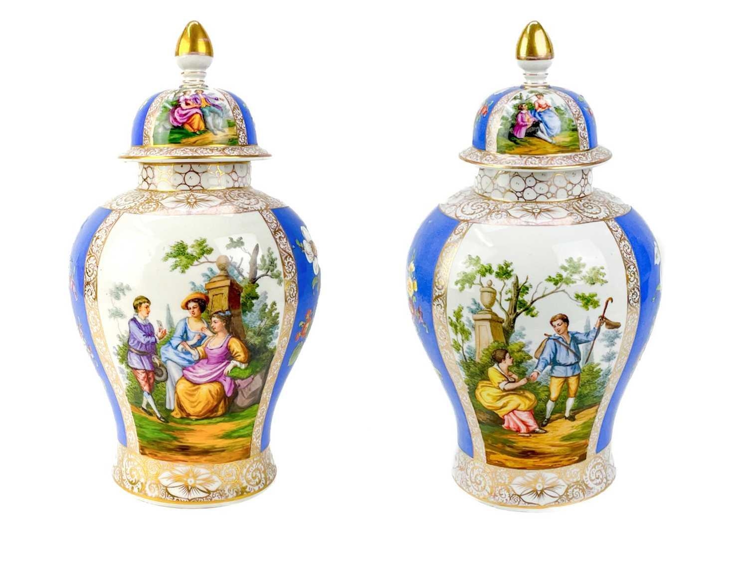 A pair of German porcelain baluster vases and covers. Decorated on blue ground with panels of courting couples highlighted in gilt, height 39cm. One cover is cracked and glued and has a glued knop. One vase has two V-shaped glued breaks to the rim, the other vase has two hairlines and a chip to the rim