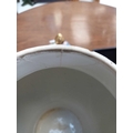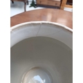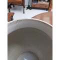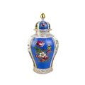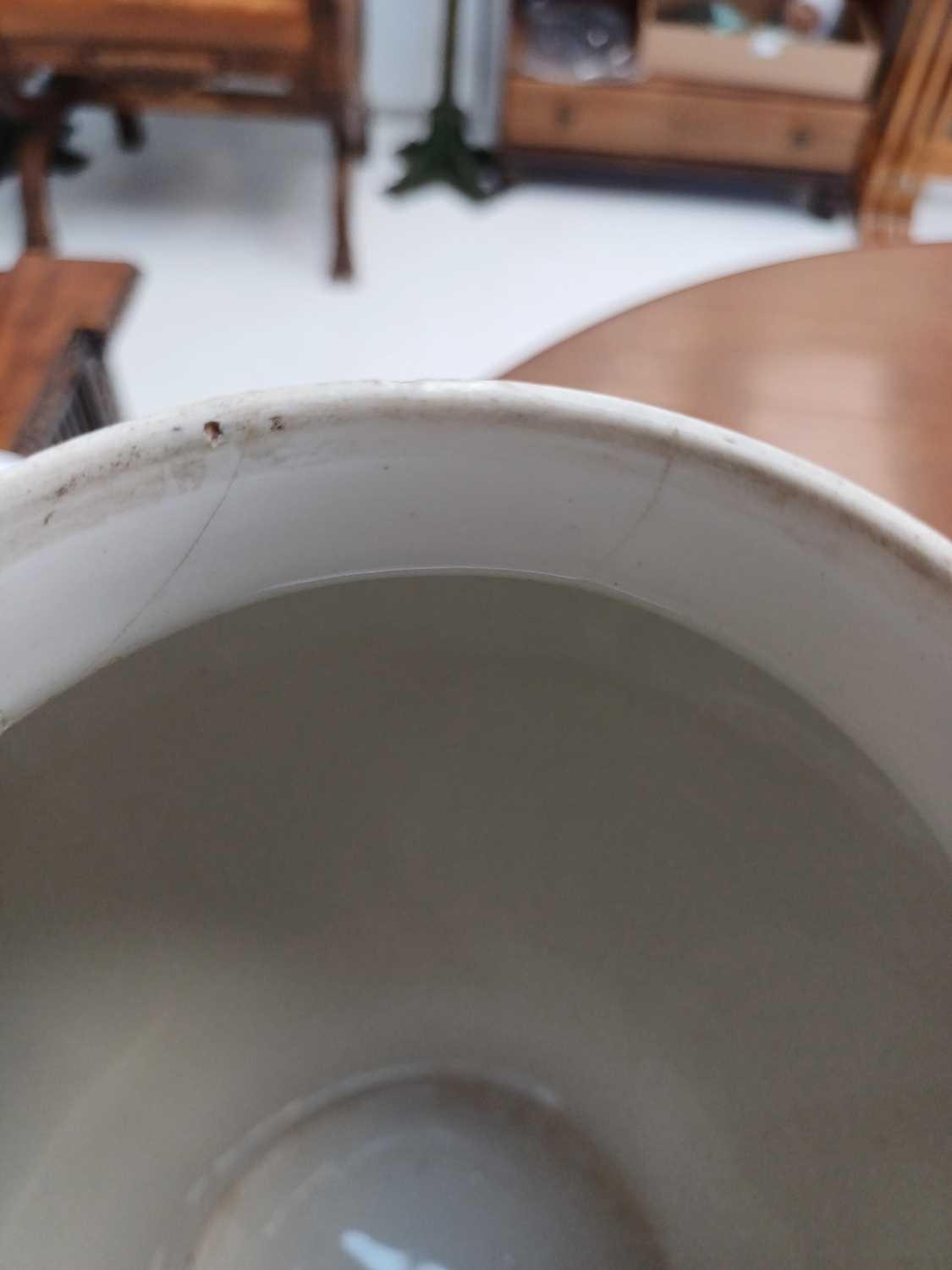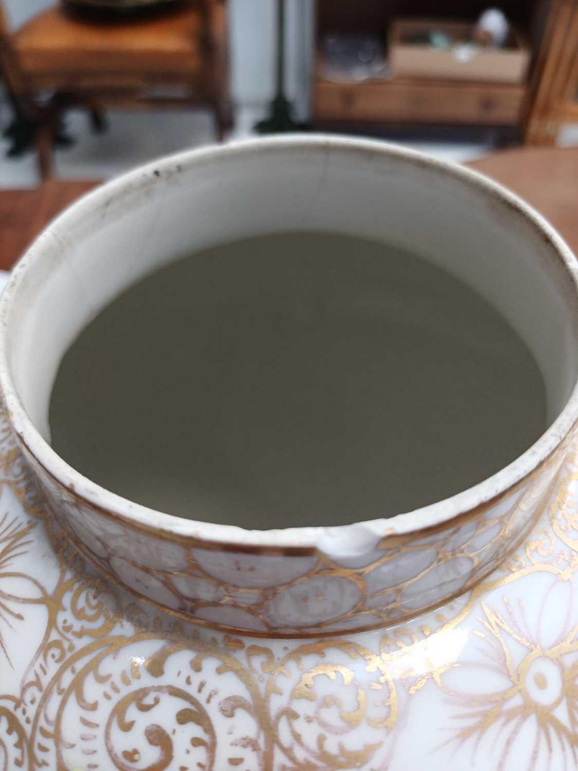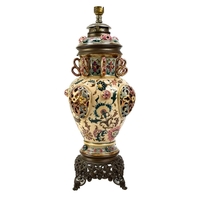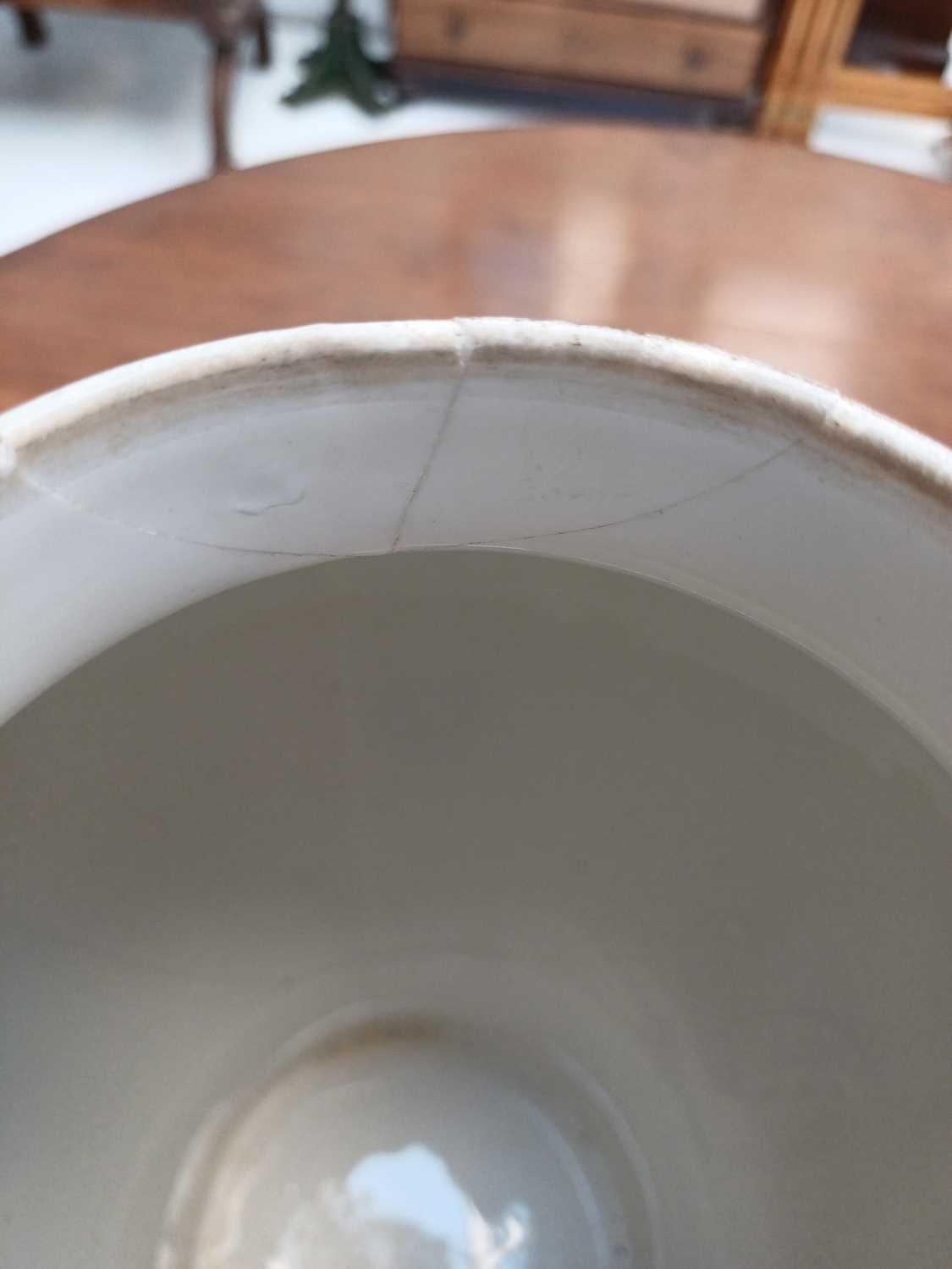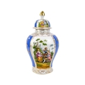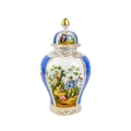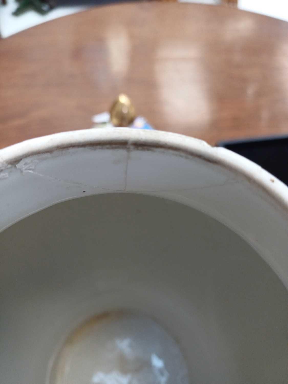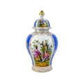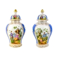 A pair of German porcelain baluster vases and covers. Decorated on blue ground with panels of courting couples highlighted in gilt, height 39cm. One cover is cracked and glued and has a glued knop. One vase has two V-shaped glued breaks to the rim, the other vase has two hairlines and a chip to the rim