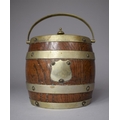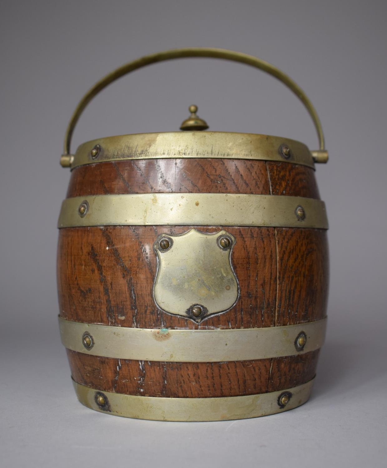 An Edwardian Oak Biscuit Barrel with Silver Plated Banding and Mounts, 14cm Diameter