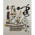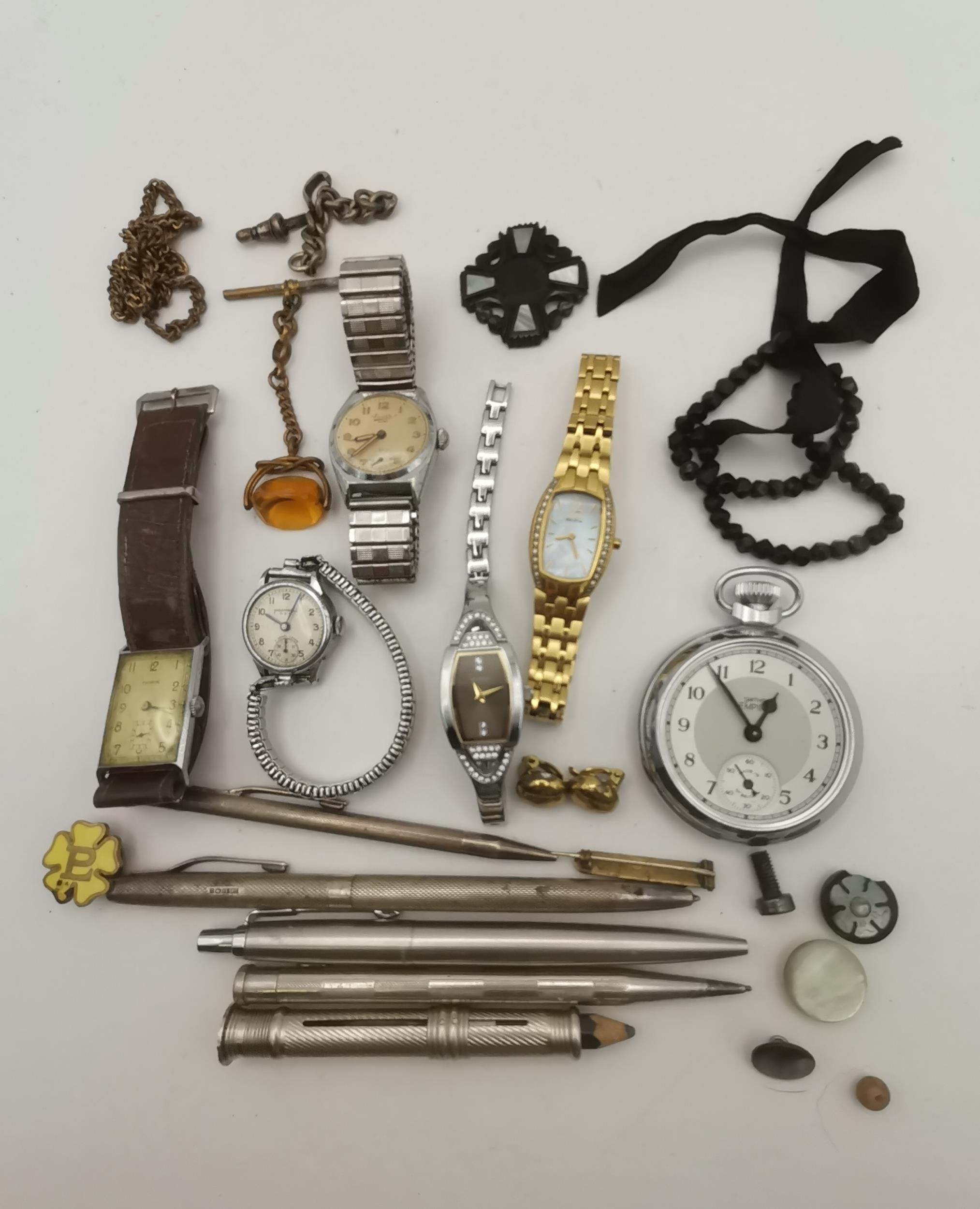 A miscellaneous lot including an Elizabeth II silver ballpoint pen and propelling pencil duo by S J Rose & Son, Birmingham 1990, each engraved to rectangular cartouche with initials; an early 20th Century tank watch by Pierce with original brown leather strap; four other assorted wristwatches; a Smiths Empire pocket watch; an enamelled Primrose League badge; etc. (Qty)