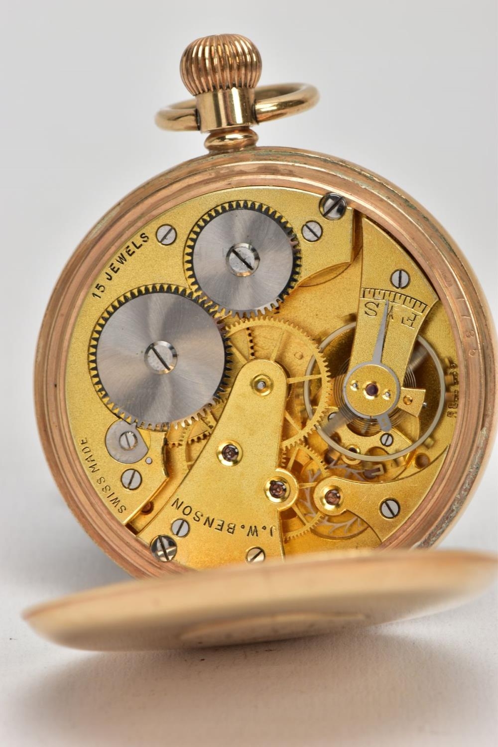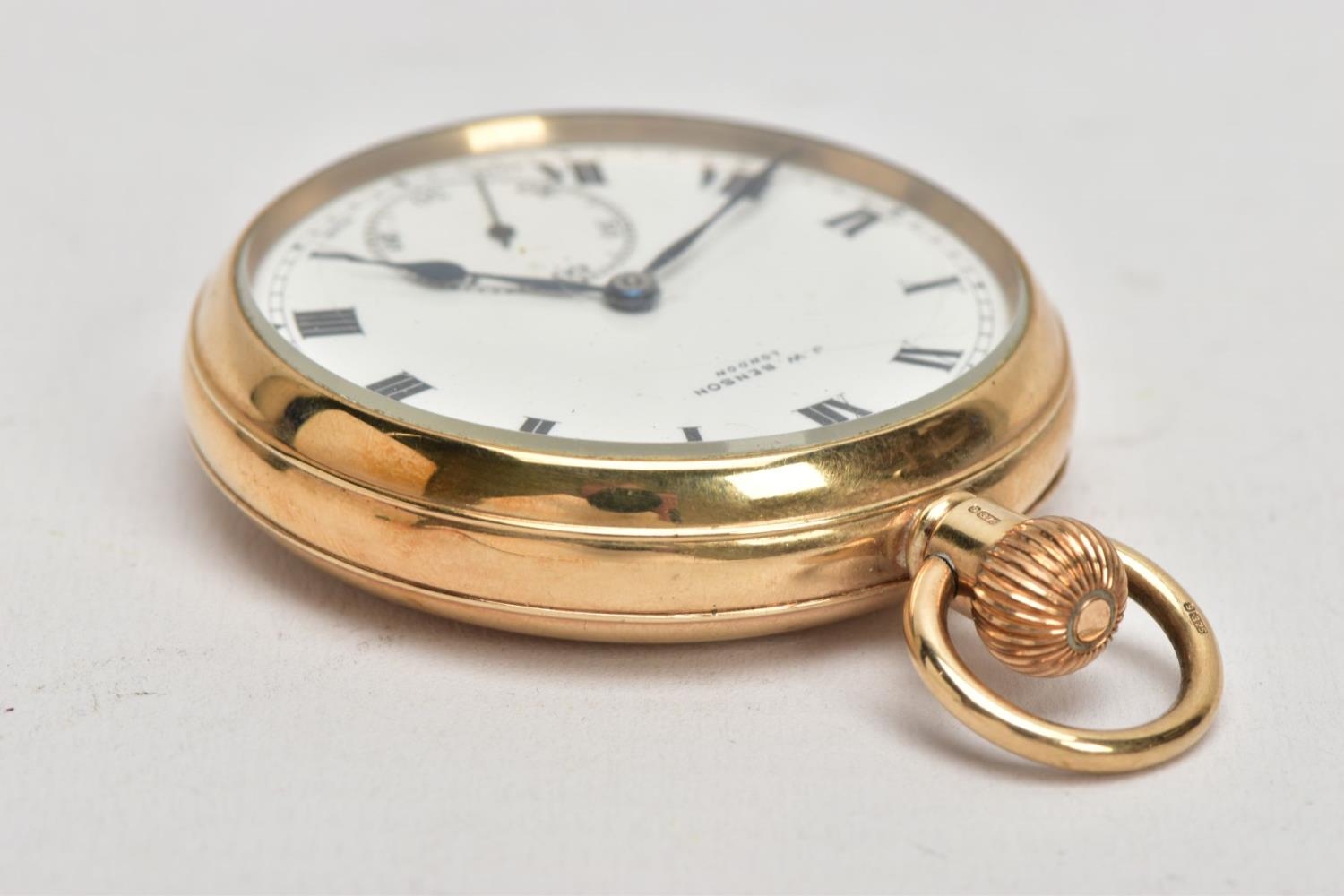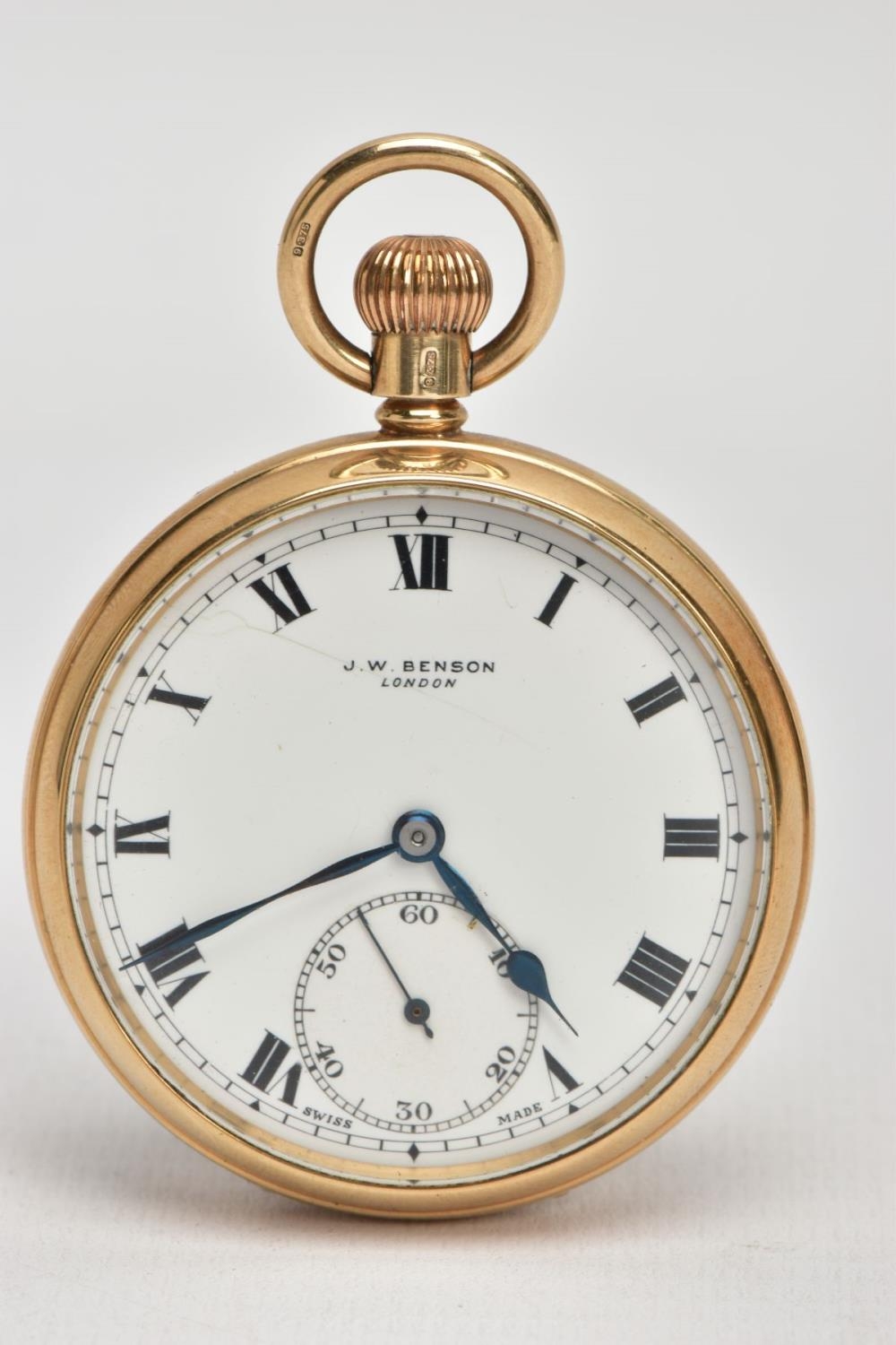 A 9CT GOLD OPEN FACE POCKET WATCH, white dial signed 'J.W.Benson, London', Roman numerals, seconds subsidiary dial at the six o'clock position, blue hands, within a plain polished case and engraved cartouche, case back hallmarked 9ct gold London 1934, movement signed 'J.W.Benson' Swiss made, 15 jewels, Ref.939', approximate case width 48.7mm, approximate gross weight 75.5 grams (condition report: in working condition, time keeping untested, general light wear, small hair line crack within the dial)