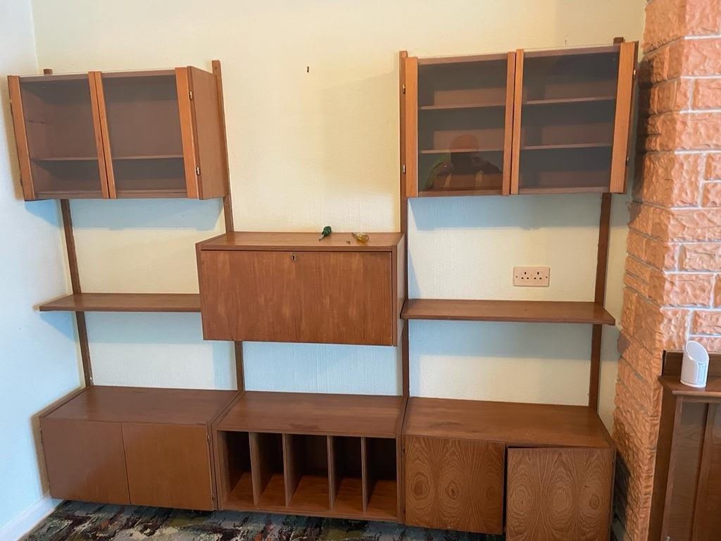 A floating display unit comprising glazed cupboards above shelving with cupboards under, to be assembled - NO RESERVE