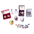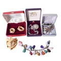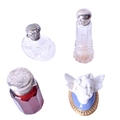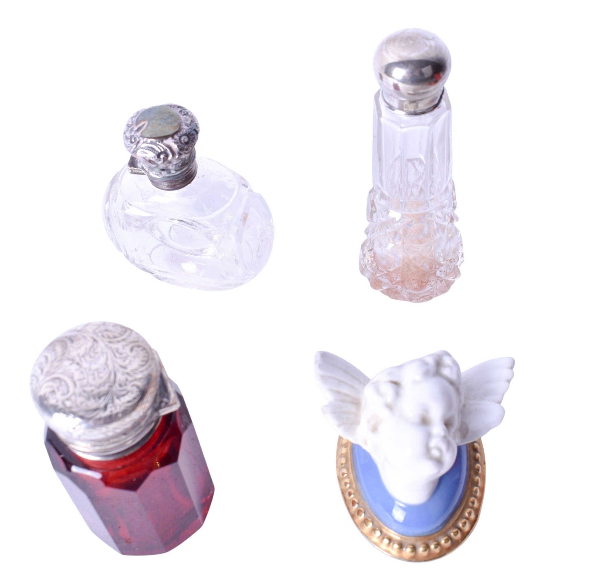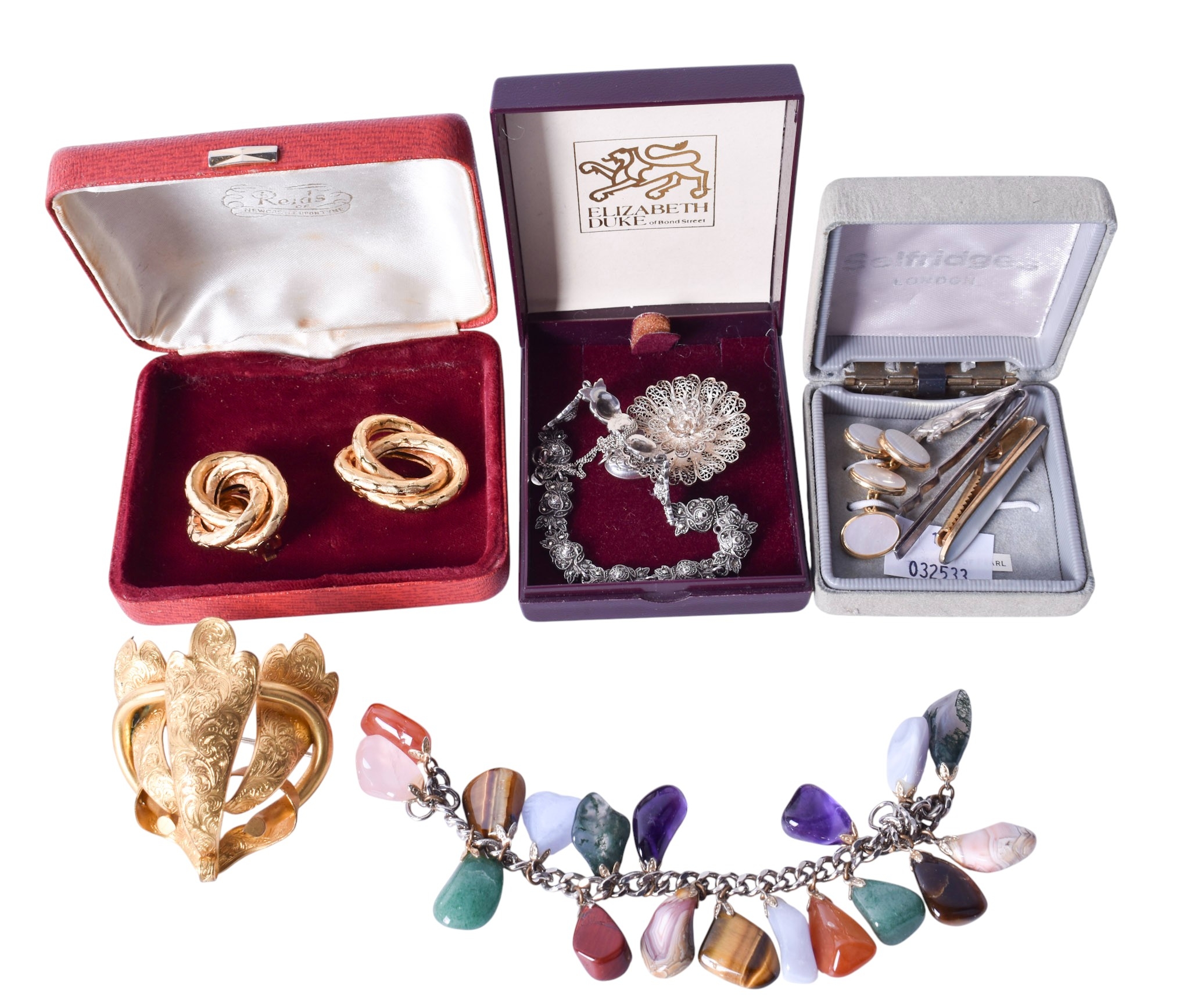 A collection of vintage scent bottles and costume jewellery. The red and colourless cut glass bottles with silver and white metal mounts, together with mother of pearl dress clip and cufflinks, gold plated scarf pin, stone pendant bracelet, etc.