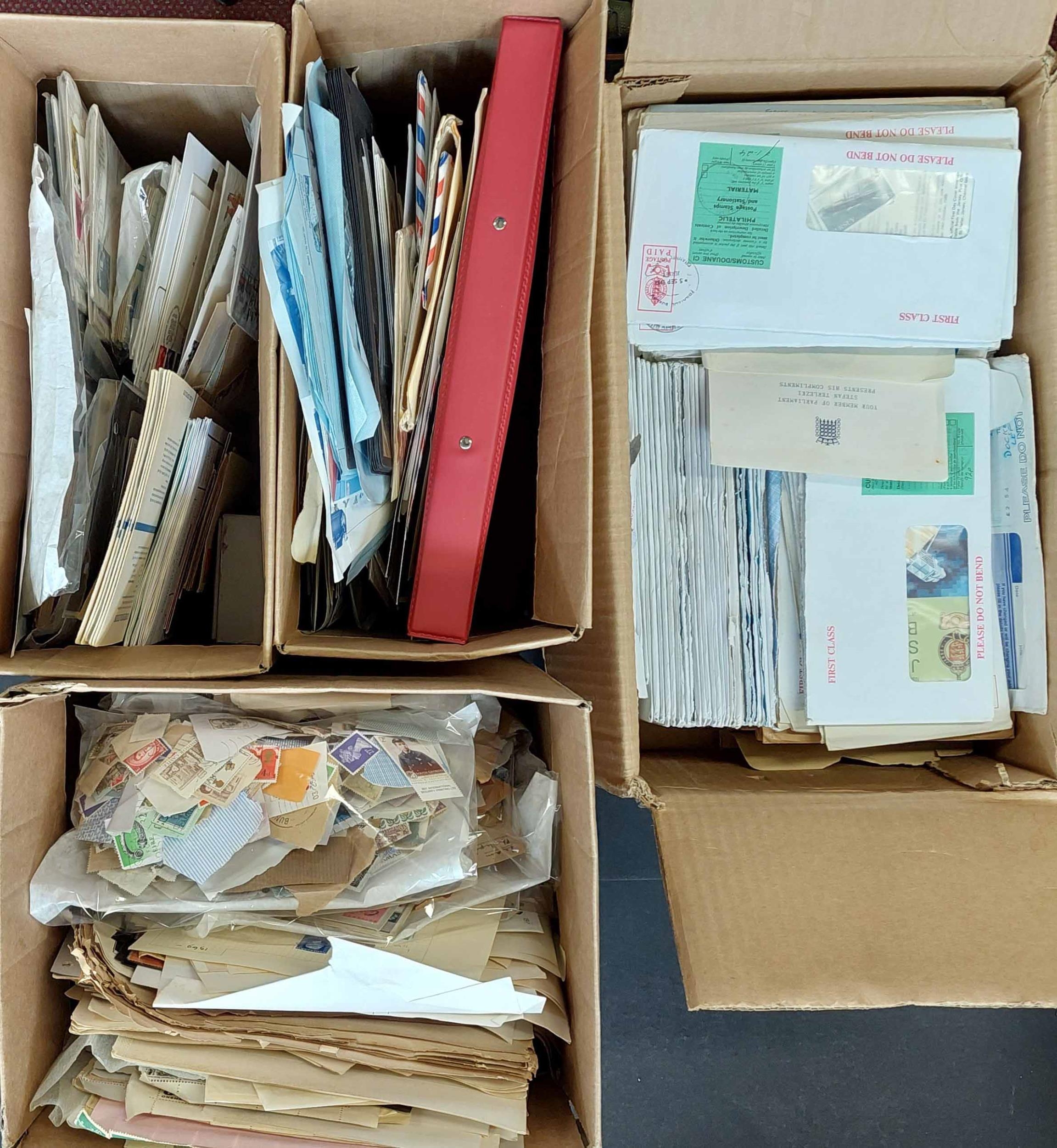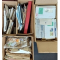 GB, CHANNEL ISLANDS & WORLDWIDE ACCUMULATION: Four cartons holding a somewhat untidy accumulation of stamps & covers in packets, stock cards, album pages, etc., inc. diverse range of Worldwide sheets, sets & singles plus GB pre-decimal material & some FDCs. One carton full of 1980s/90s Channel Islands/IOM new issues in original mailing envelopes, some unopened. Useful face value. Inspection required. A great 'sorter' (very many 100s) Cross Reference: CHANNEL ISLANDS STAMPS