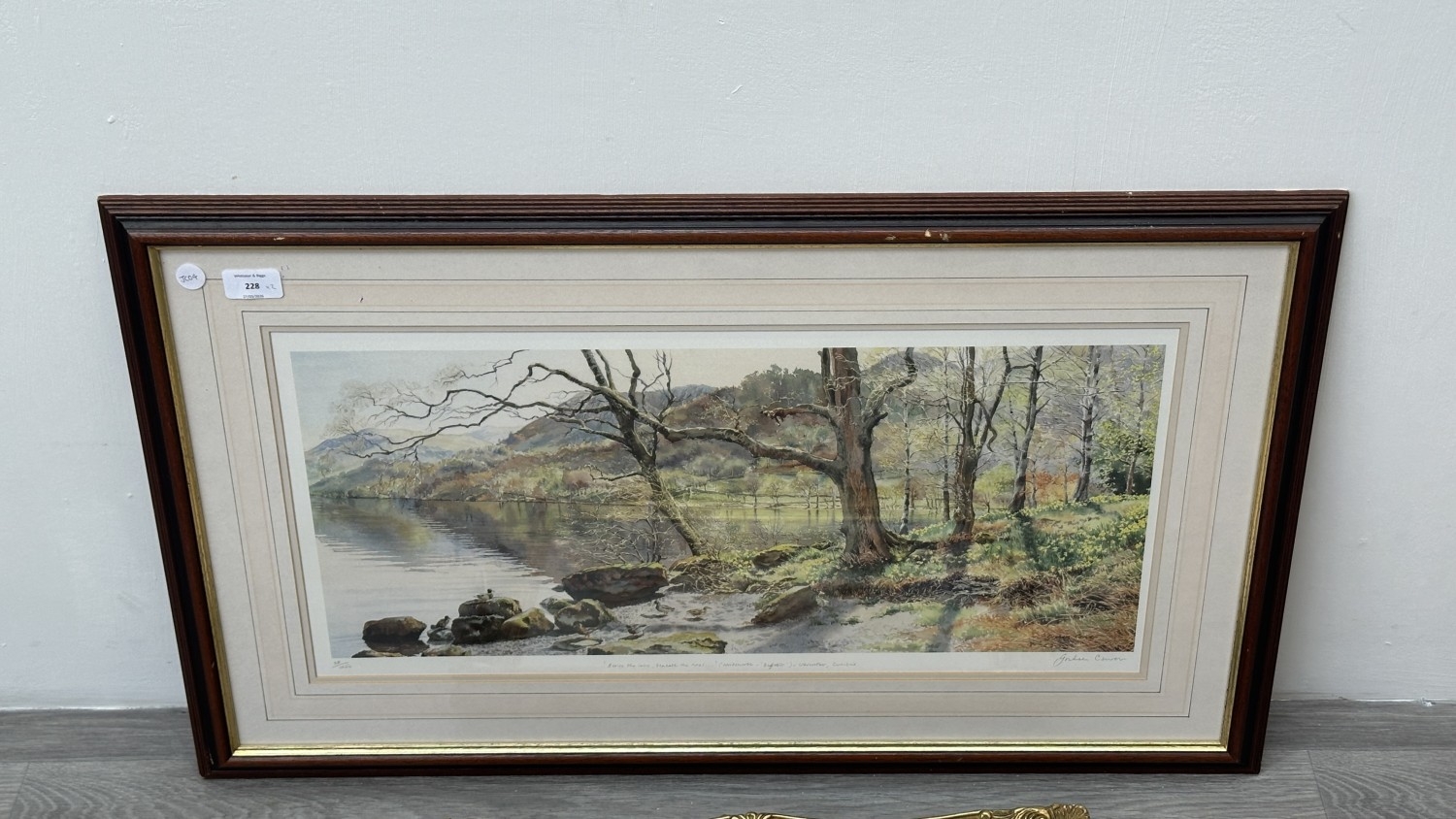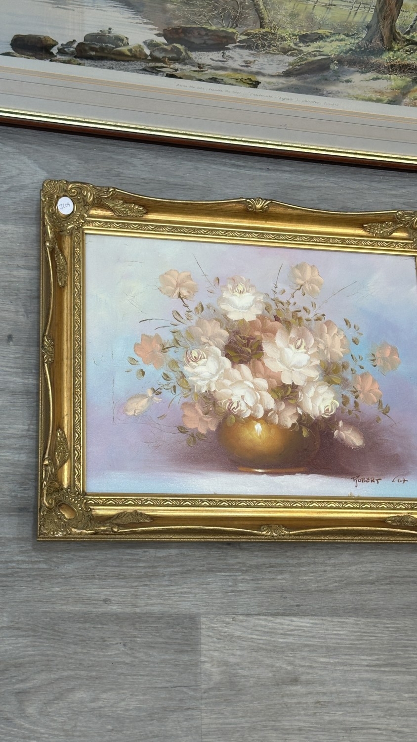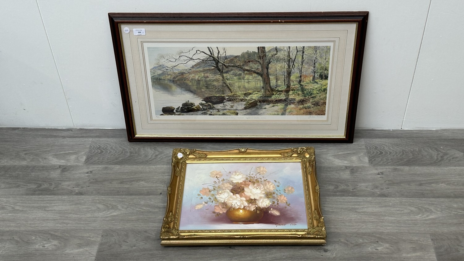 Two framed pictures, one gilt framed floral still life oil on canvas - approx. 40cm high x 49cm wide and one Graham Carver pencil signed limited edition 28/450 print titled 'Beside the lake, beneath the trees...' - approx. 50cm high x 82cm wide