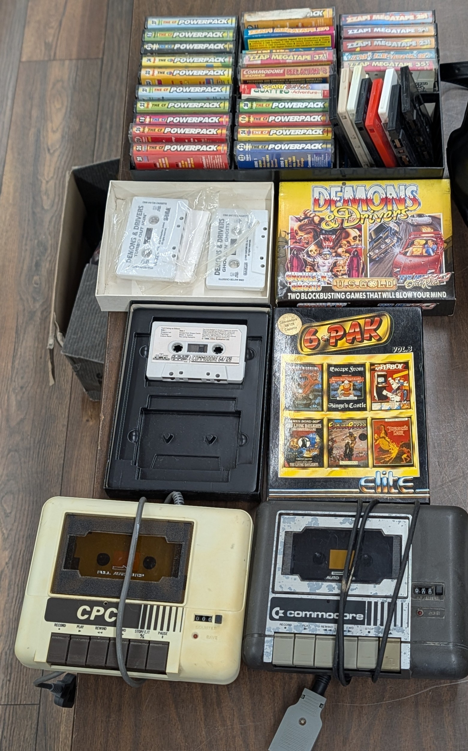 An Assortment of Vintage Commodore 64/128 Cassette Tape Drives and Software Games Collection