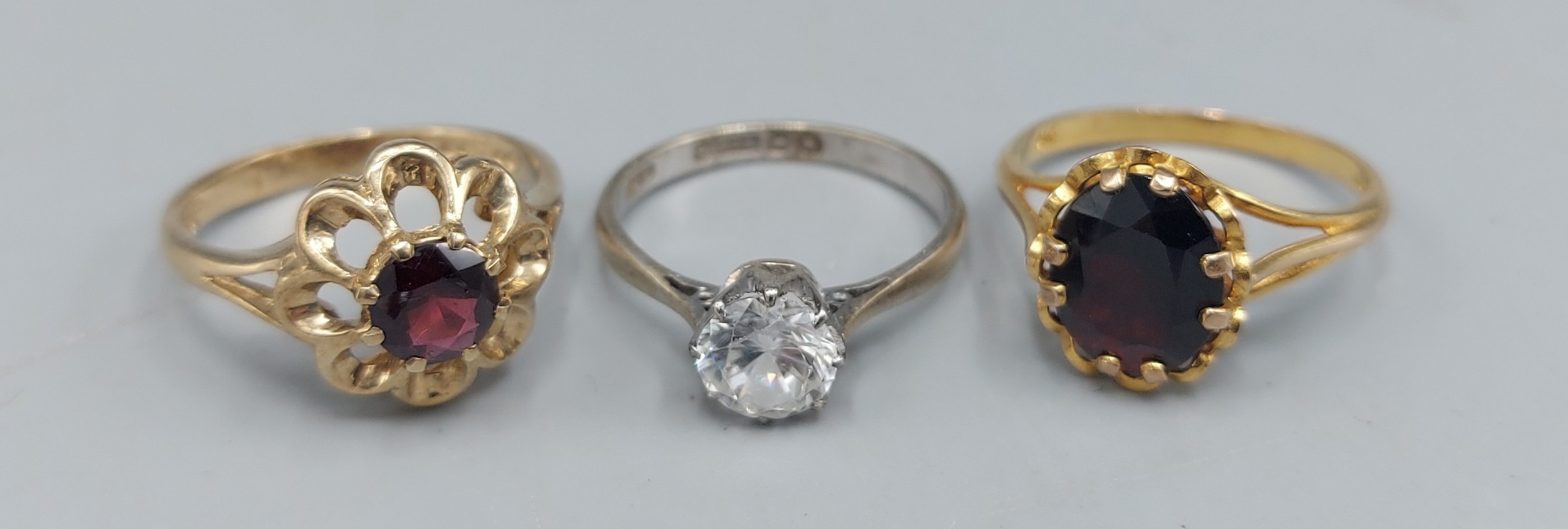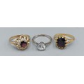 A 9ct gold Garnet set dress ring together with two other 9ct gold dress rings, combined weight 7.3gms