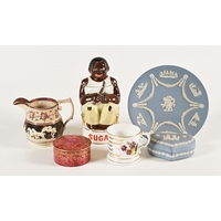 The small dish on the centre left of the photograph has a chip to the rim. The small vase to the left-hand side has some dents and scratches to the side of the body. The tazza to the left-hand side is in very good condition with no signs of any chips, cracks etc. The vase to the centre rear is in good order with no signs of any chips, cracks etc. The vase to the front right-hand side has a chip to the base which is worn smooth. The other two pieces have no signs of any chips, cracks etc.