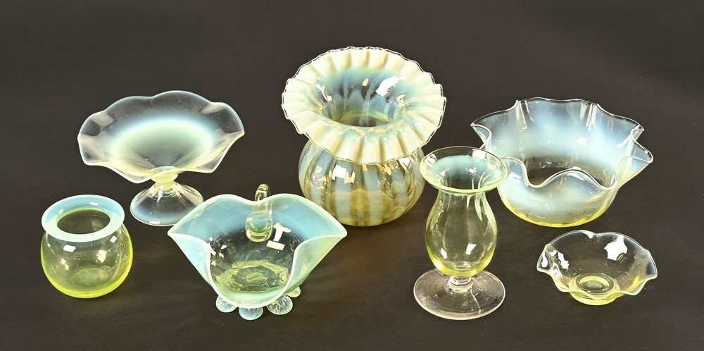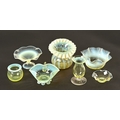 A collection of seven pieces of Victorian Vaseline glass. Tallest 11.5 cm.