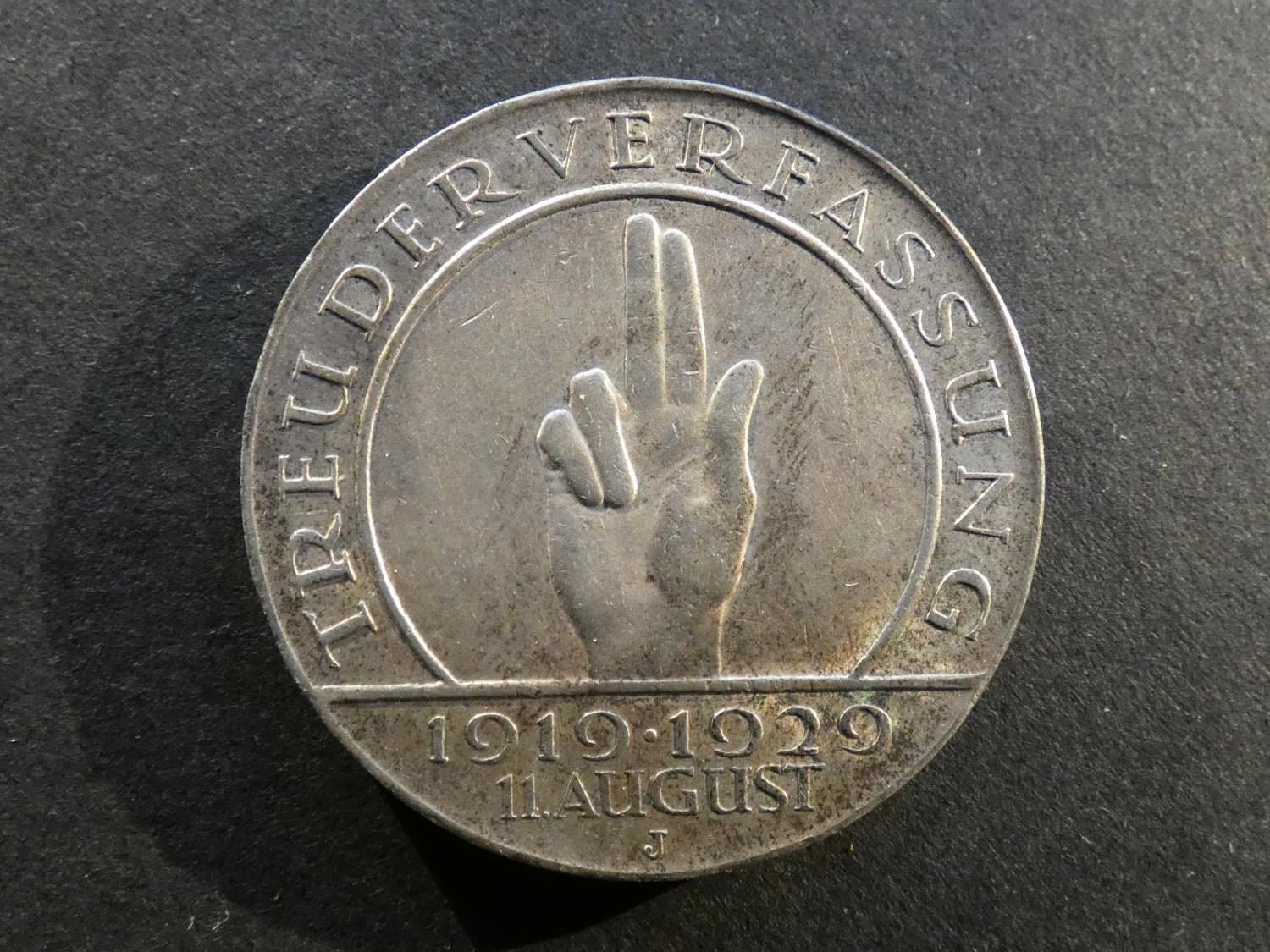 GERMANY. Weimar Republic (1919-1933). 3 Reichsmark, 1929J, Hamburg mint, 10th anniversary of Weimar Constitution, KM63, VF/VF+