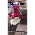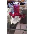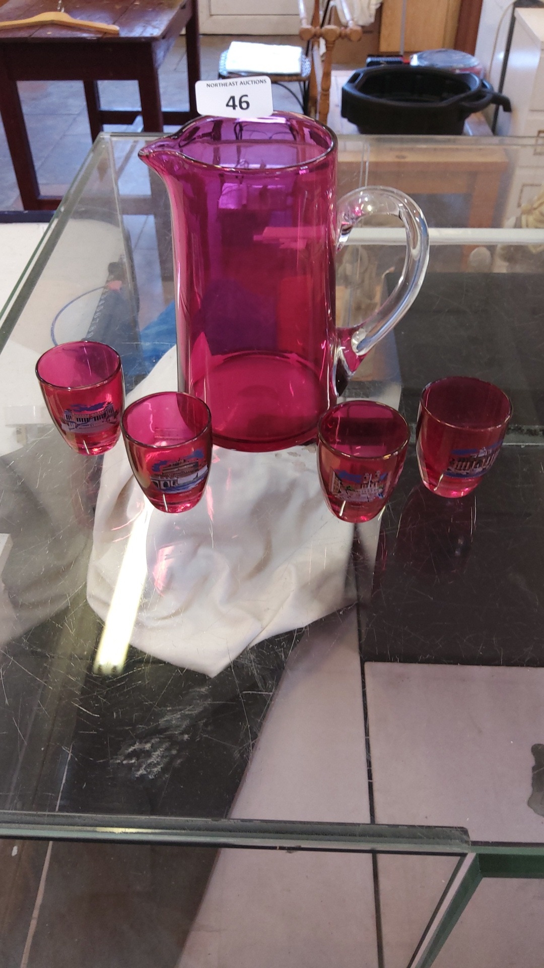 Set of five cranberry-tinted glass items, comprising a clear-handled water jug and four matching small tumblers with printed architectural views.