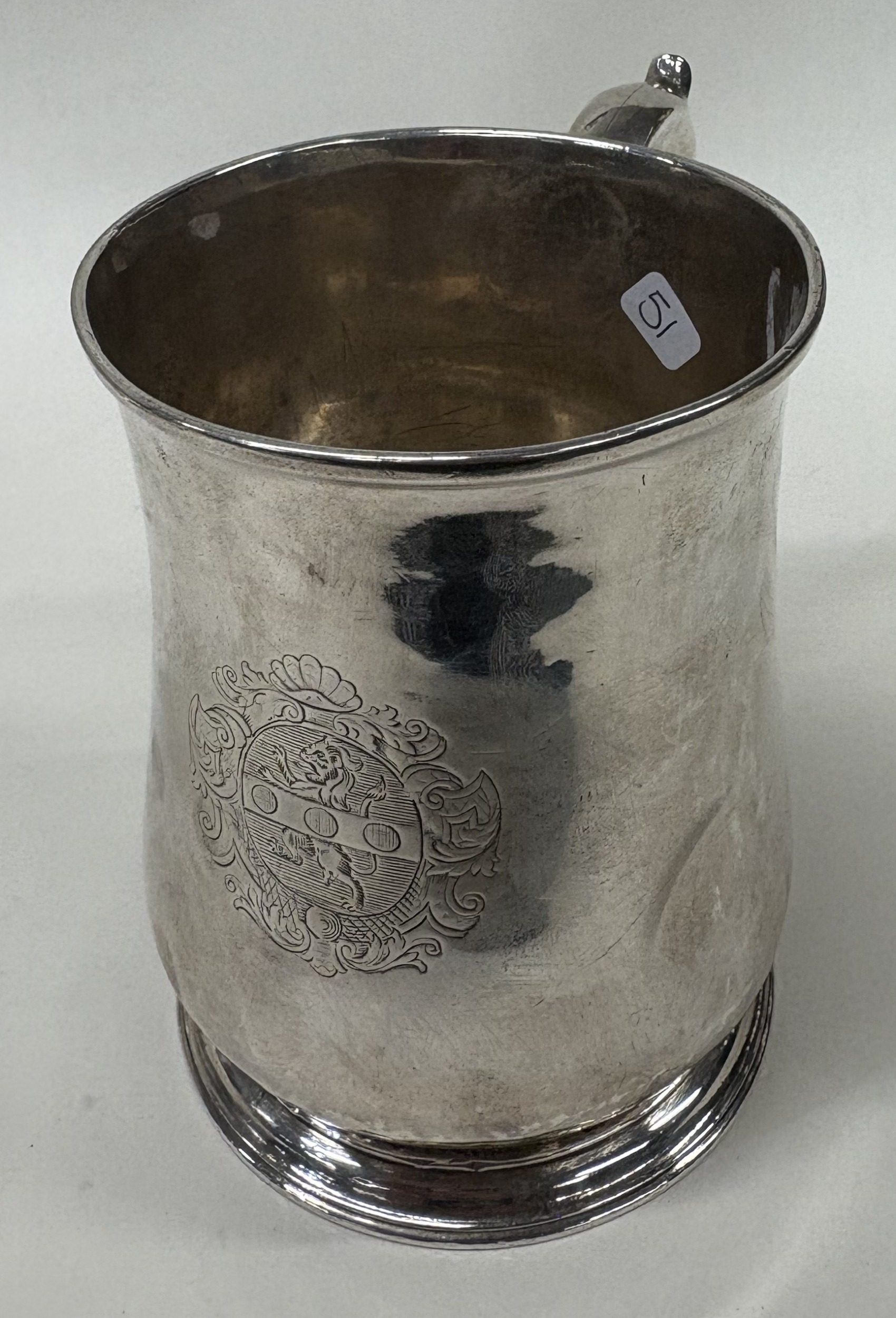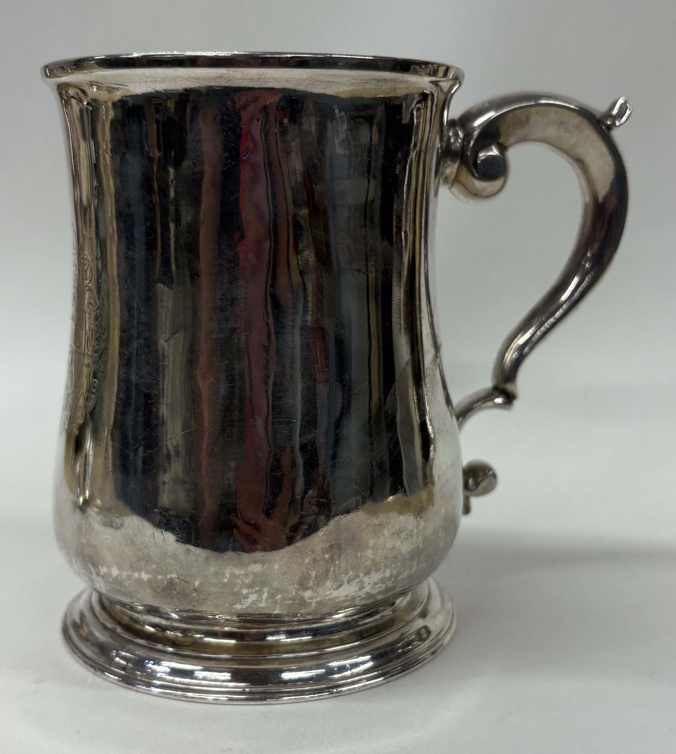 A large 18th Century silver pint mug with coat of arms to centre. London 1732. By Thomas Mason. Approx. 381 grams. Est. £800 - £1200.
