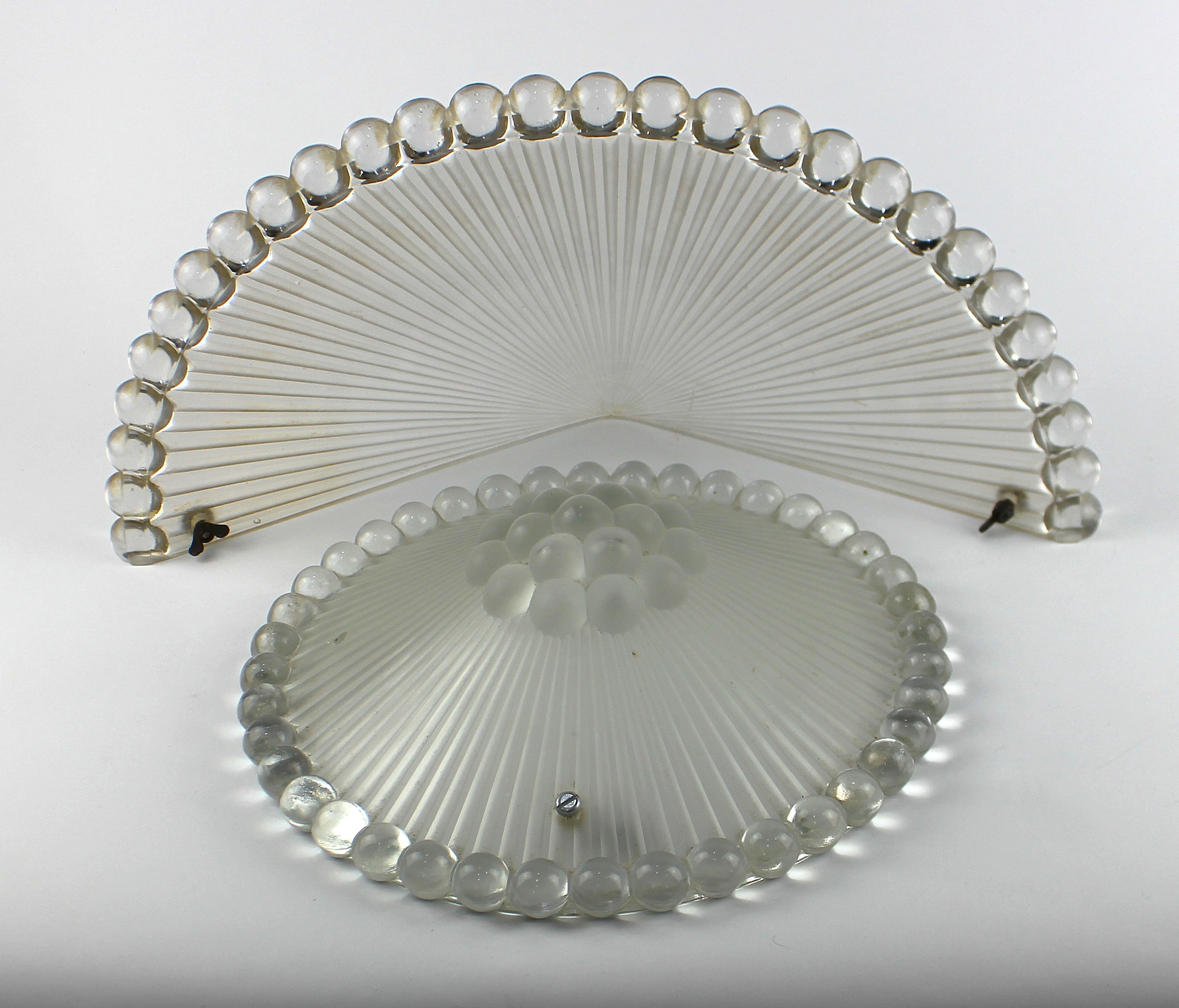 A Rene Lalique 'Perles' Art Deco glass ceiling light (29cm diameter), and a matching wall light (46cm wide), both signed 'R LALIQUE', (2).