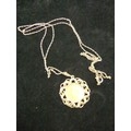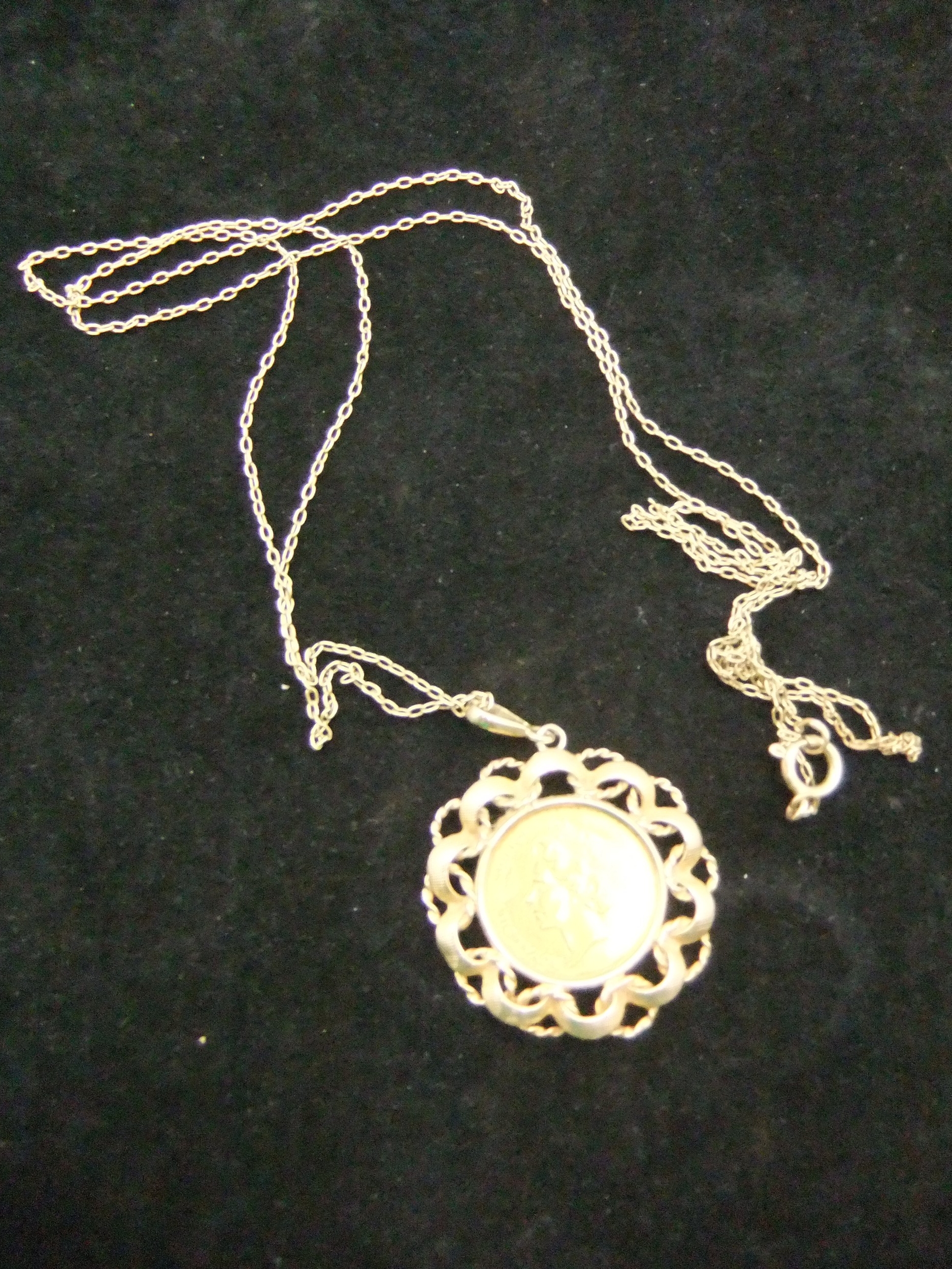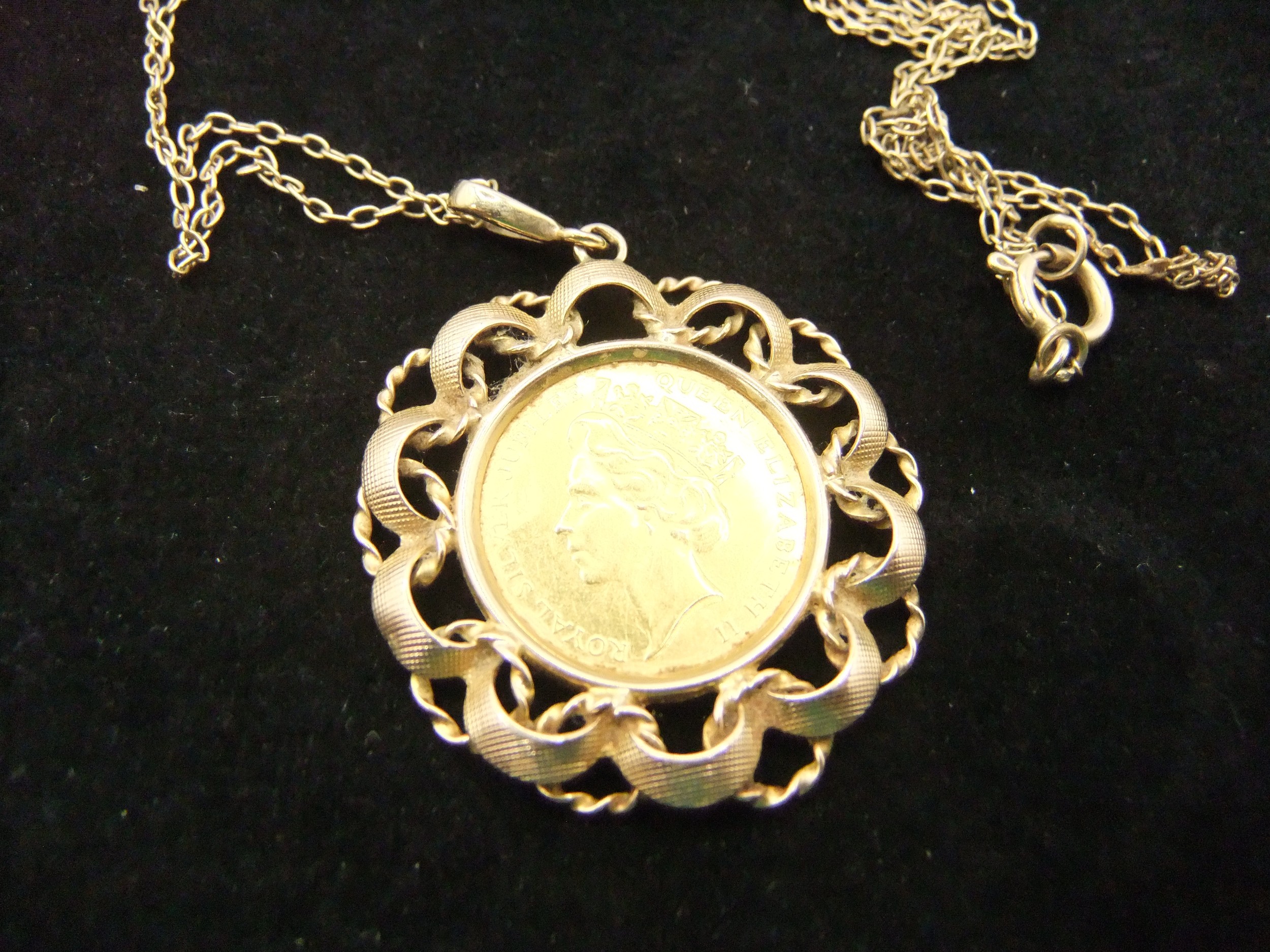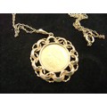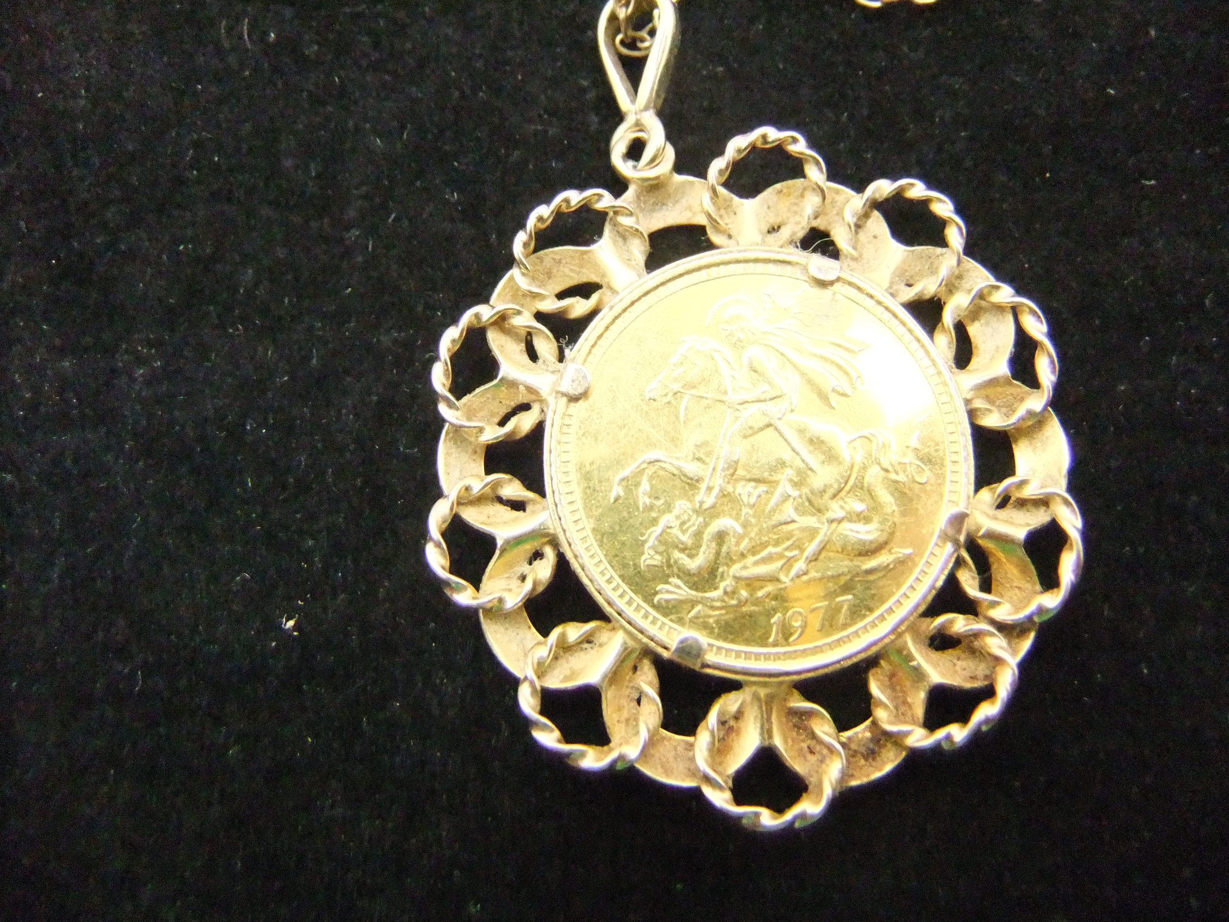 A 1977 9 carat medallion in the form of a half sovereign in pendant mount on 9 carat chain, total approx weight 7.35g