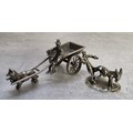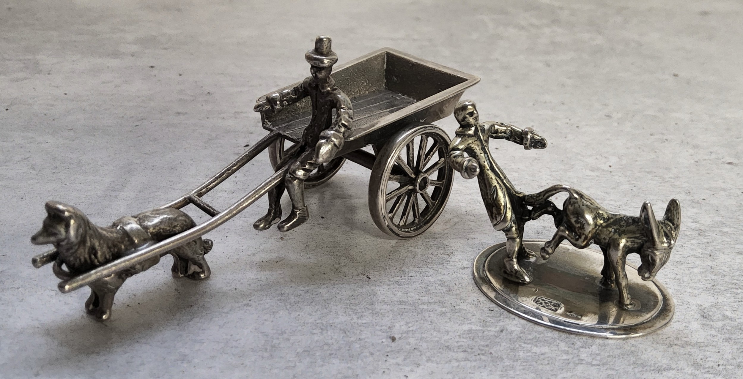 A Dutch silver comical figural group of a donkey kicking a man, stamped XXX, sword 835; another of a dog pulling a man & cart, stamped XXX, sword 835 37.96g