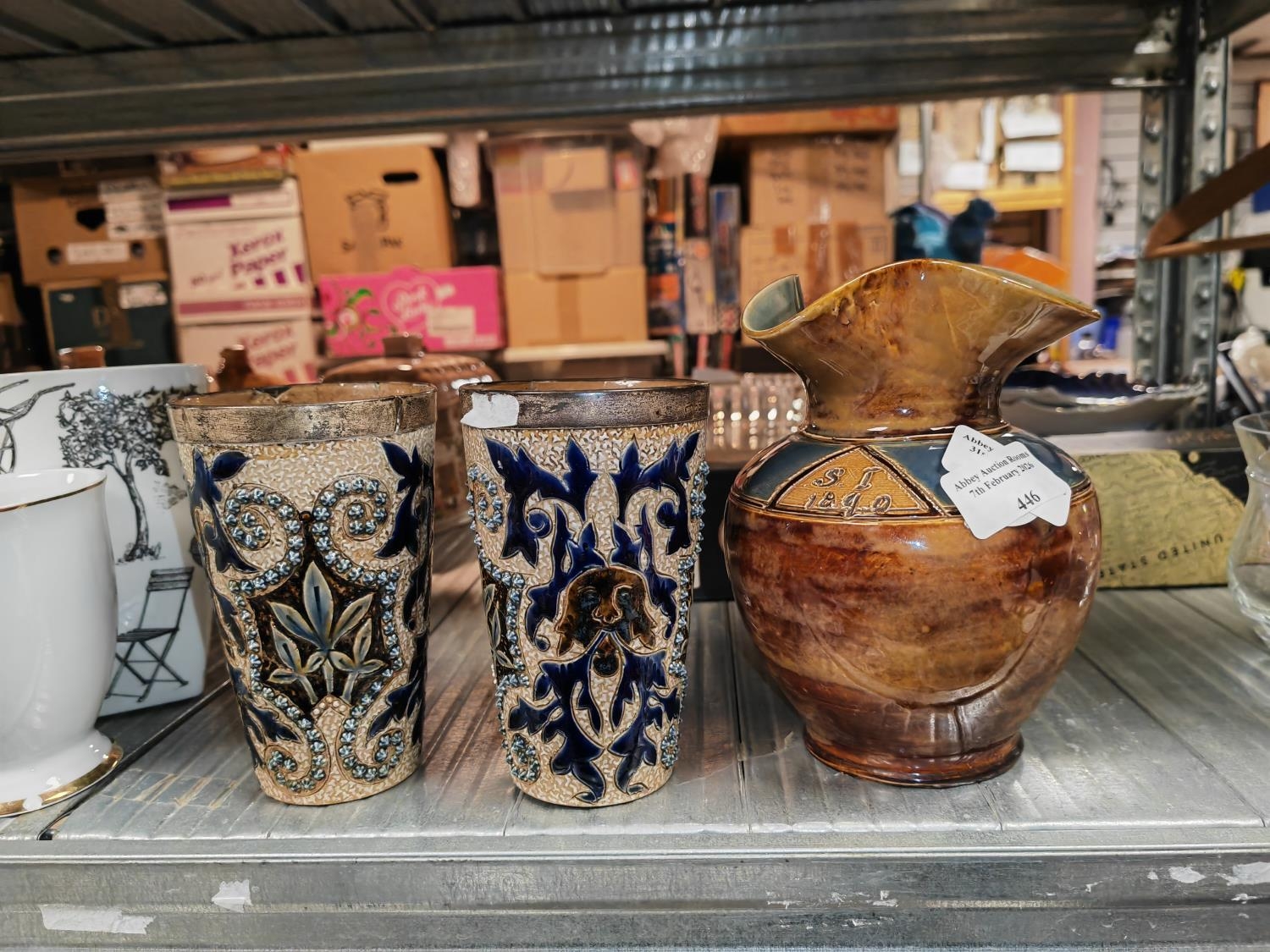 Royal Doulton Vase 1890 Plus 2 Silver Rimmed Beakers Both A/F