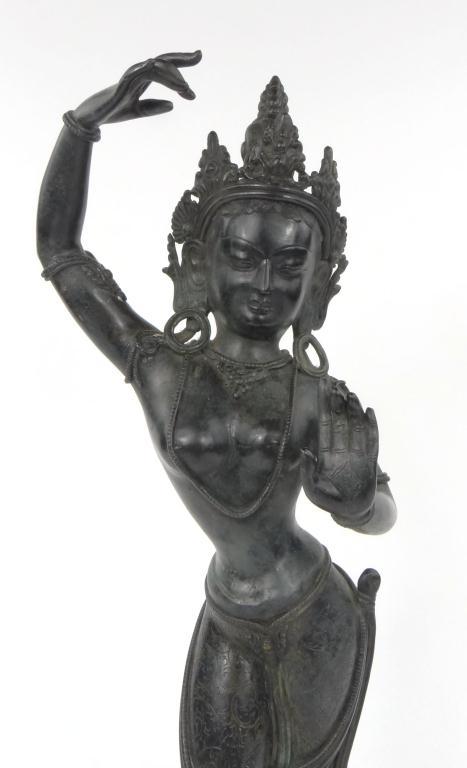 Large Far Eastern patinated bronze figure of a dancer with chased decoration to the dress, 53cm high