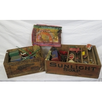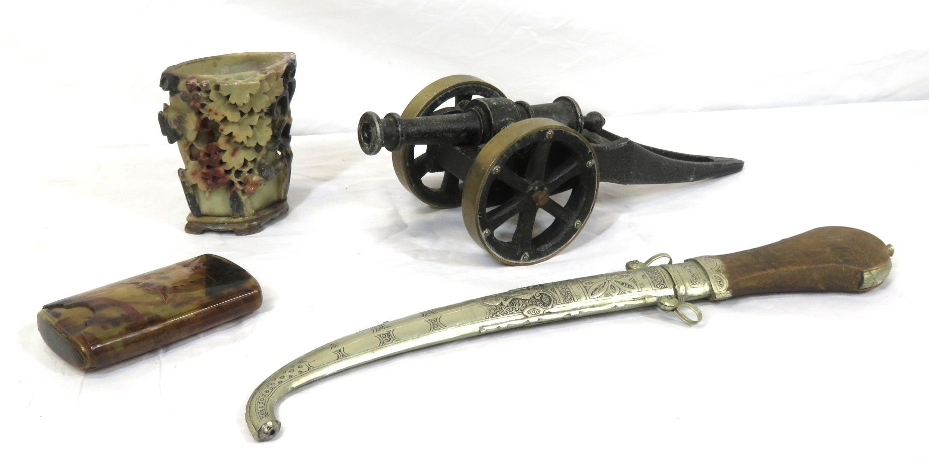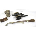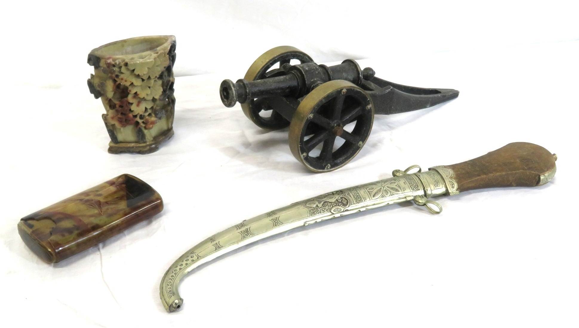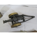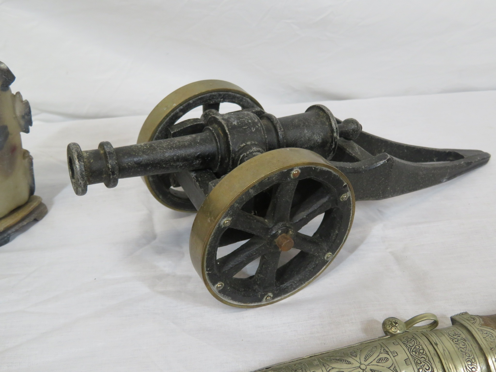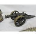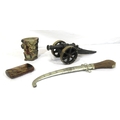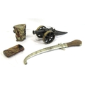 Various items in box - model cannon, vase, etc