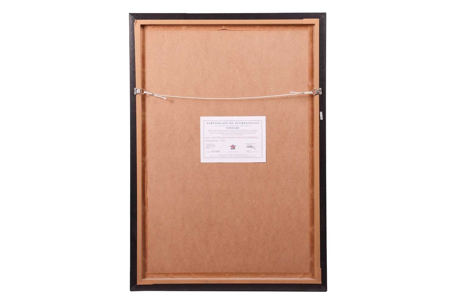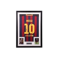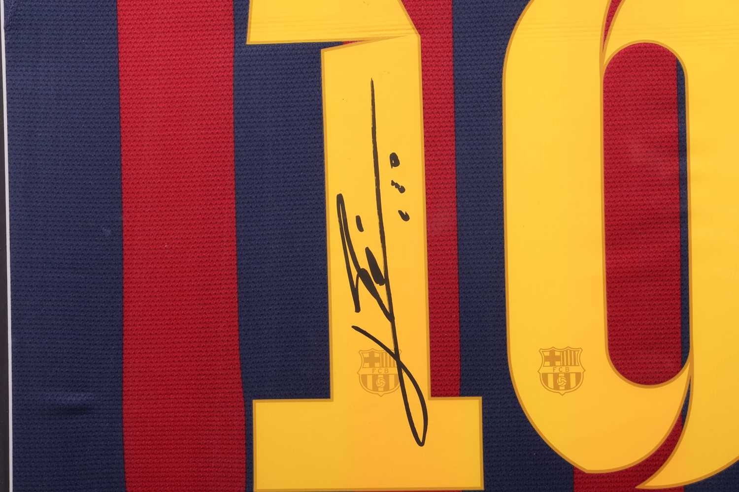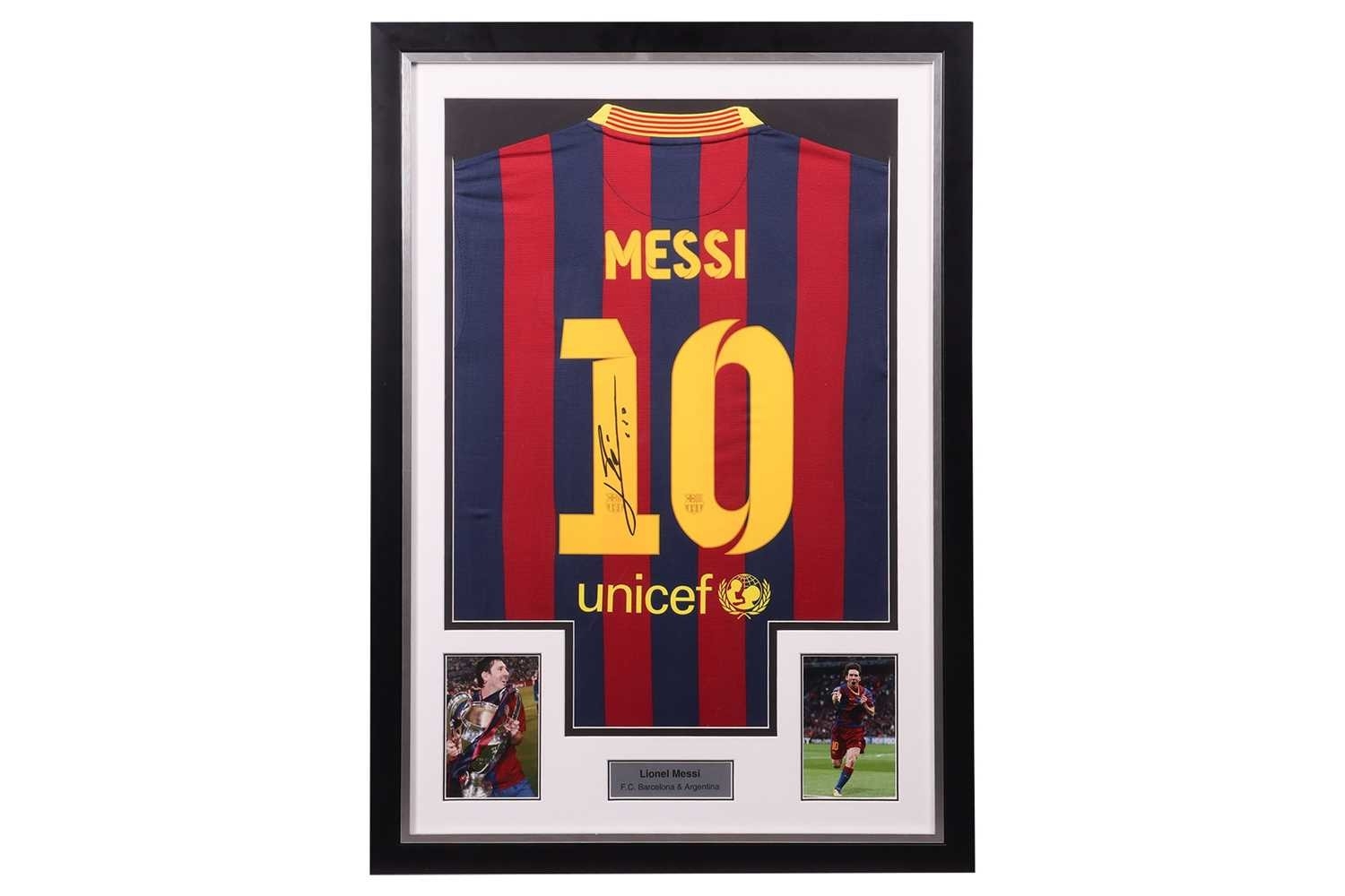 Lionel Messi, a signed Barcelona framed football shirt, the autograph in black marker to the rear number, presented with two colour photographs, with Certificate of Authenticity to the rear, the frame 89 cm x 64 cm. Purchased by the vendor from a Sporting Charity Auction.