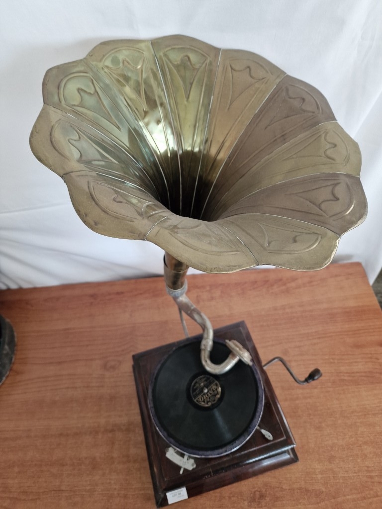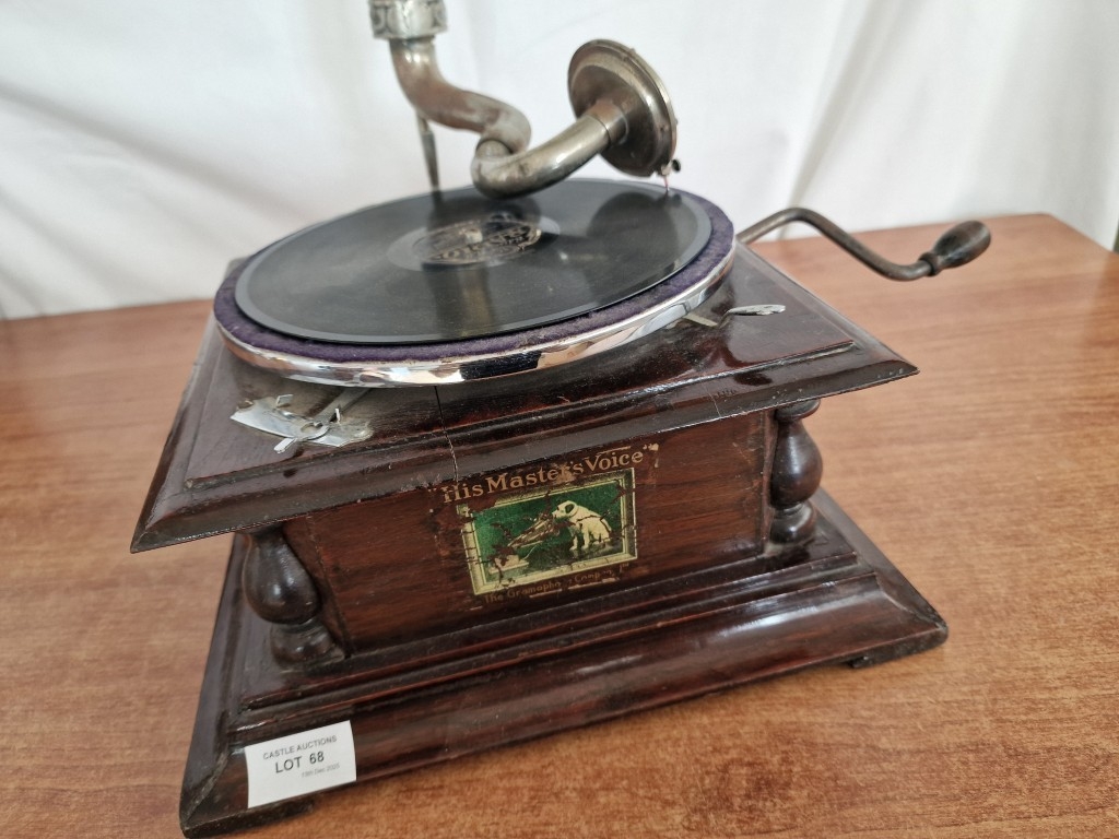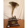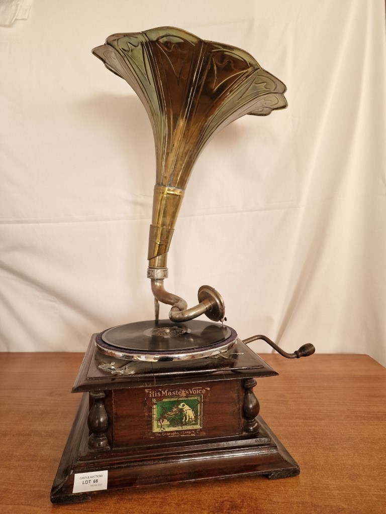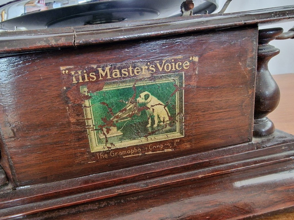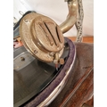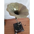 HMV (His Master's Voice) Horn Gramophone with Wooden Base, Made in England, * Basic Test, Winds Up & Running, Brake & Speed Okay, Needs Attention to Play Music *