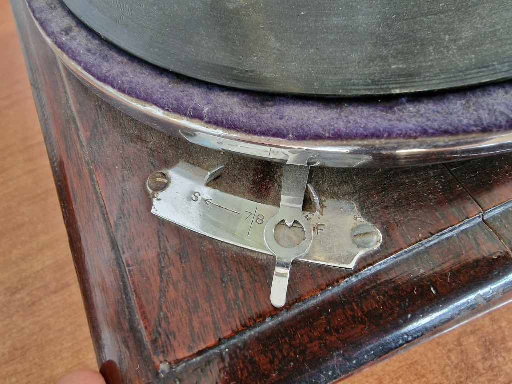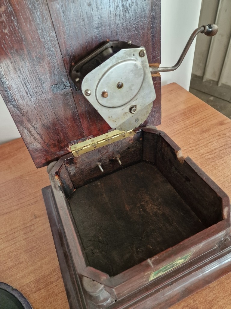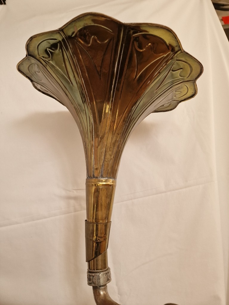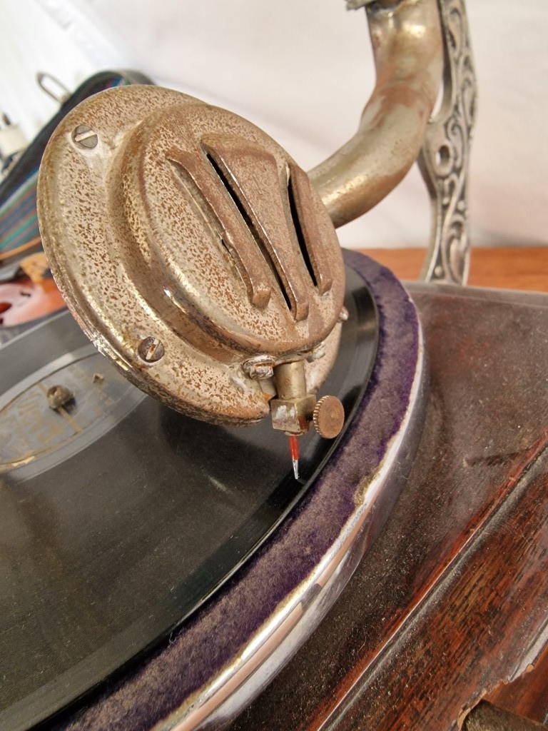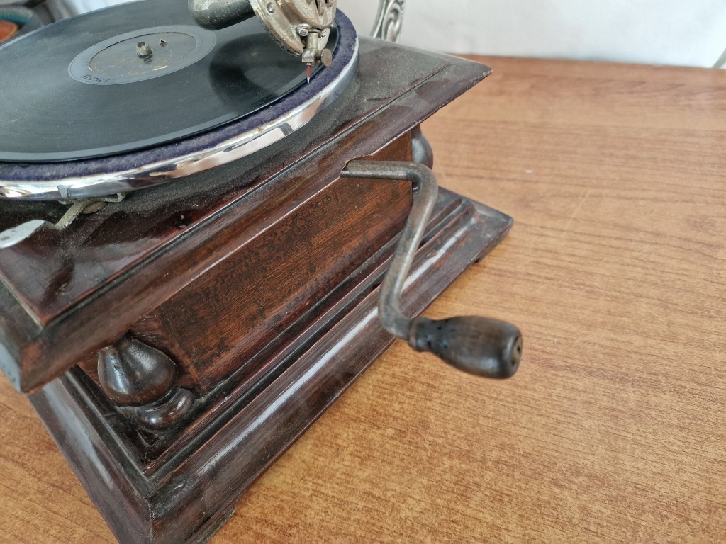 HMV (His Master's Voice) Horn Gramophone with Wooden Base, Made in England, * Basic Test, Winds Up & Running, Brake & Speed Okay, Needs Attention to Play Music *