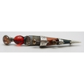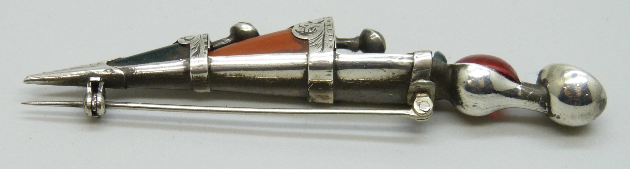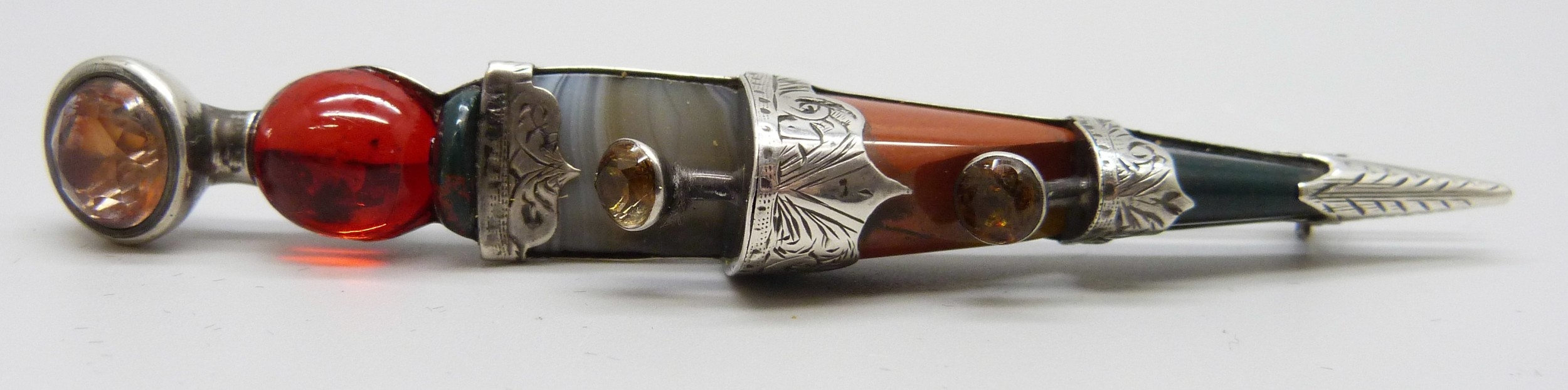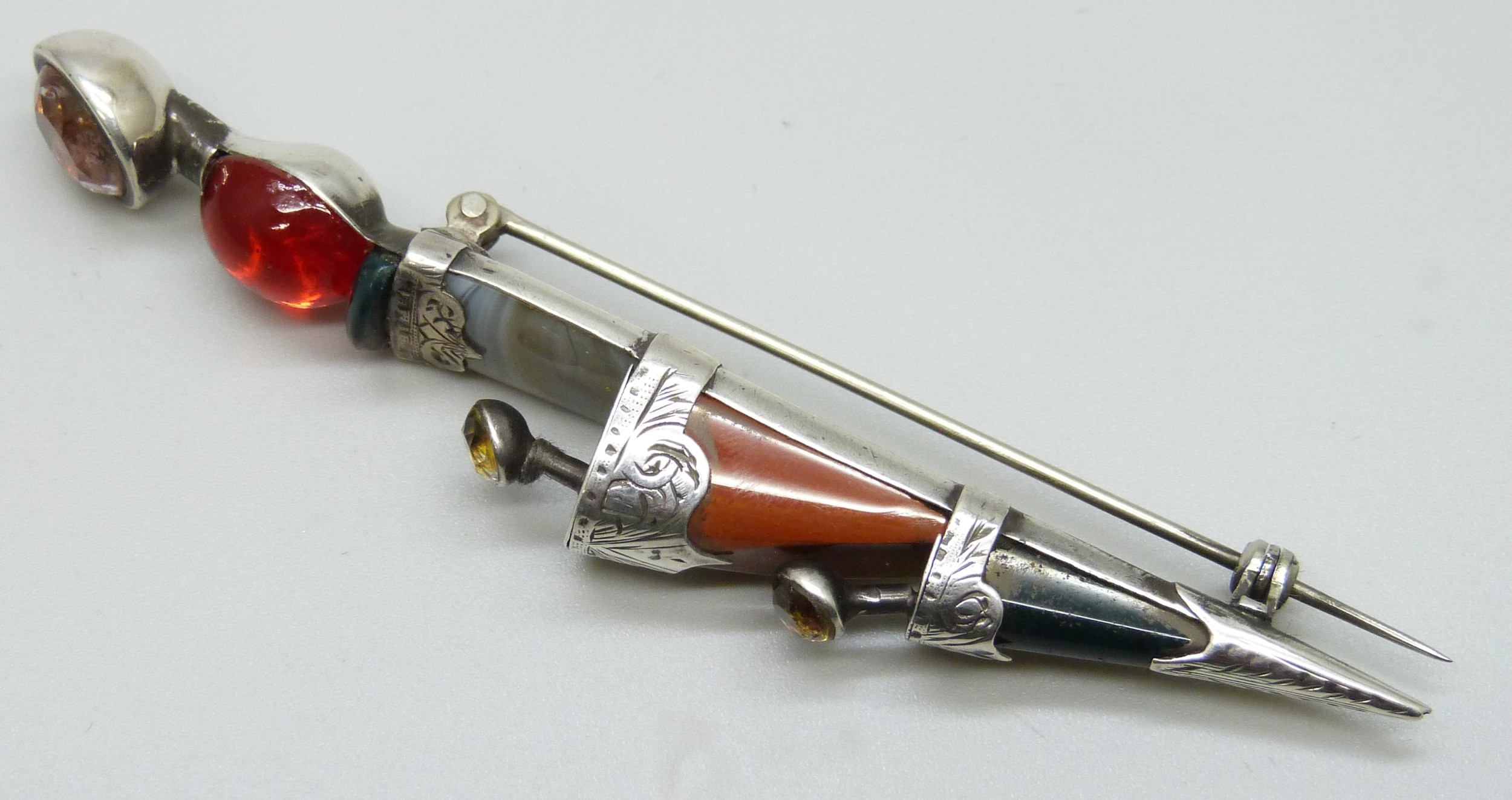 A Scottish white metal, agate and gemstone Dirk brooch, 9cm, 14g