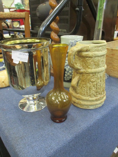 2 POTTERY JUGS, AMBER BUD VASE AND OVERSIZED GOBLET