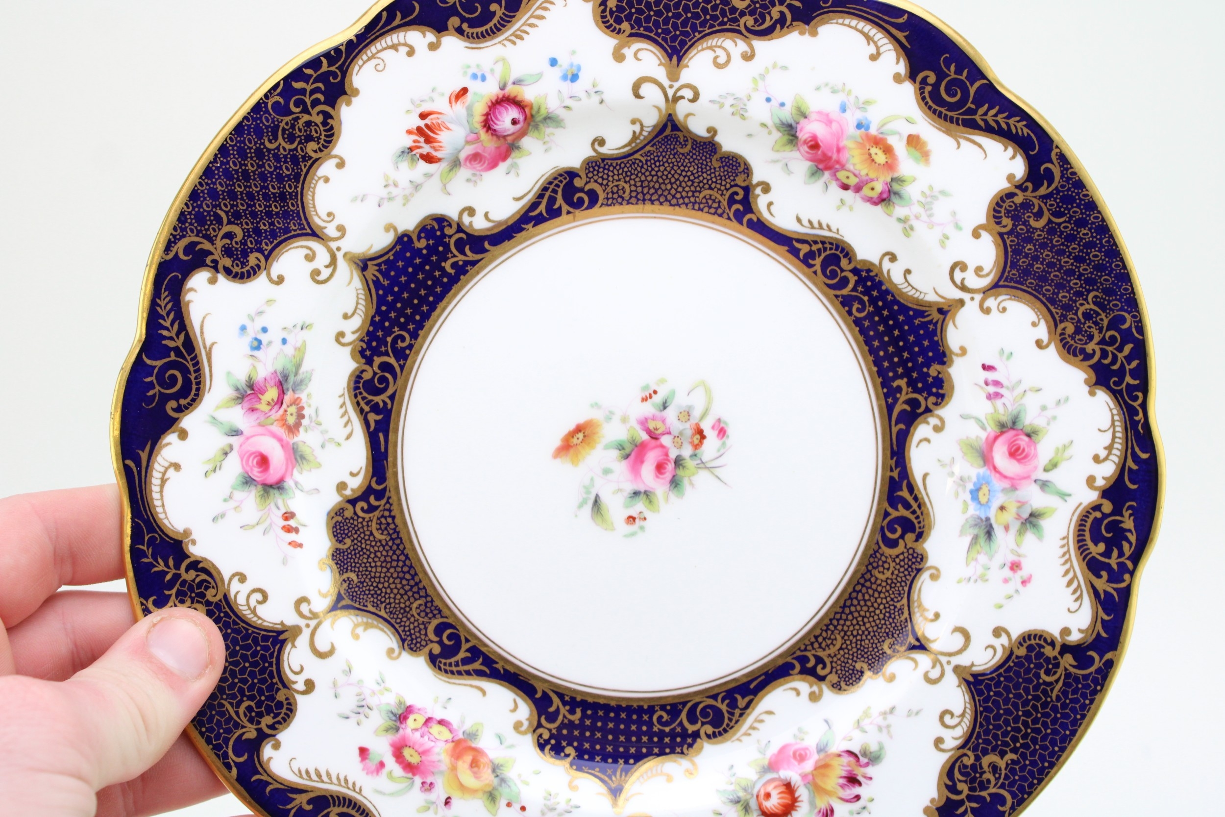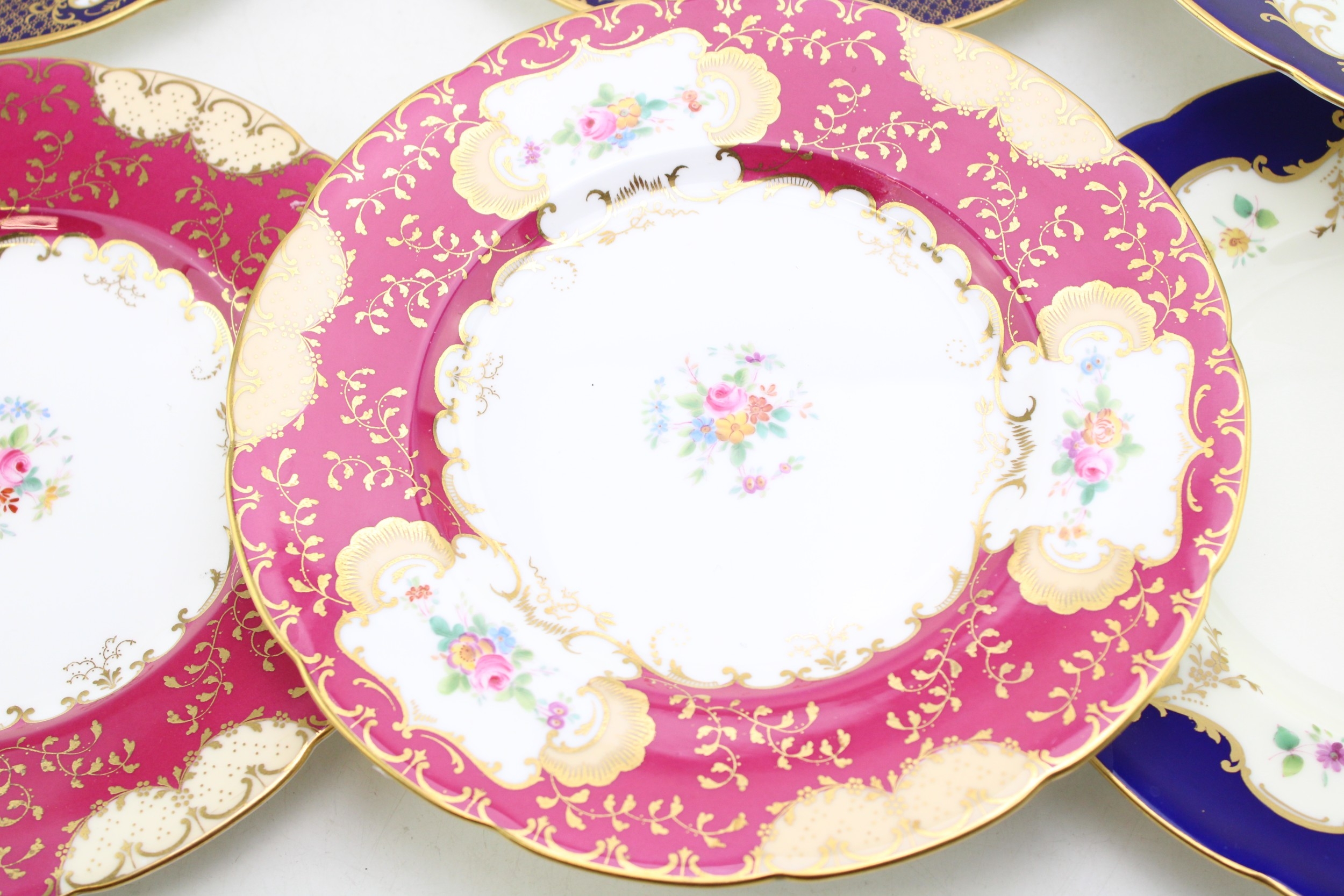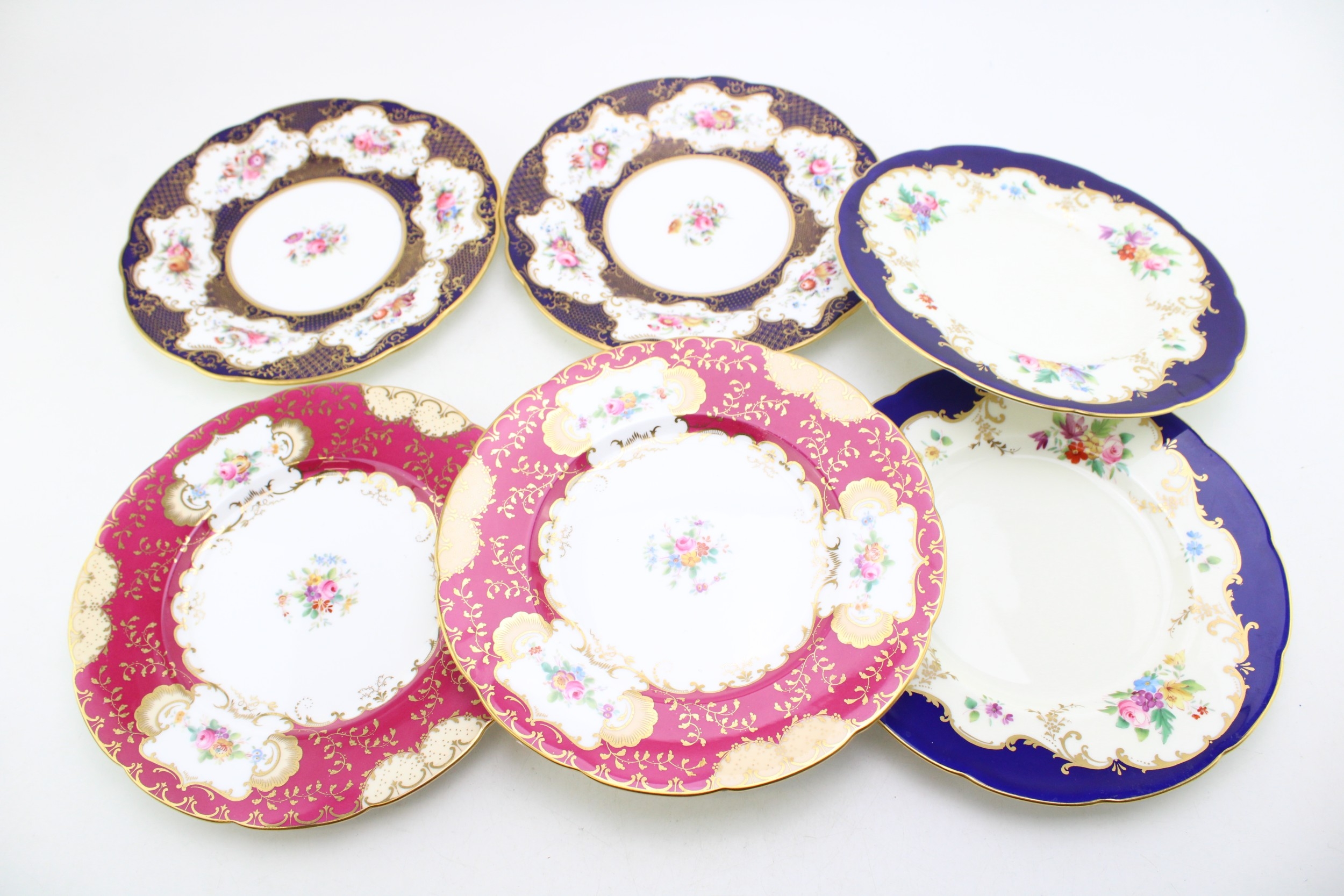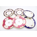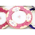 Four Minton and two Coalport plates, 6710/C, H4312 and H4312, cobalt blue, blue and pink ground with gilt decoration, 23cm diameter, to include two Coalport plated retailed by Stonier & Co, Liverpool, (6).