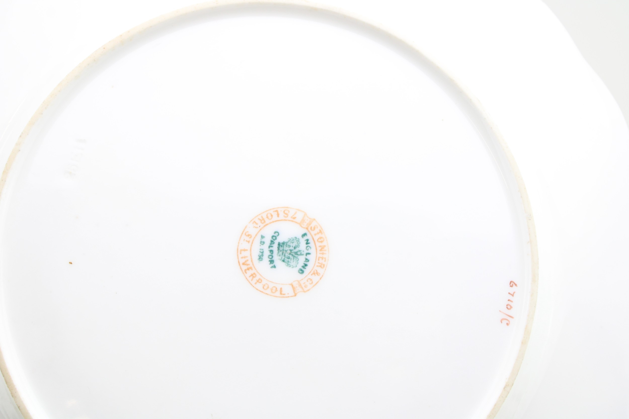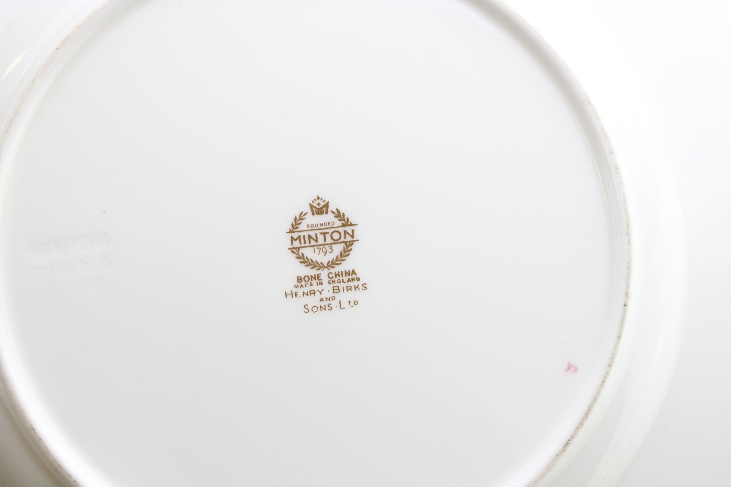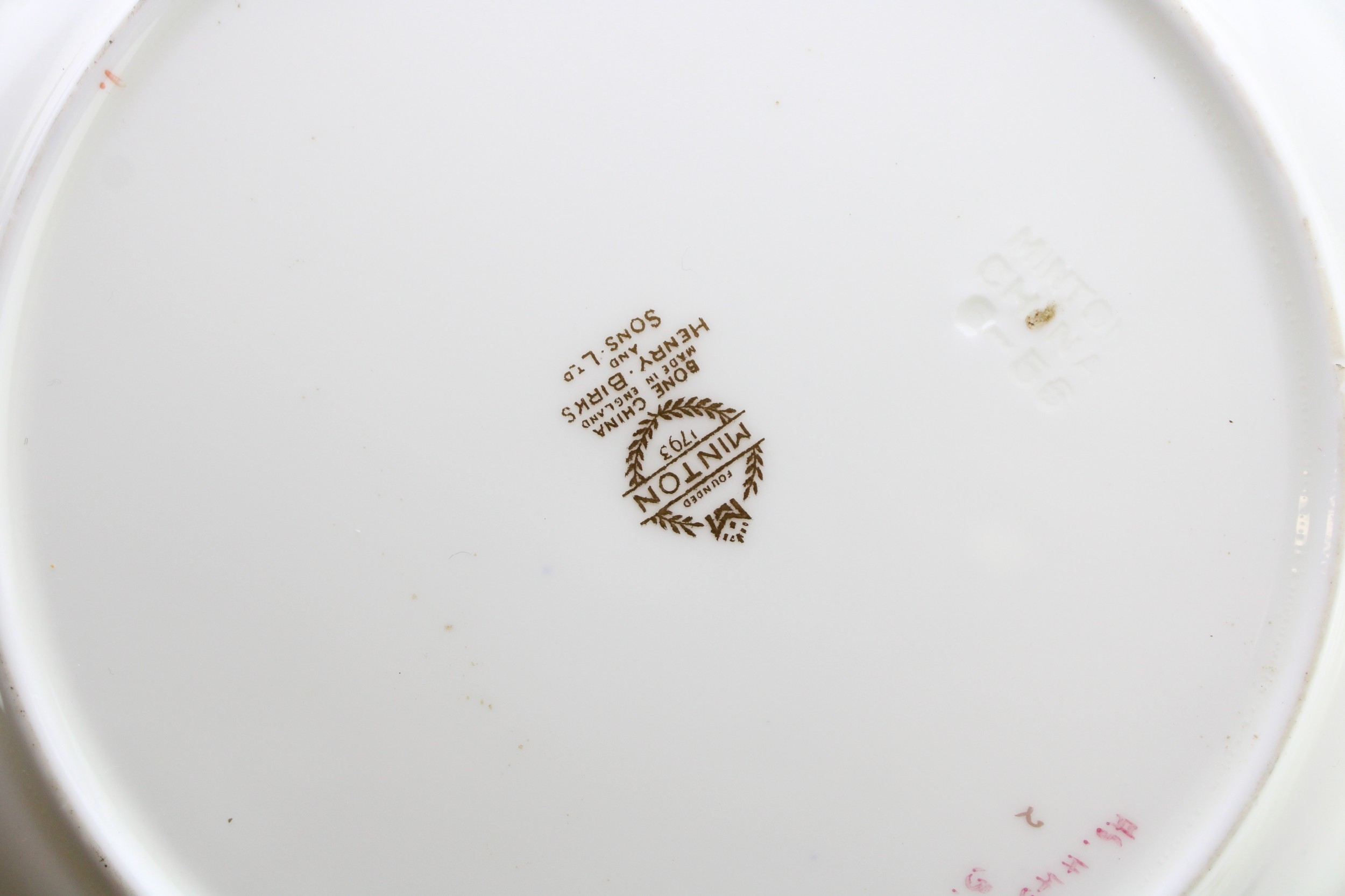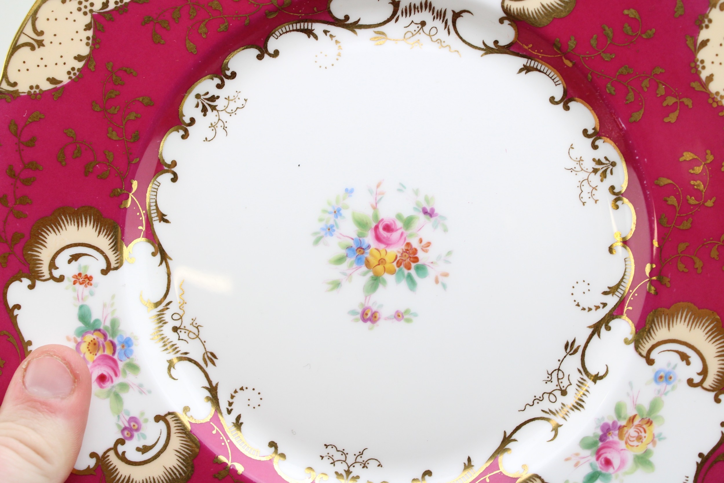Four Minton and two Coalport plates, 6710/C, H4312 and H4312, cobalt blue, blue and pink ground with gilt decoration, 23cm diameter, to include two Coalport plated retailed by Stonier & Co, Liverpool, (6).