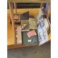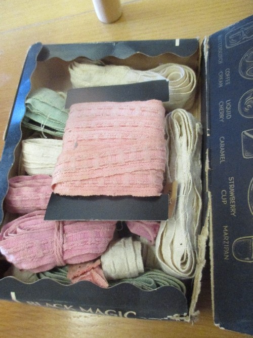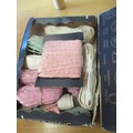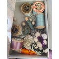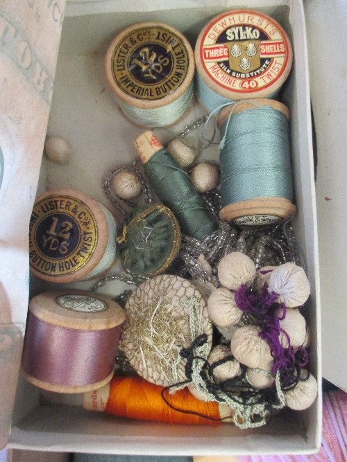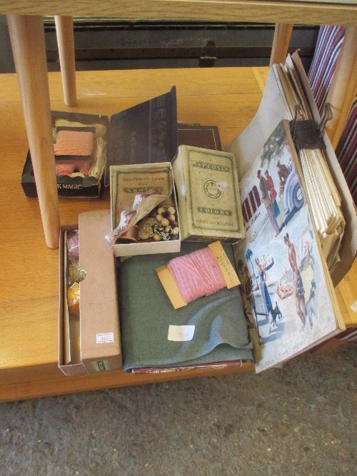 INTERESTING VINTAGE LOT FROM A TAILOR'S WORKSHOP INC PART ROLL OF PALE BLUE FABRIC, TAPES, REELS OF COTTON & SILKS. J & P COATS BOX, QUANTITY OF SUIT PATTERNS, 1951 MAGAZINE "MAN AND HIS CLOTHES"