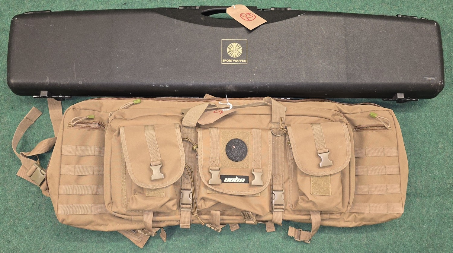 A Sportwaffen hard plastic rifle case together with a soft carry gun case (REF E5, E32).