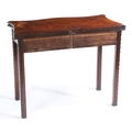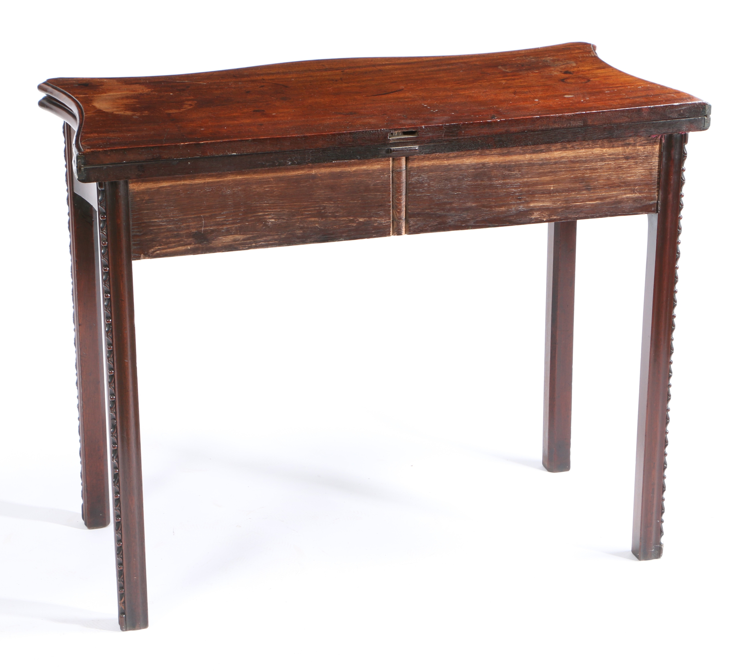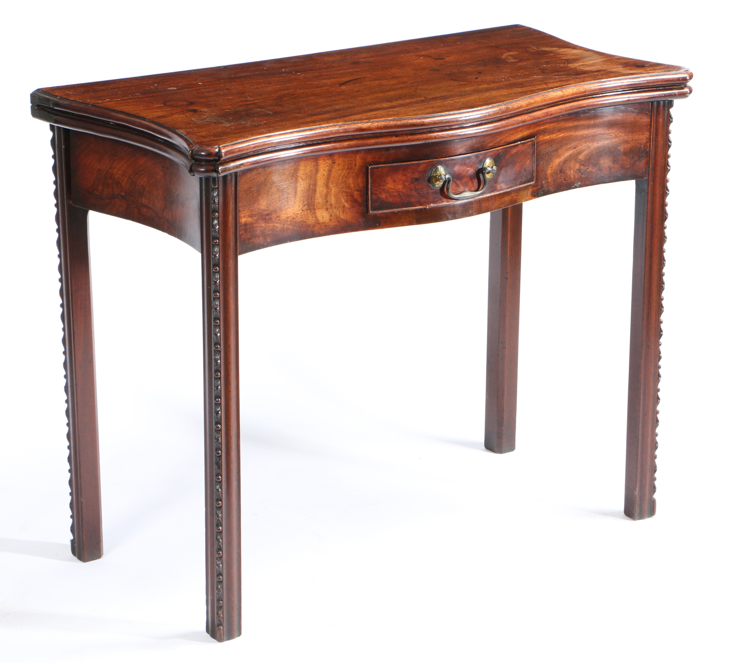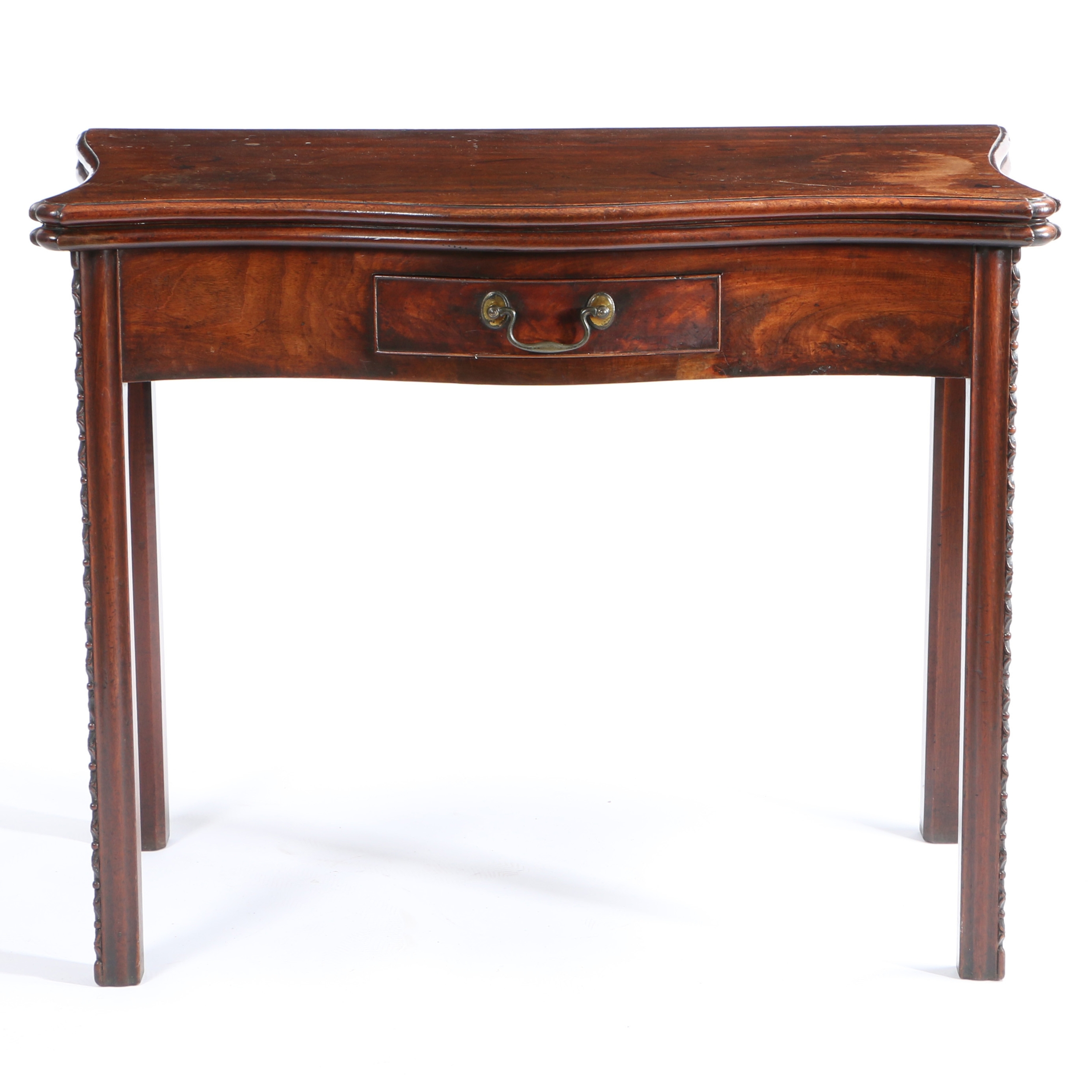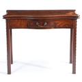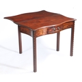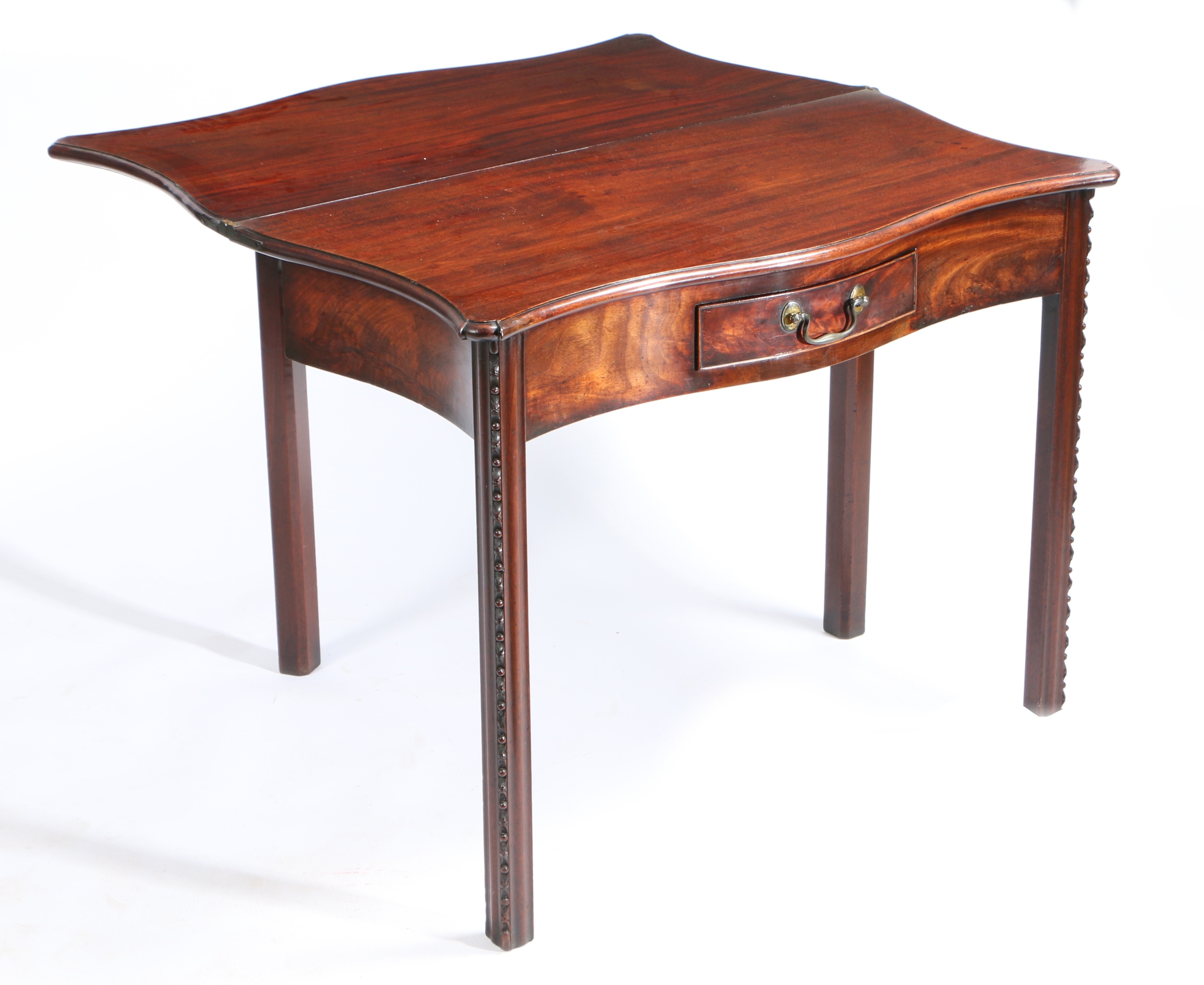 A 19TH CENTURY MAHOGANY CHIPPENDALE STYLE TEA TABLE. of serpentine form, having a single drawer to the front, raised on carved legs with repeating ball design, 89cm wide, 72cm high.