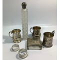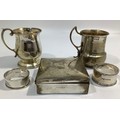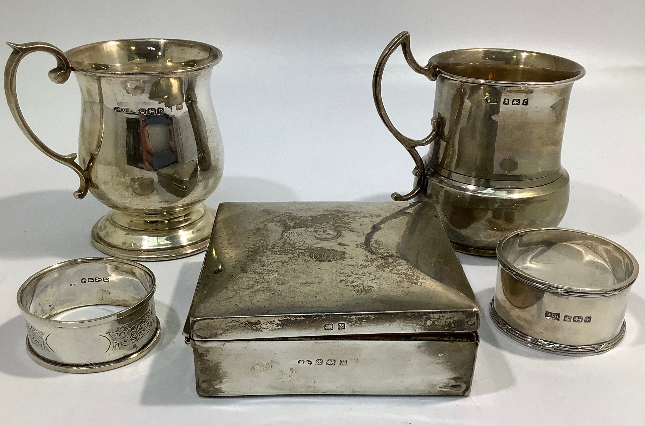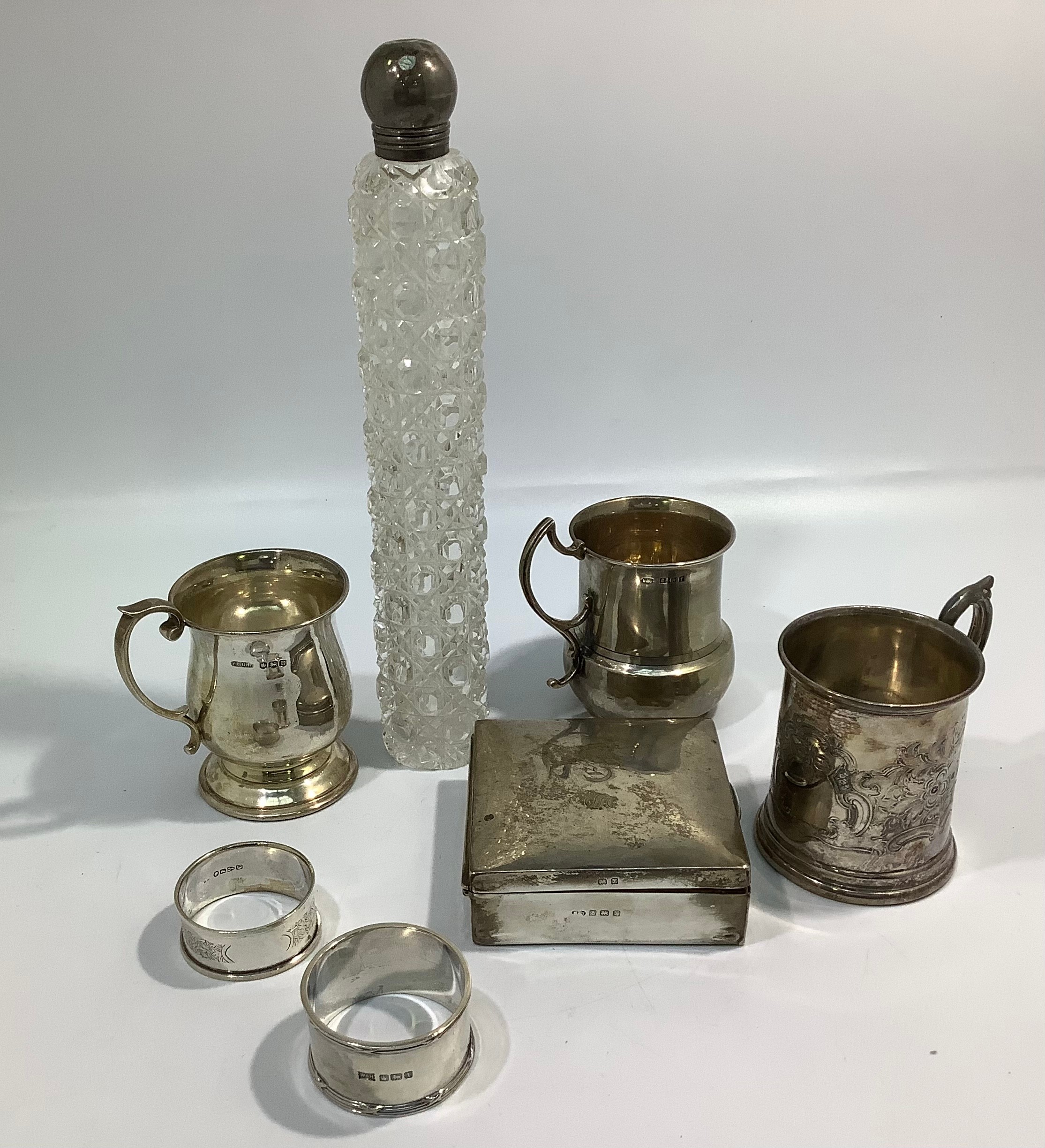 A small collection of assorted silver items including a cigarette box, two small tankards including one by Fenton Brothers, hallmarked Sheffield, 1944 and two napkin rings, one by Walker & Hall, together with a silver-plated tankard and a long cut glass toilette bottle with white metal top, gross weight of silver items 8.23ozt, excluding cigarette box, glass and plated items