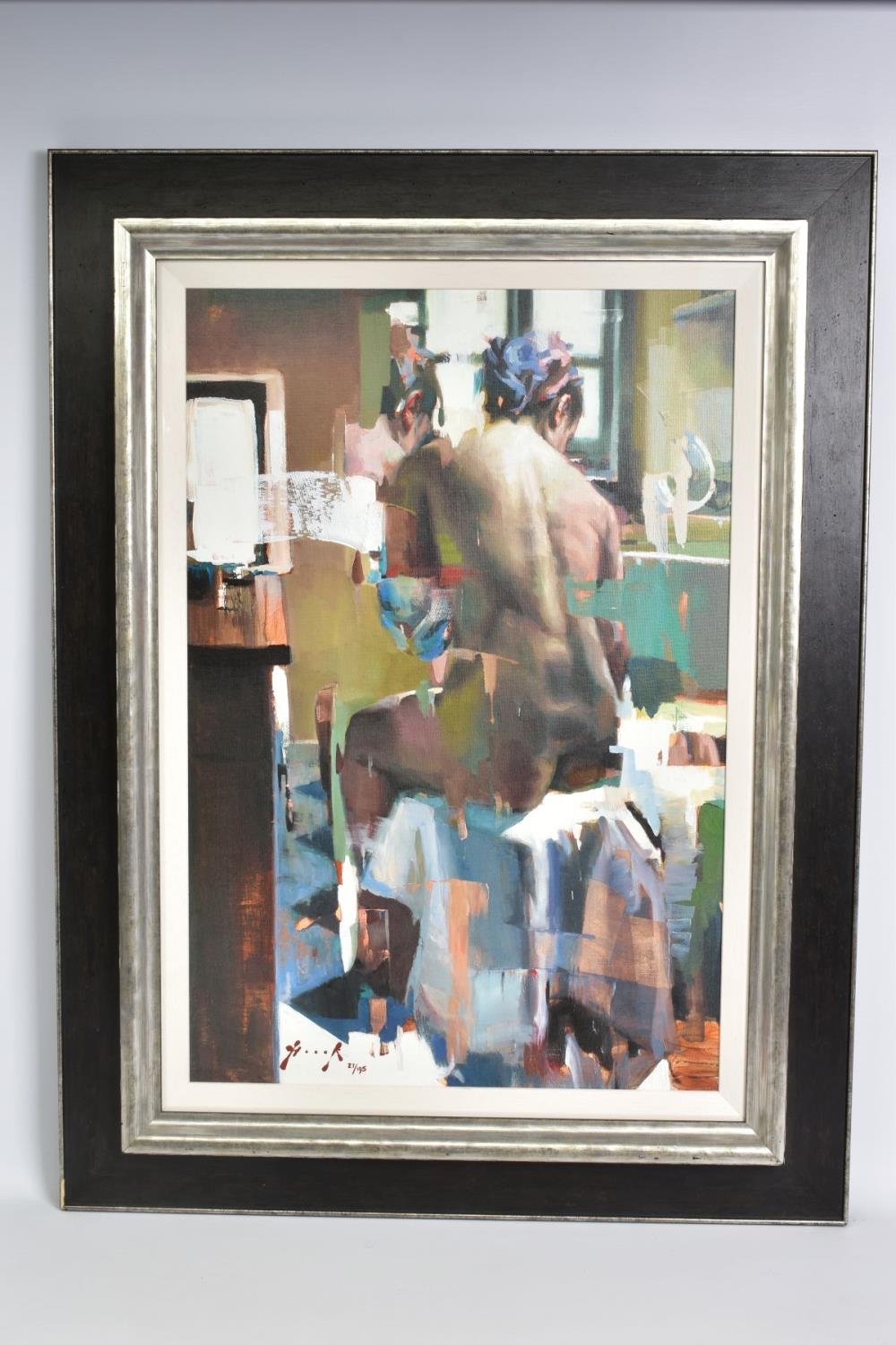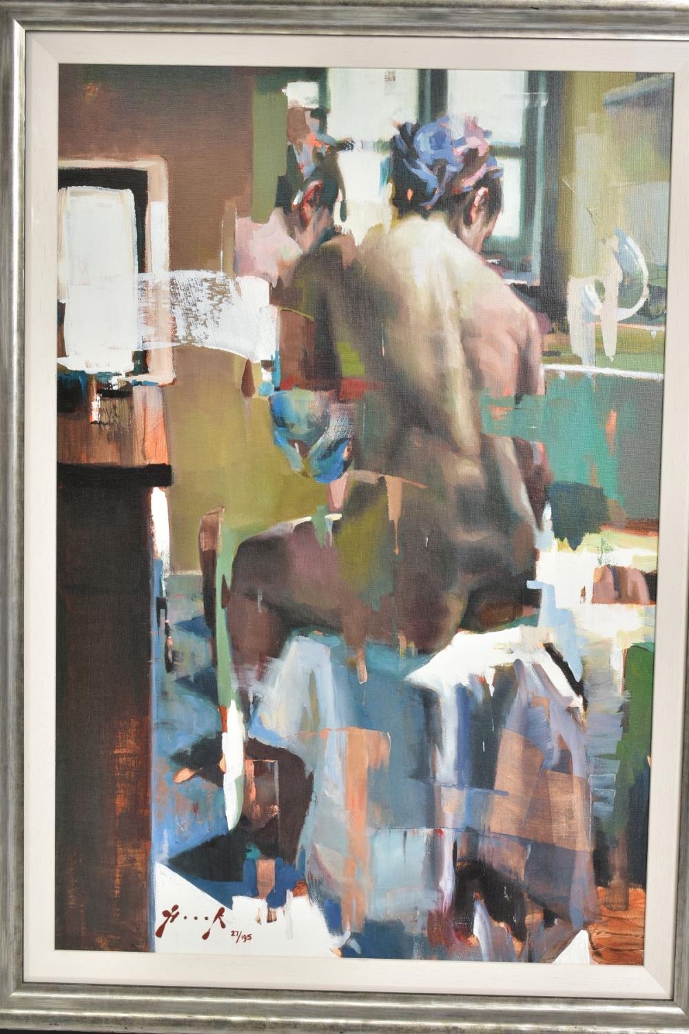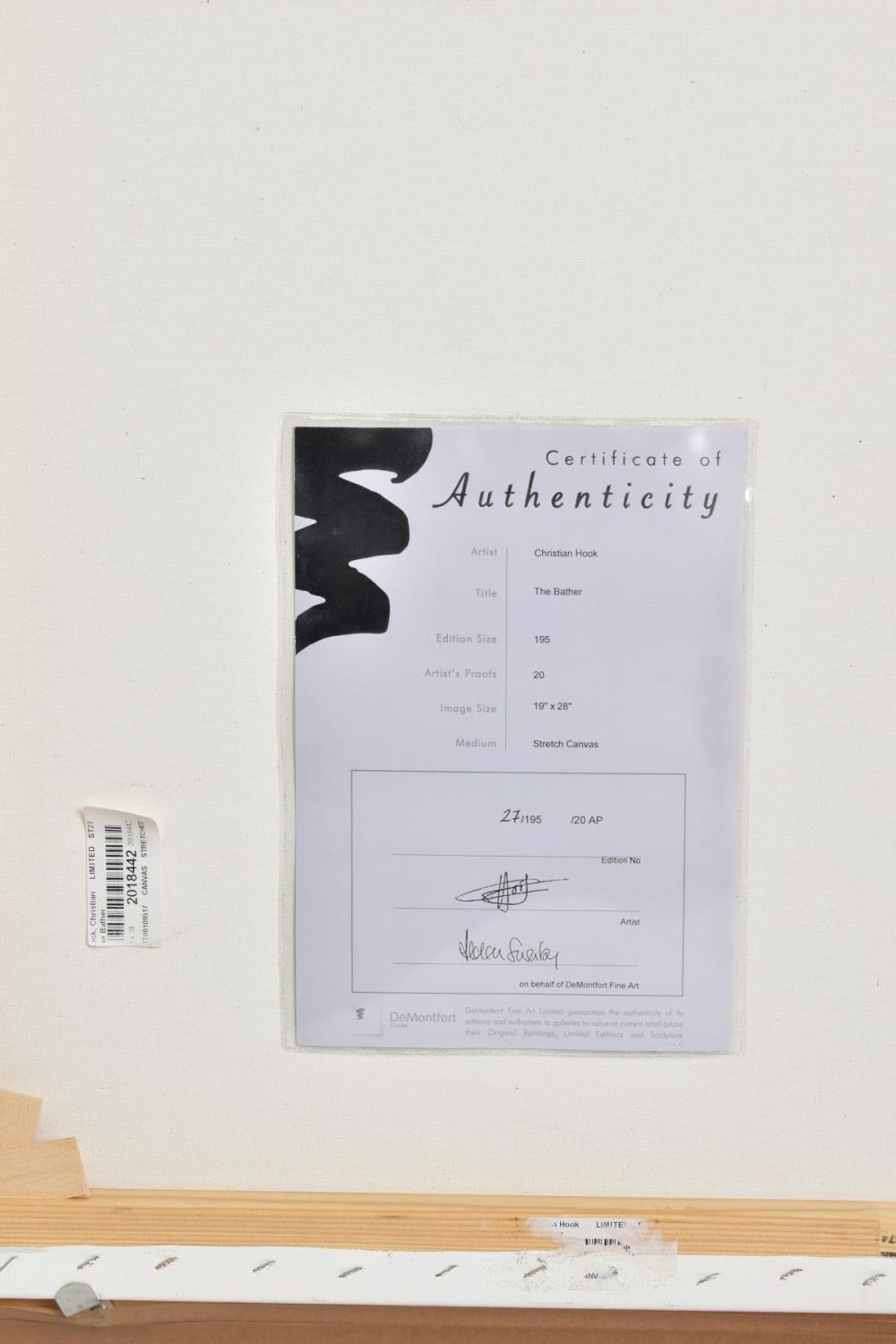 CHRISTIAN HOOK (BRITISH 1971) 'THE BATHER', a limited edition print 27/195 of a female nude study, signed bottom left, with certificate, framed, approximate sizes: image 70cm x 47cm, frame 93cm x 70cm (condition: print in good condition, frame corners are damaged) (A)