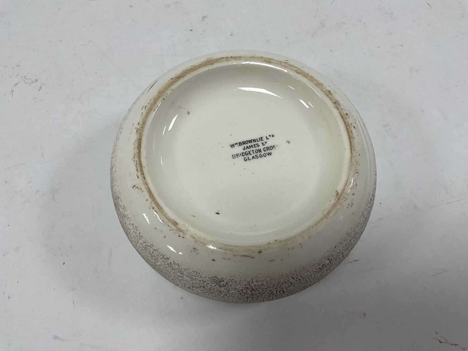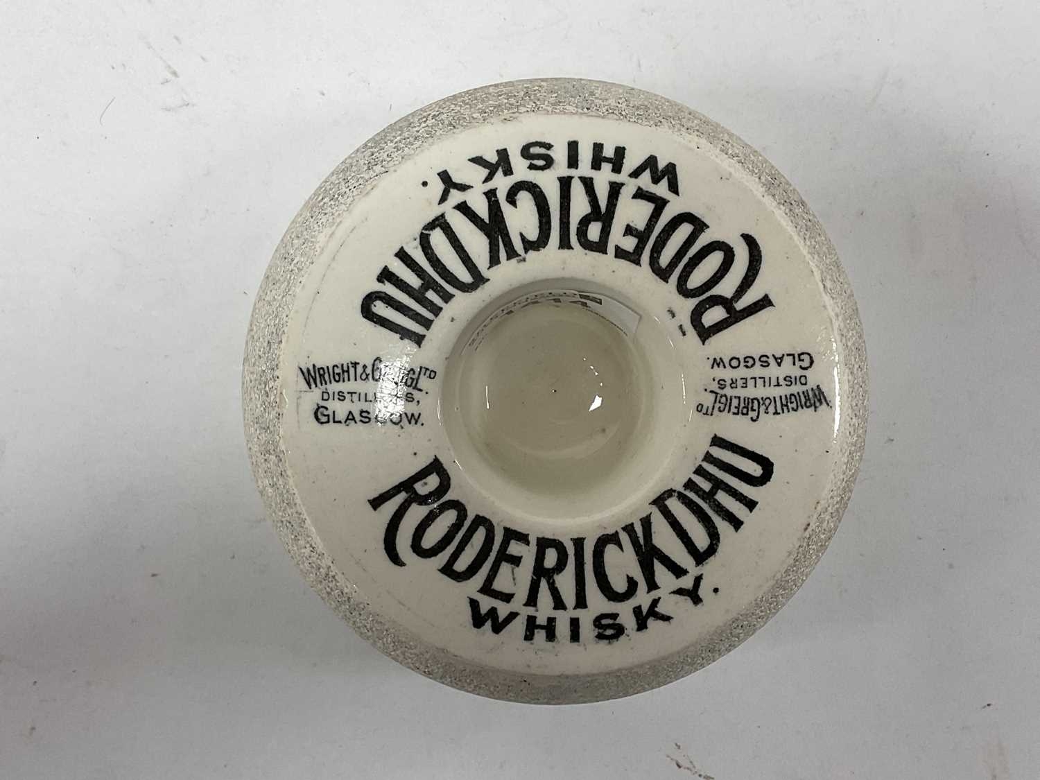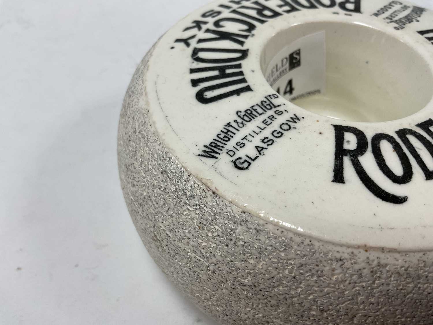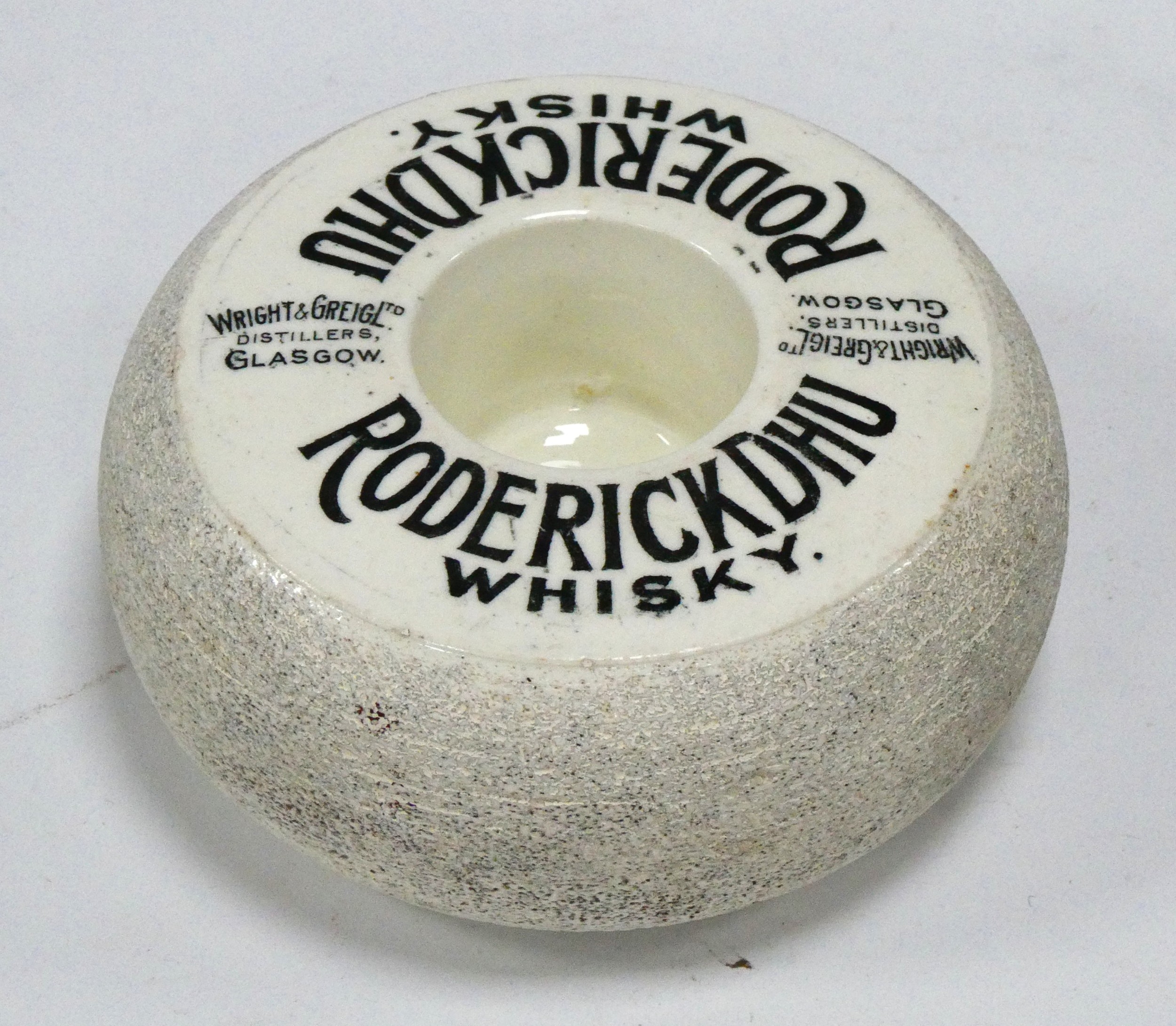 Advertising Brownlie of Glasgow Pottery Vesta Holder/Striker for Roderick Dhu Whisky, Wright & Greig, Distillers, 12cm diameter.