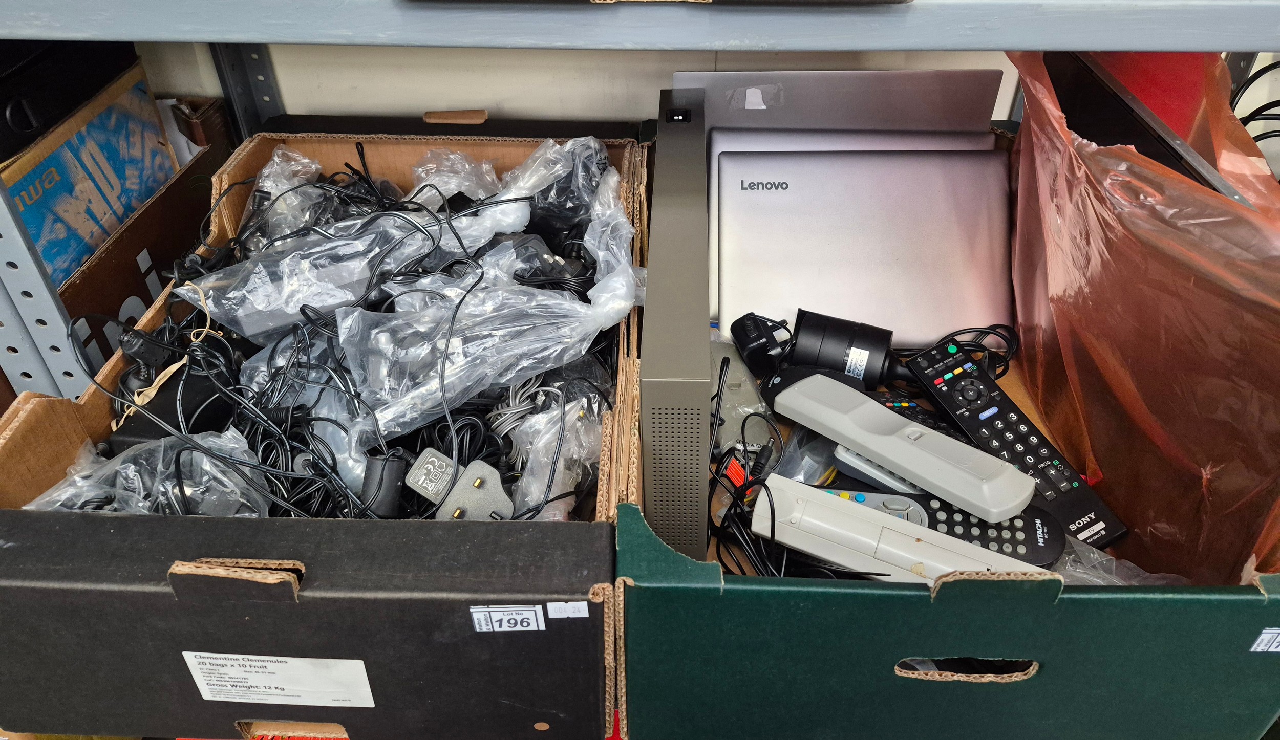 2 Boxes containing a quantity of cables and chargers, Lenovo laptops, and a CCTV security camera