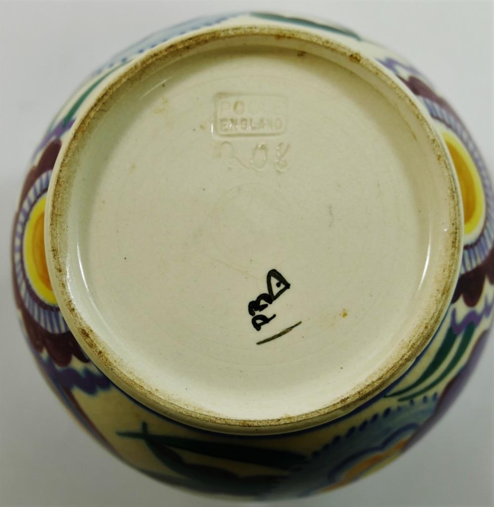 A small Poole Pottery hand painted 'bluebird' pattern vase, initialled PB, 8.5cm high