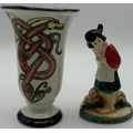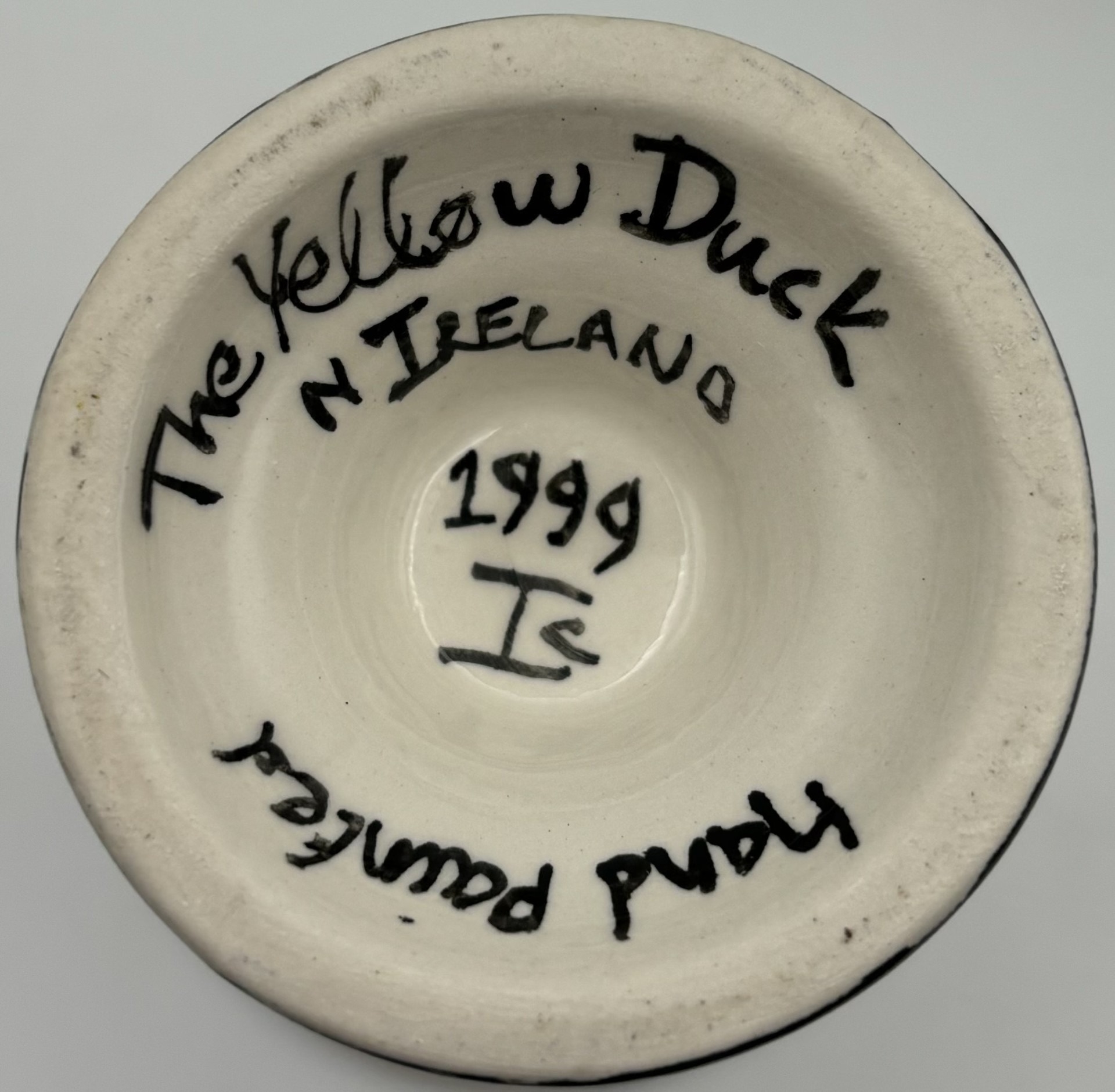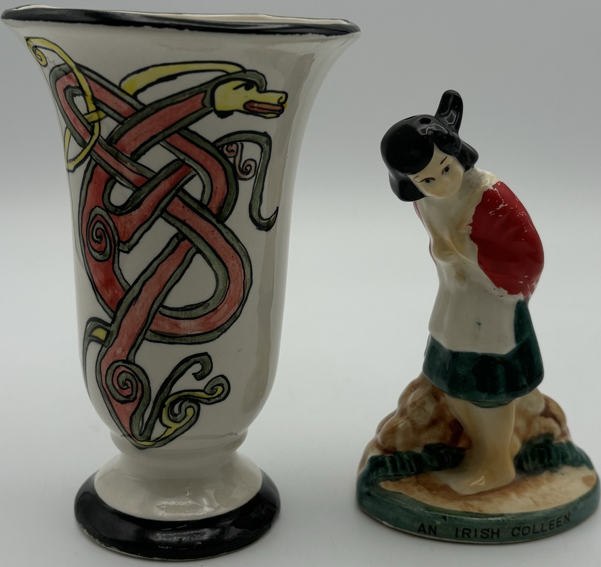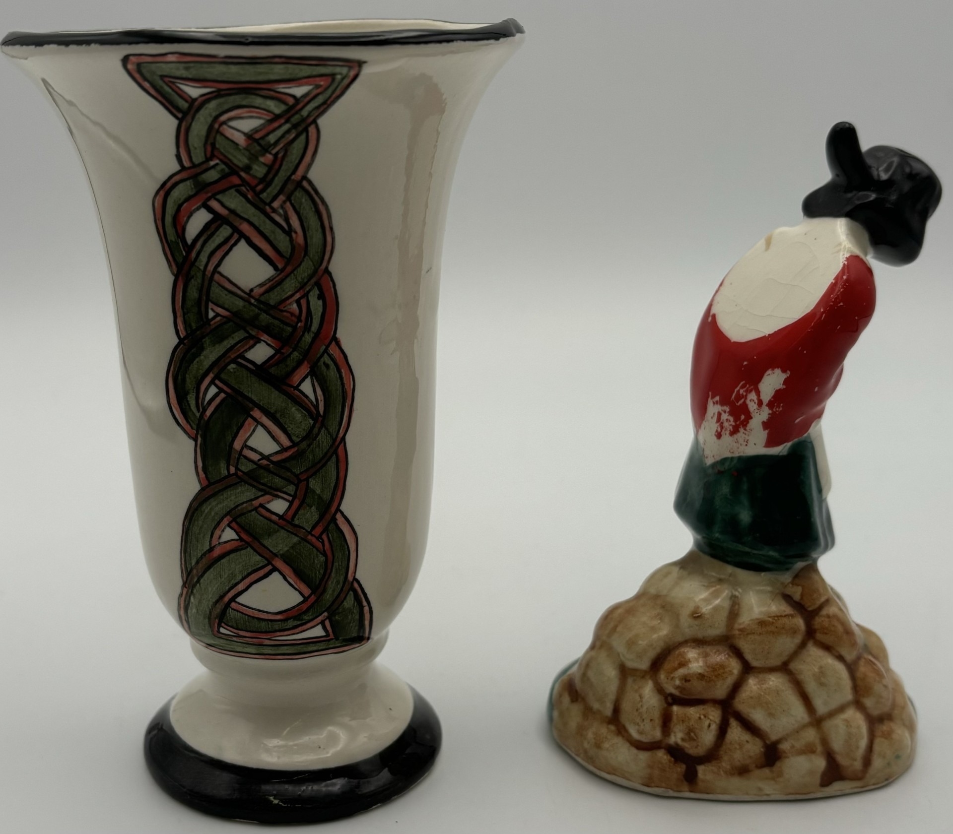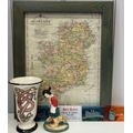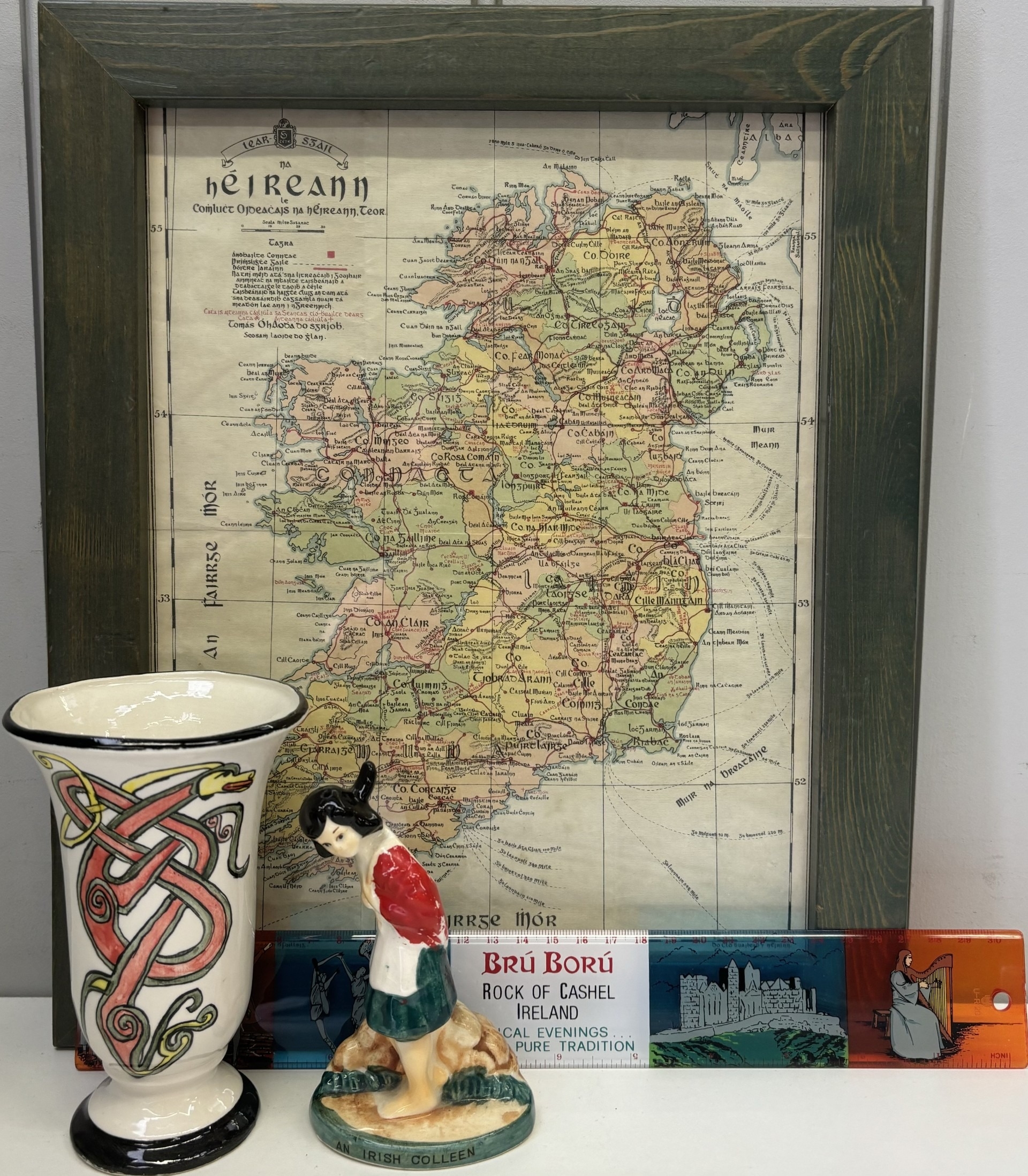 Collection of four pieces of Ireland-related home decor. To include farmed map. Bru Boru ruler, hand-painted yellow duck vase & Irish Colleen figure.