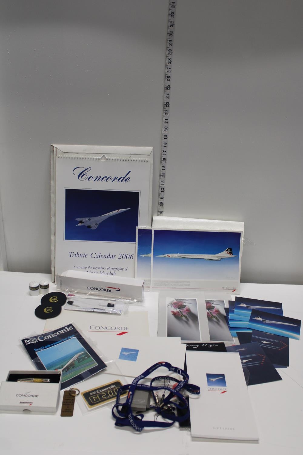 A good selection of assorted vintage Concorde ephemera etc. Including a Royal Doulton salt & pepper pot, bread plate, luggage tags & novelty Concorde ignition key ring