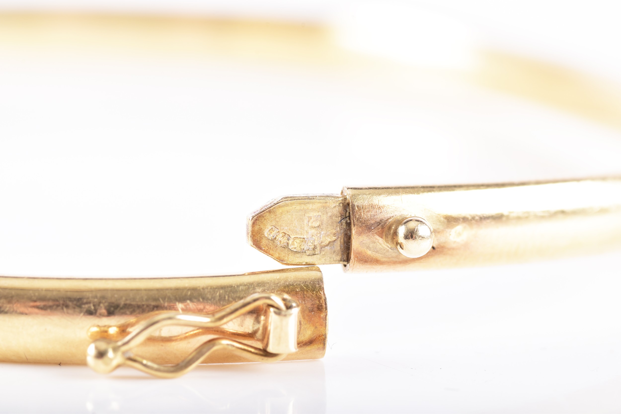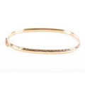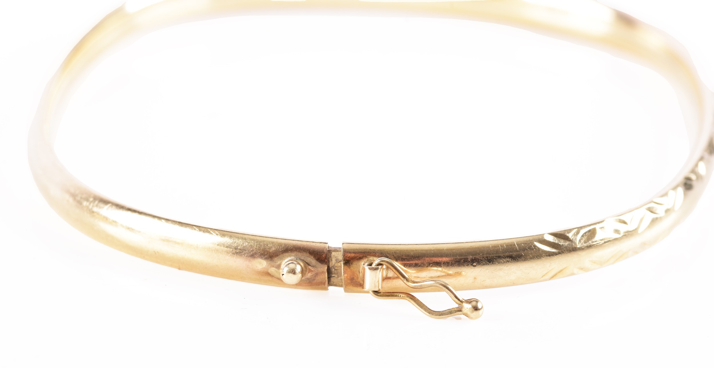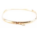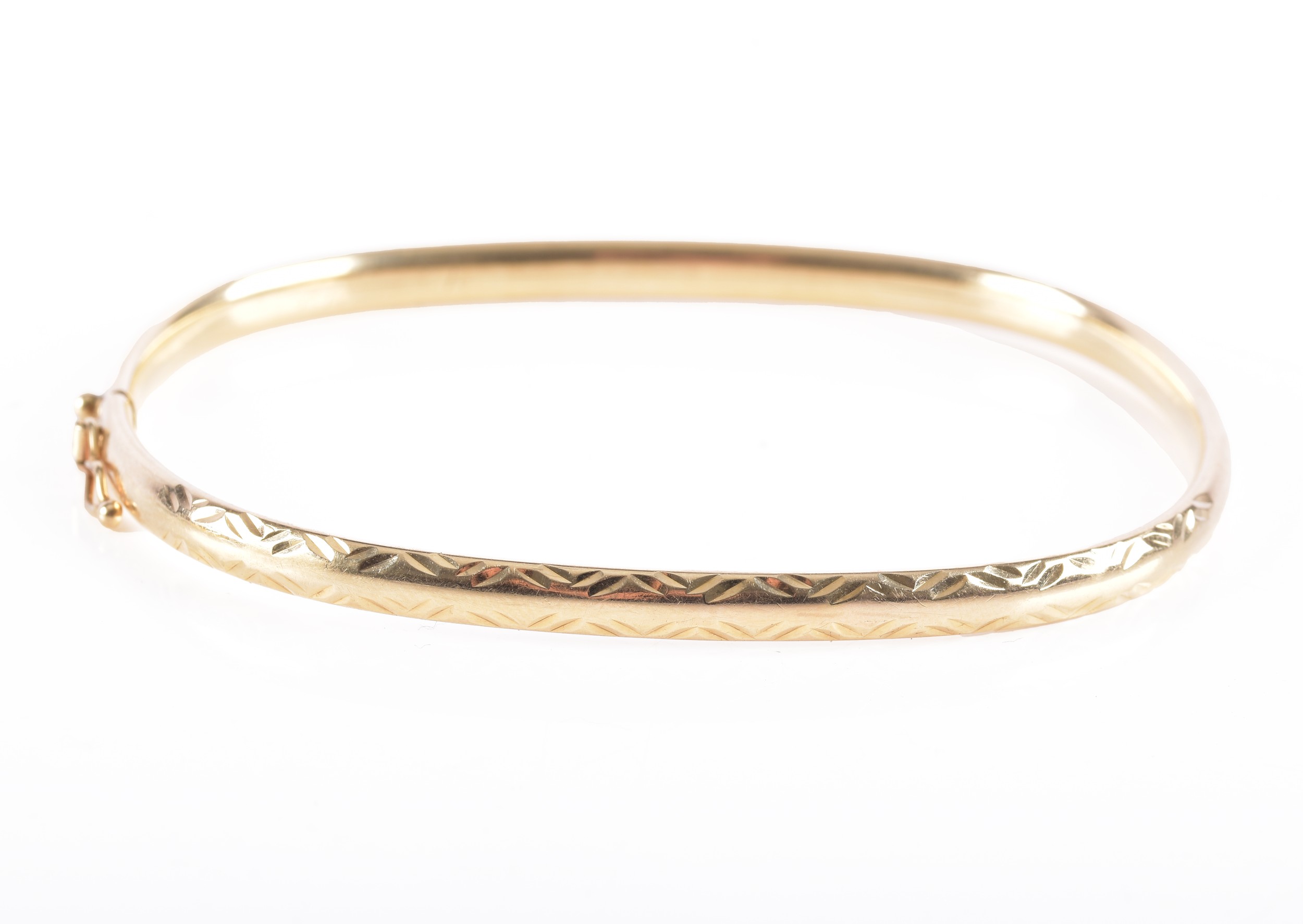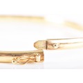 A 9ct yellow gold bangle, featuring engraved detail, approximately 6cm diameter, fitted with safety latch.